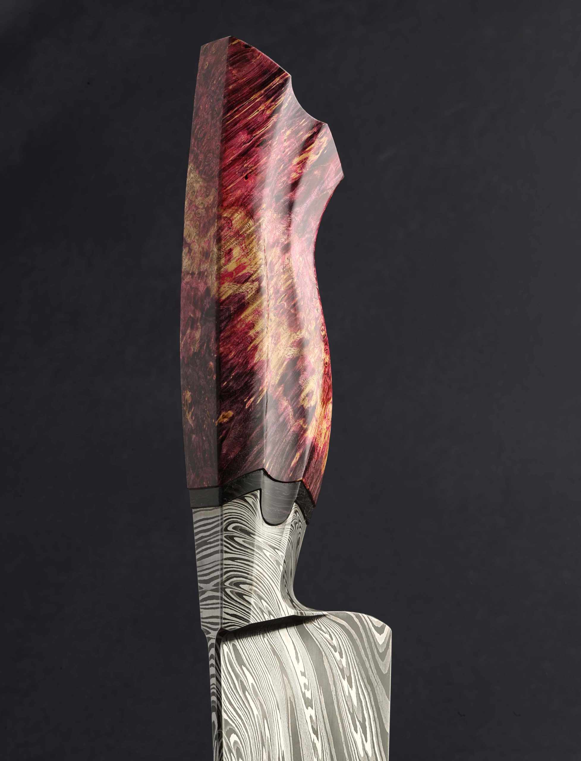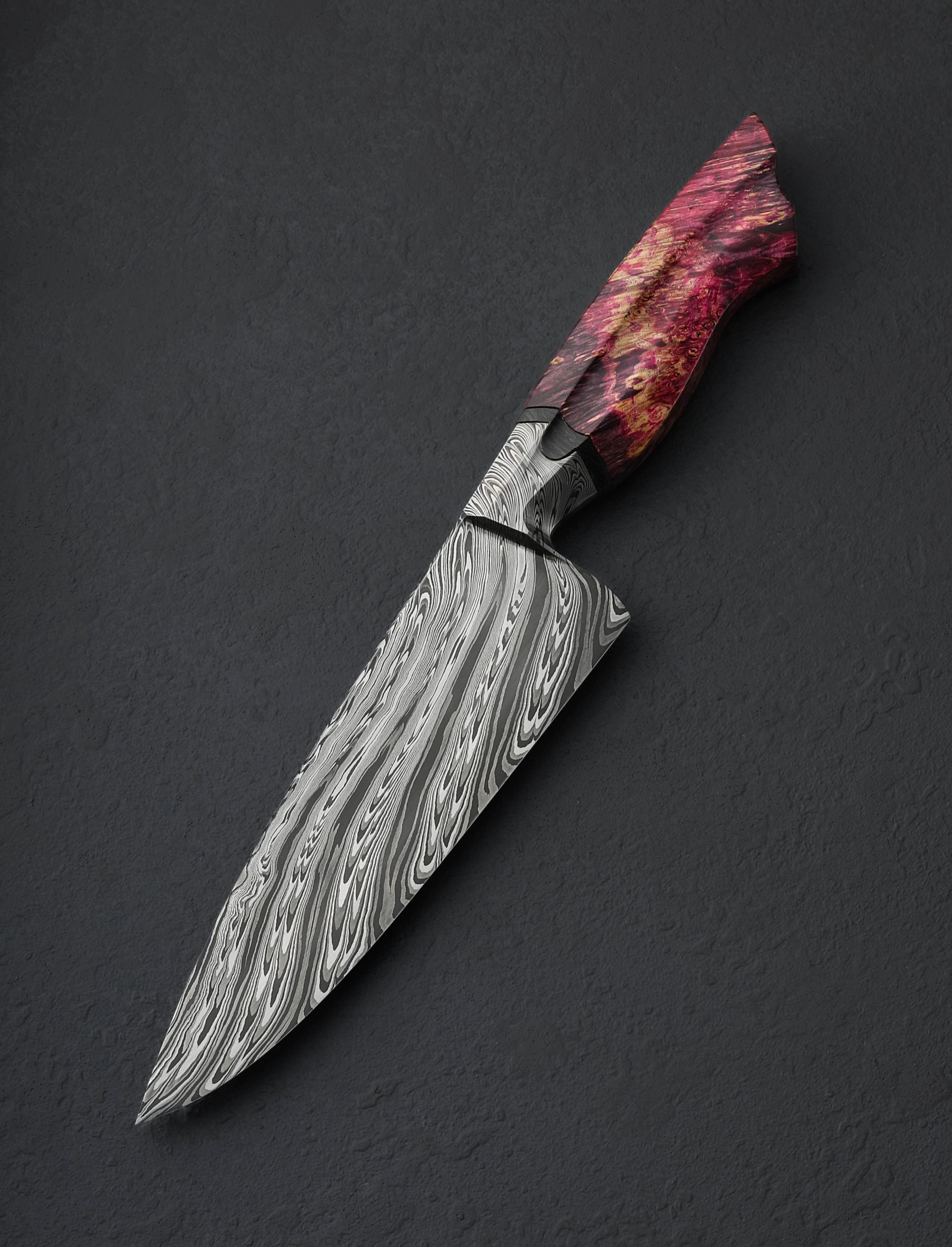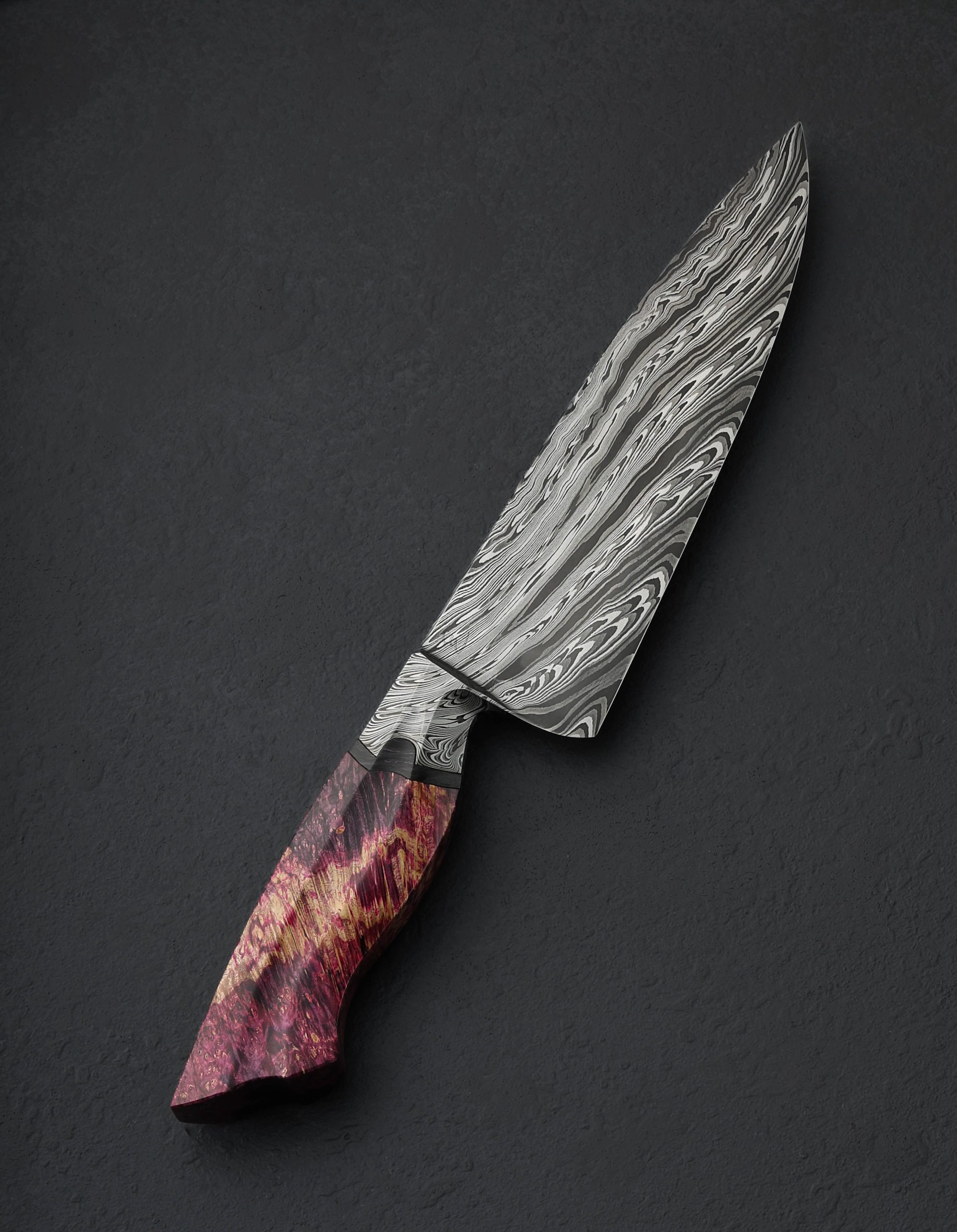 For his latest trick, crafting yet another extraordinary, one-of-a-kind chef knife with unique style as captivating as its utility on the cutting board, this is Cascade by Charlie Ellis. At his former studio in the Blue Ridge Mountains of North Carolina, Charlie combined three distinct carbon steel alloys, 1084, 8670, and 15n20 to create a striking, three-tone damascus pattern that seems to cascade over the edges of the integral bolster, down the length of the blade, and out through the tip. As impressive as the damascus itself is the function-first geometry of the tool it forms: Charlie’s compound ‘S-grind’ bevel geometry is well-loved and always meticulous, the concave portion beginning just in from the blade’s choil and then dissipating gently as it nears the tip, all above a superbly shaped convex stretch that culminates at a very thin, very sharp, near-zero edge. The spine of the blade, with its three-faced faceted profile, tapers steadily forward to a fine, pointed tip while maintaining rigidity throughout. Exceptional fit-and-finish describes every element of the knife’s comfortable, head-turning handle: a tapered, hand-forged integral damascus bolster hugs a carved spacer of ‘Dark Matter’ purple-infused carbon fiber with then meets a carved piece of dyed and stabilized box elder burl. Symmetrical fullers, or hollowed-out element along the left and right faces, extends through all three handle elements. On the rear face is a flush ‘Dark Matter’ carbon fiber retention bolt end cap.