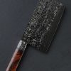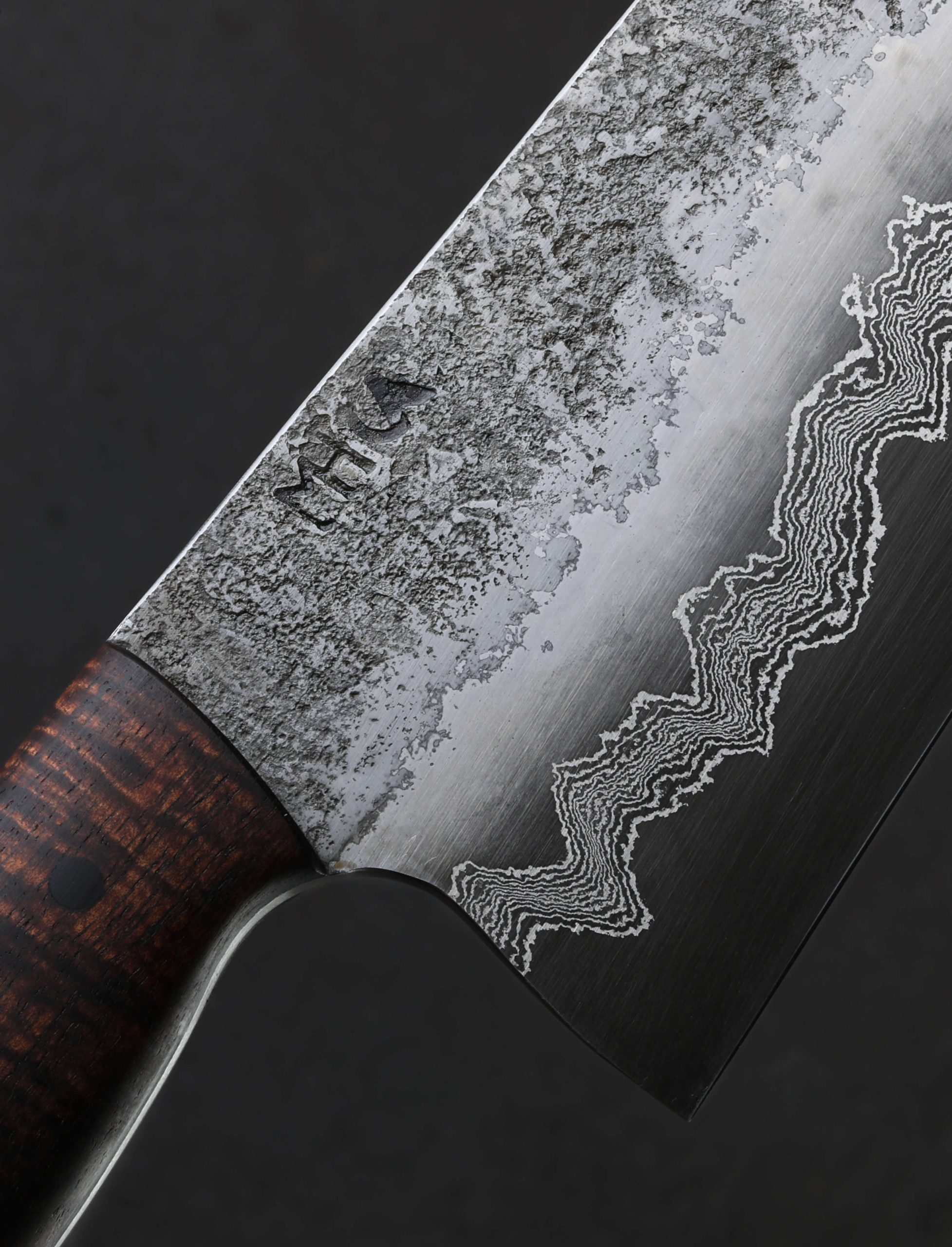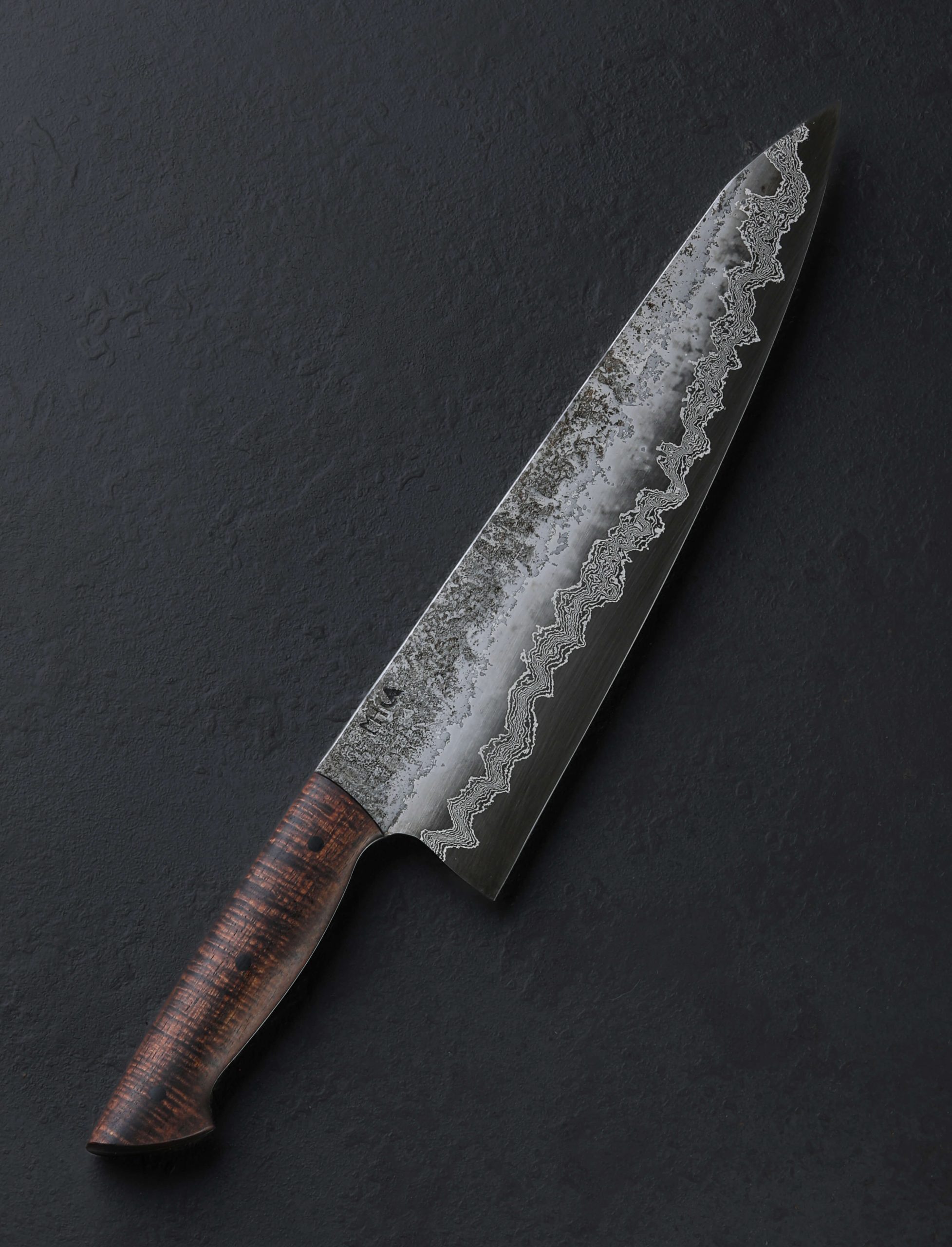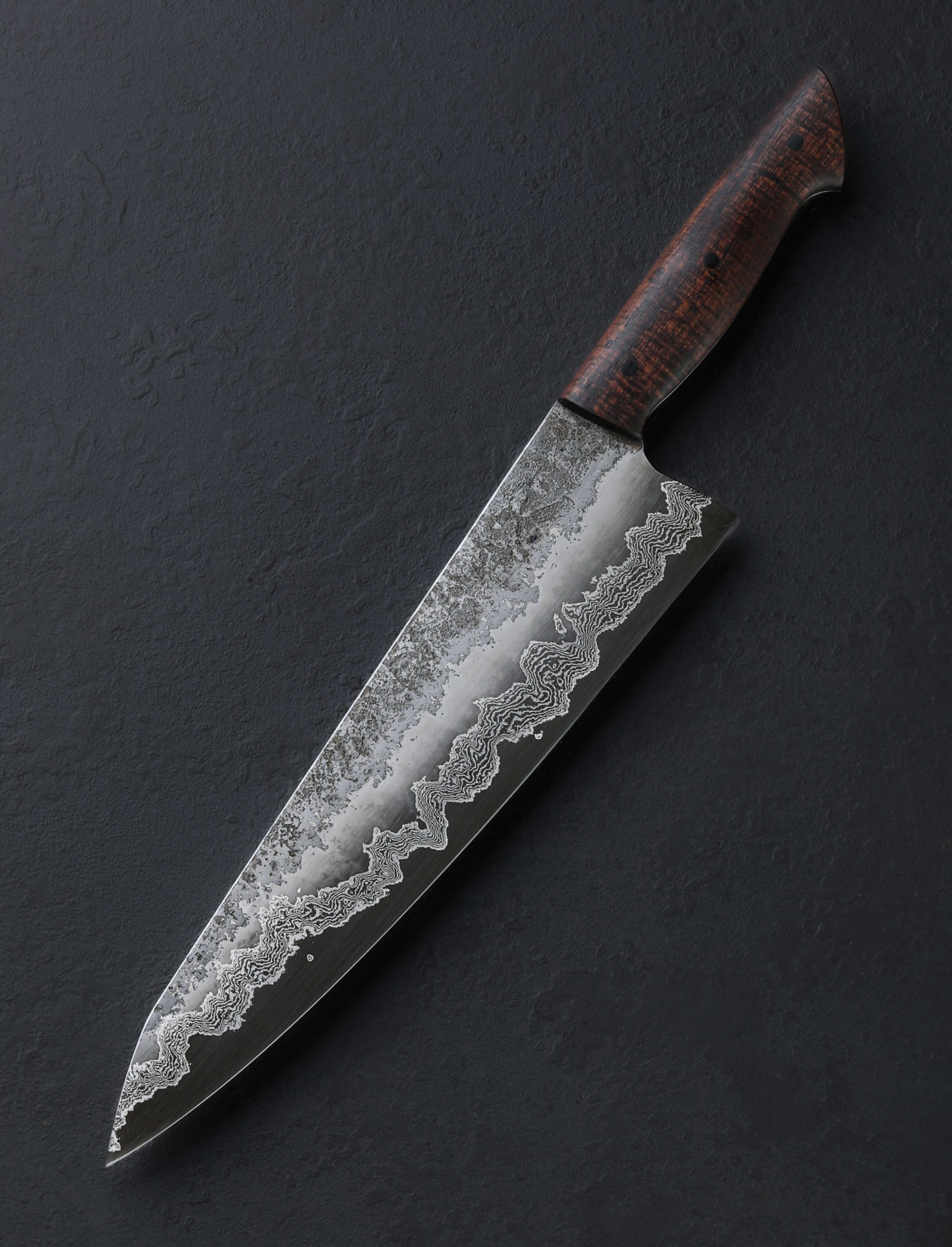A cascade of damascus, thirty layers of pure nickel and 02 carbon steel to be precise, race along the bevels of this workhorse chef’s knife by Martin Huber. Sandwiched between outer cladding of pure 02 with its combination of hand-sanded satin finish giving way to a rough, hand-hewn forged finish at the flats, and the blade’s 1.2419 high-carbon steel core that forms the 248mm / 9.8″ edge, the river of damascus is icing on the cake. Shaped to become any chef’s go-to daily cutter for jobs large and small, tough and delicate, its the blade’s geometry and technical attributes that shine in the kitchen. Symmetrical, convex bevels slims downward to a quite thin, hard, and razor-sharp edge. At the rear where the knife stands 60mm off of the cutting board the blade delivers the mass needed for big cuts and chopping tasks. Maintaining its strength and exhibiting only a slight degree of lateral flexibility, the blade spine tapers steadily from around 3.3mm to just 1.5mm an inch from the tip where it then begins to slim more aggressively before reaching an extremely fine, needle-like tip at which point, and just behind which, the geometry is precisely honed and perfect for slicing and detail work. Balancing just over an inch in front of the handle, ideal for a workhorse of this size, the knife is steady yet nimble and quick in the hand. To help achieve this purposeful mass distribution, Martin has tapered the blade’s tang toward the rear of the full-tang construction handle where it is jacketed first by liners of black micarta, and then the ergonomic, comfortable, and beautiful pieces of koa wood which are secured by three black micarta pins.