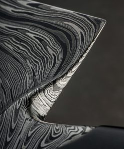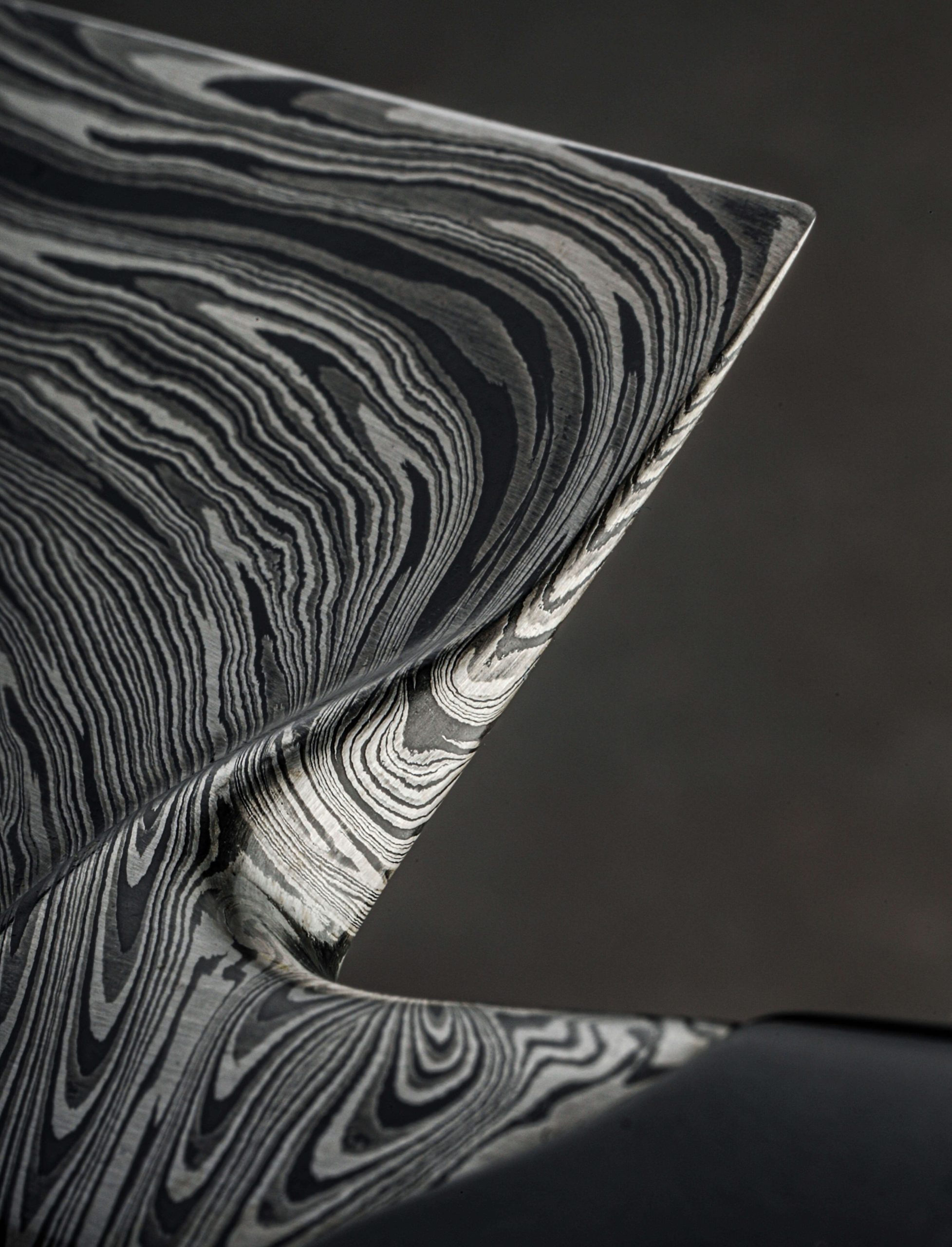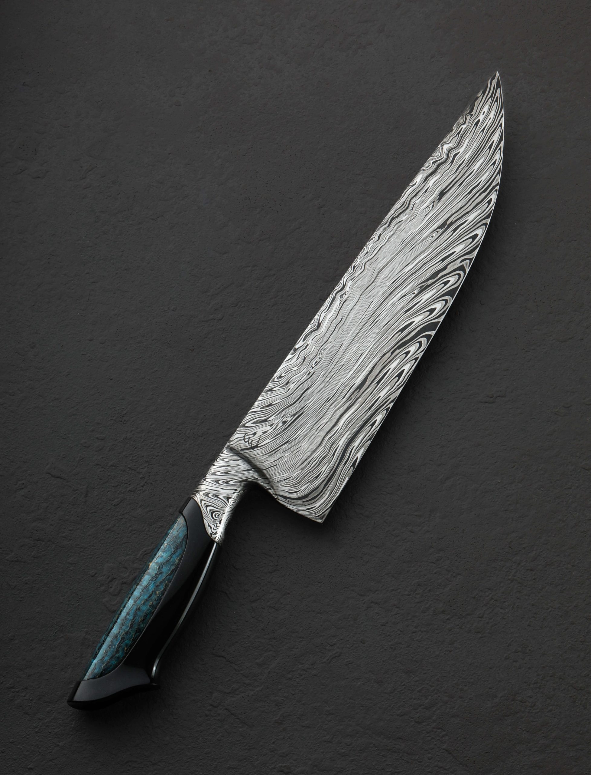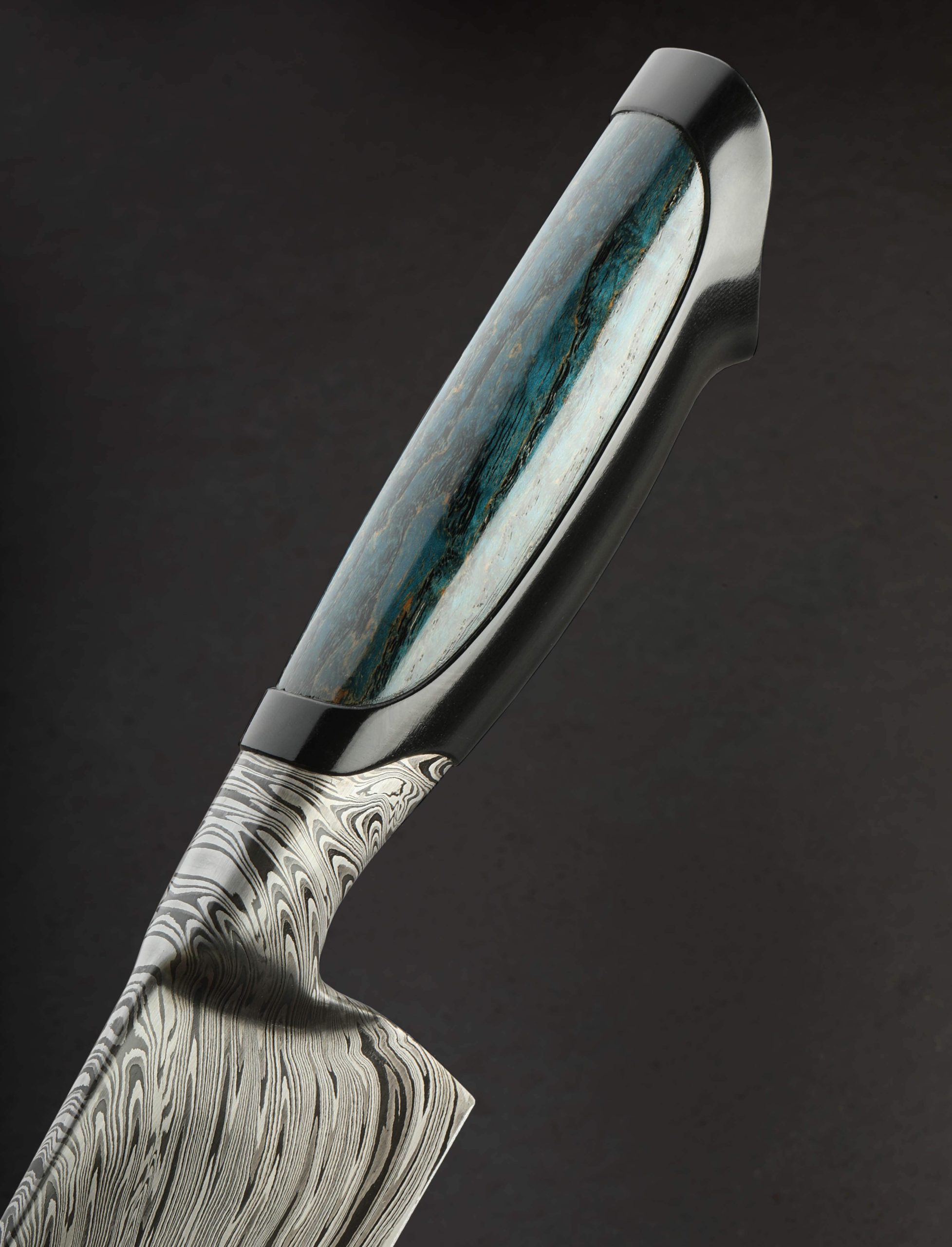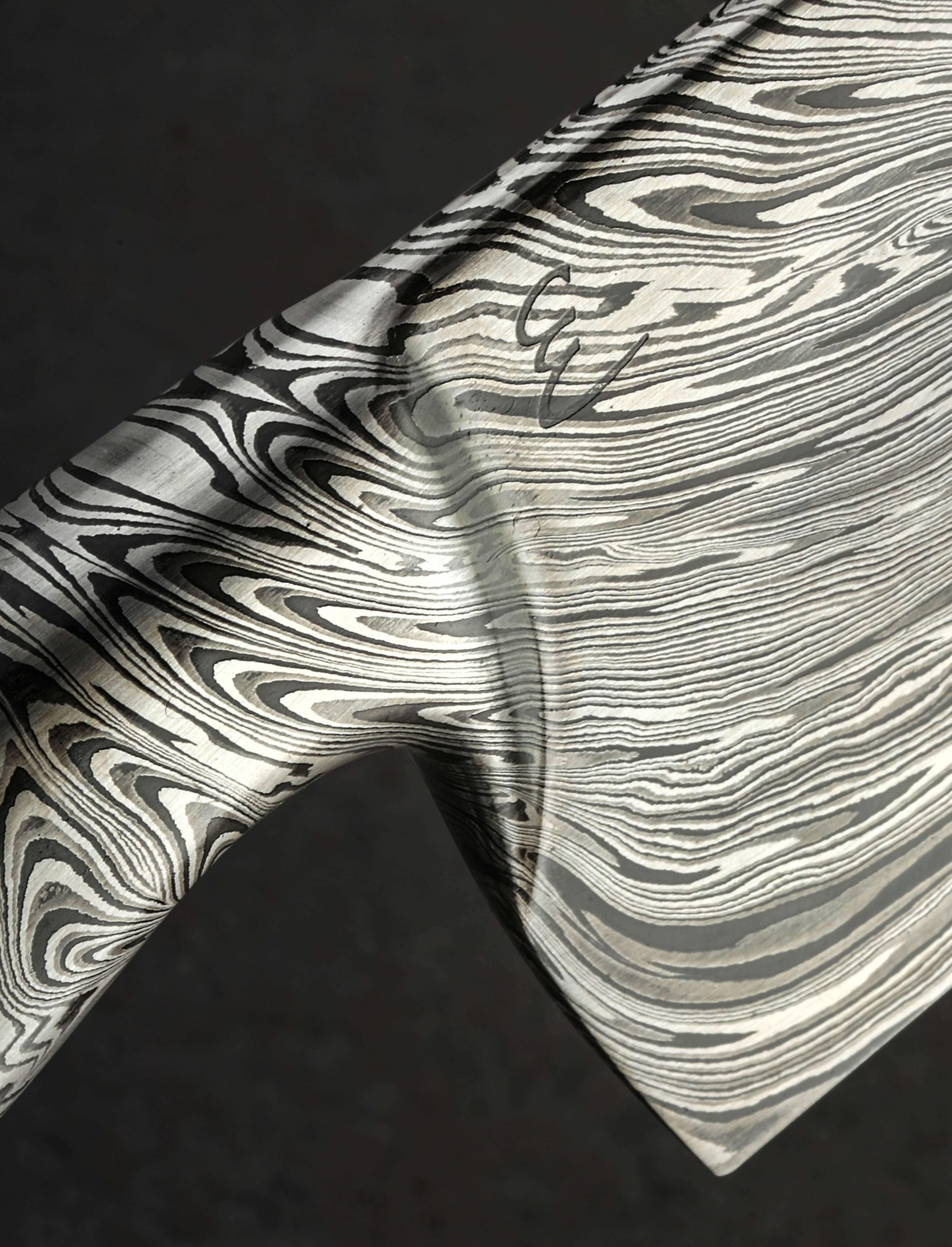 With over thirteen inches of pure artistic beauty and unbridled functionality comes the newest one-of-a-kind kitchen knife from maker Charlie Ellis of Indiana. This stunning work of contemporary art is hand forged of house-made, triple-alloy damascus steel to create a three-tone pattern that cascades from the voluptuous integral handle bolster to the blade’s needle-like tip. A master of compound bevels, Charlie first forges the blade to shape, then gives each side of the symmetrical profile his superb ‘S-grind’ geometry that includes silky, nearly unnoticeable transitions from flat, to concave, to convex sections, altogether resulting in precise details focused squarely on cutting performance and food release. The rounded spine of the blade has a steady taper to a sharp and thin tip made to excel at precision slicing and detail work, making this knife powerful and capable of the toughest cuts, without sacrificing finesse and sophistication. Just in front of the the blade-to-bolster transition is the knife’s balance point, giving it a nimble, steady feel on the cutting board. For comfort and control, Charlie expertly moves metal with fire and pressure to finish the handle bolster in a way that shows the damascus pattern in a new and mesmerizing light. Damascus steel then gives way, with stepped, museum fit-up, to a sculpted piece of black Richlite that frames a striking piece of quilted ash. A matching piece of quilted ash caps the handle’s hidden retention bolt at the handle’s carved rear face. Outstanding and innovative work from one of the best.