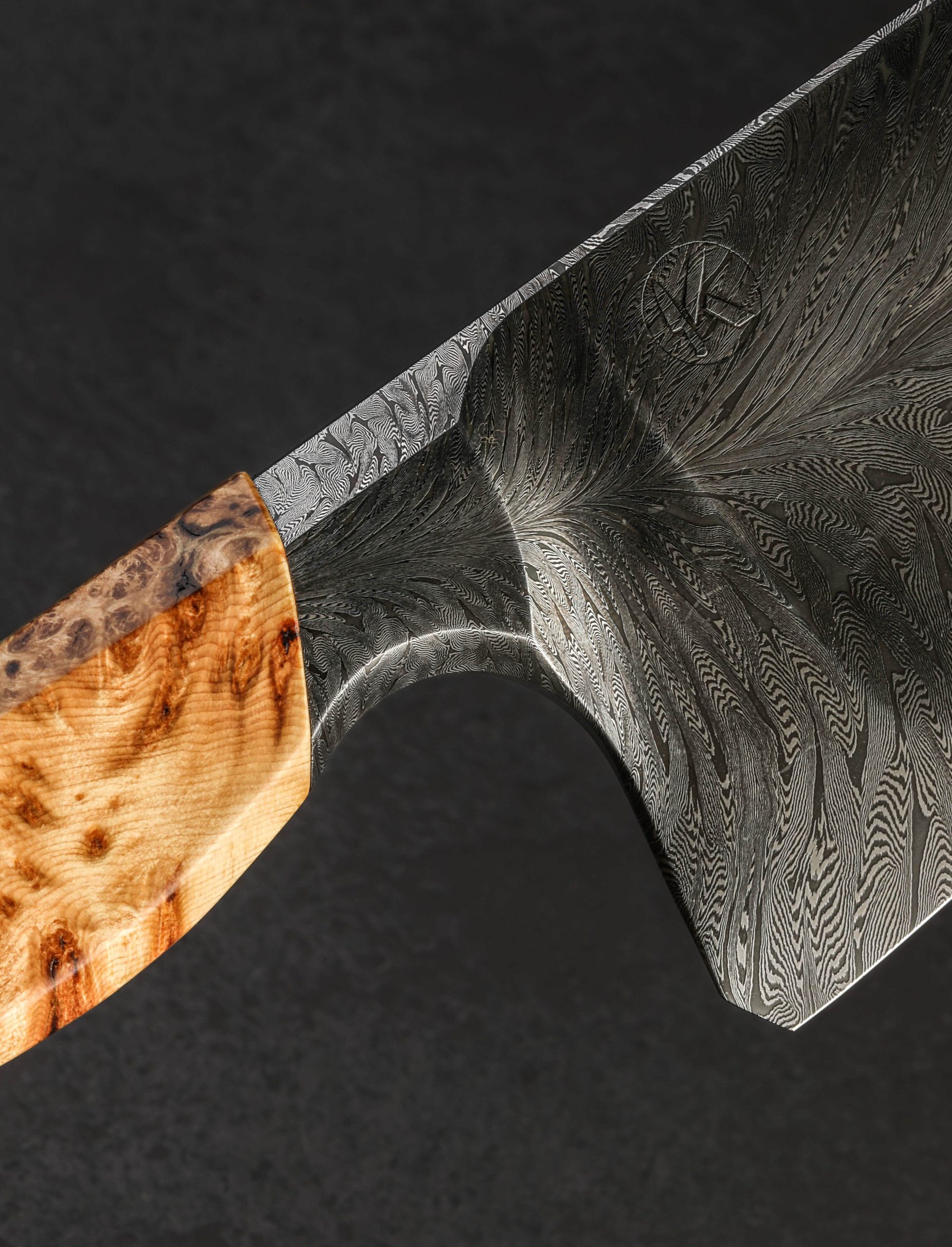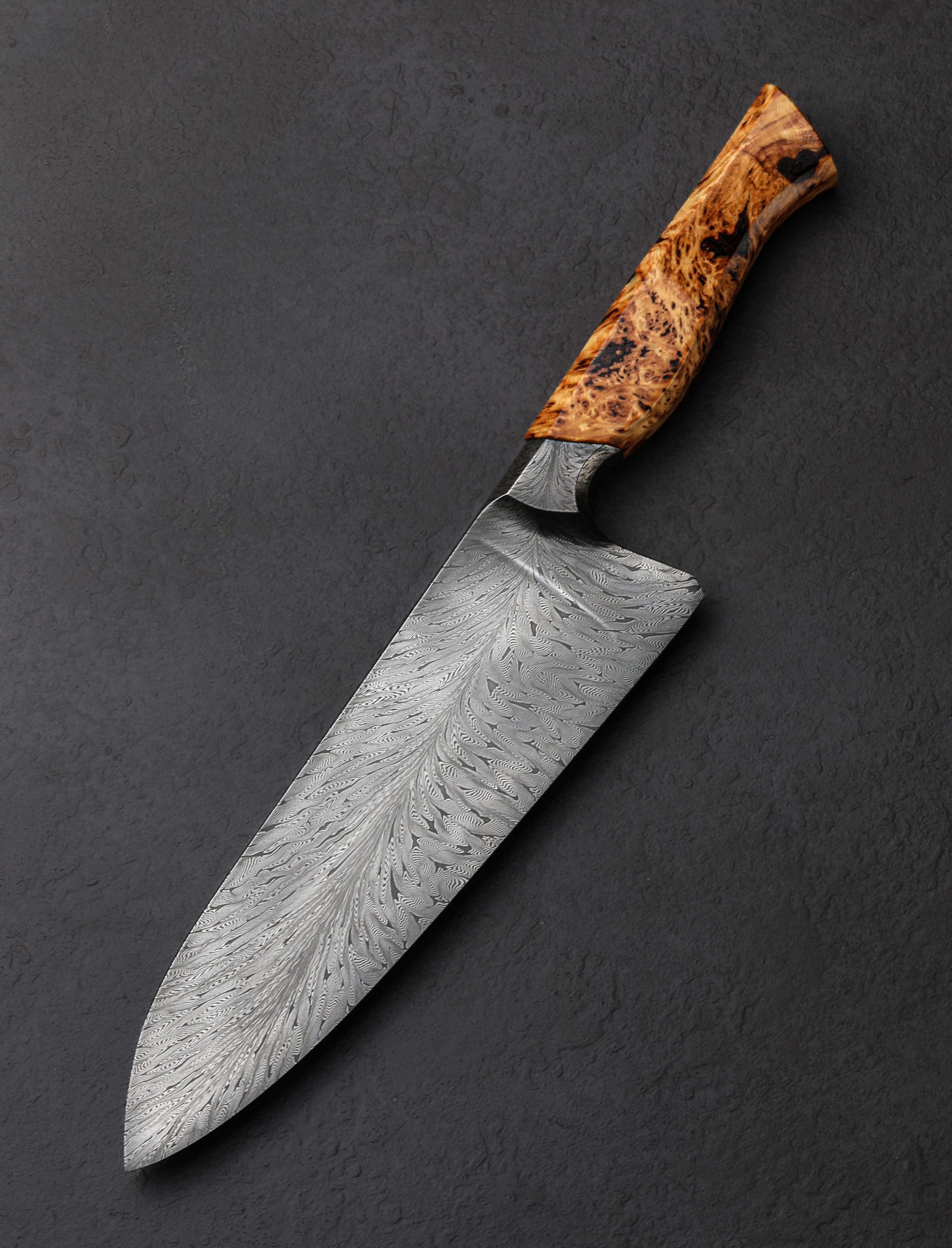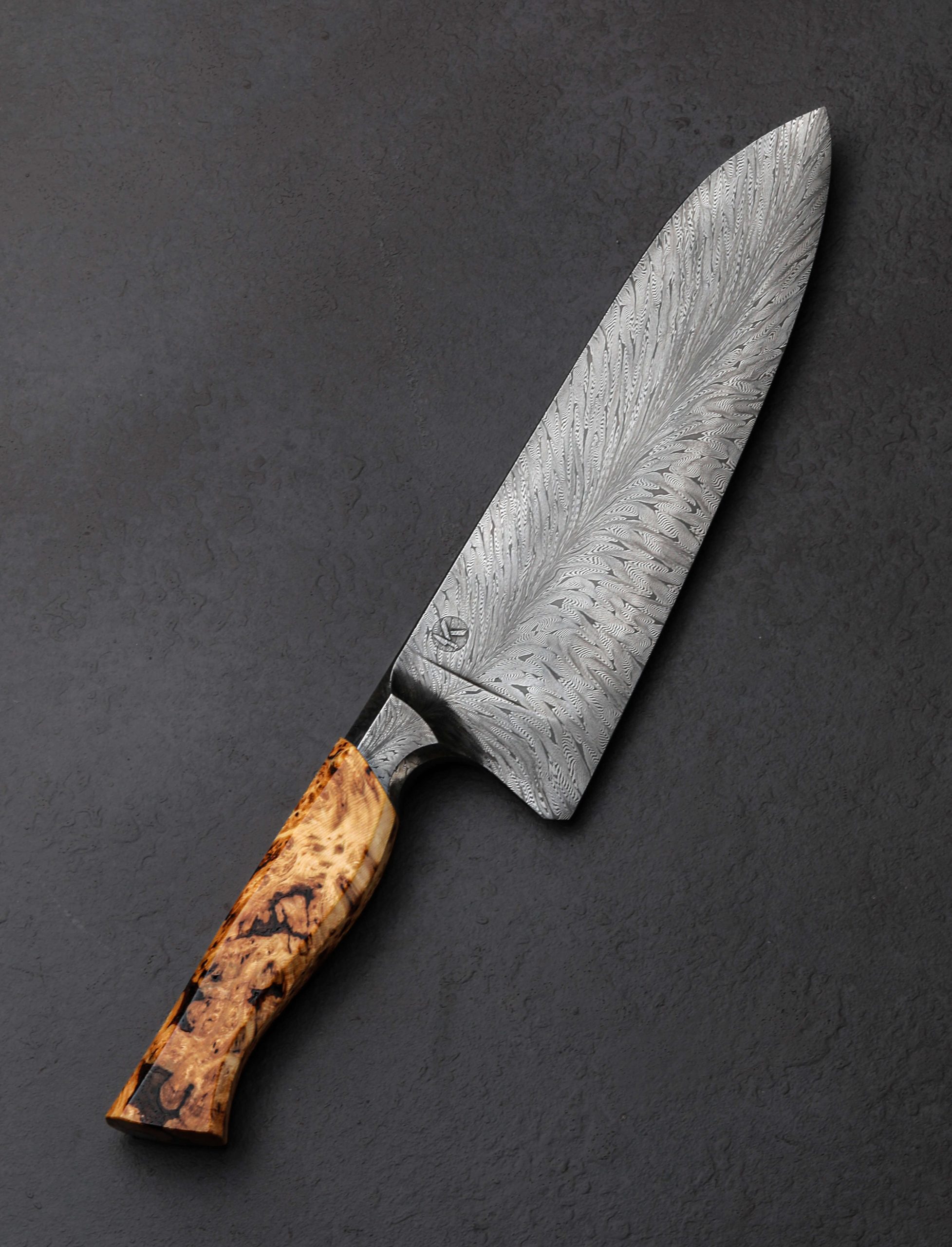 His formal training as an engineer, highlighted by both practical and theoretical studies in metallurgy, and his passion for food and the role that cooking for our loved ones plays in our lives, combine and manifest in each of Jeroen Knippenberg’s heirloom culinary creations. That confluence is as beautifully evident as ever in this first chef knife to grace our collection. At his studio near Weert, The Netherlands, Jeroen begins the build of this versatile, do-all 215mm / 8.5″ chef knife by making the stunning, feathered damascus steel used for the blade. Combining 1.2842 and 15n20 high-carbon alloys, he folds and forges the materials to create a dense, detailed, and repeating pattern which he then ‘feathers’ to create the flowing aesthetic witnessed through the striking blade and integral handle bolster. With the finished material in place, the blade is shaped for balance and daily meal prep, its center of mass lying half an inch in front of the blade’s 63mm tall heel, providing a weighted yet quick and nimble feel in the hand. Tough and rigid at the rear where a long, straight section of edge allows for effortless chopping whether push-pull cutting in the pinch grip or rocking while the tip remains in contact with the board, the geometry is dynamic and refined. Compound ‘S-grind’ bevels, the concave portion of which begins just up from the choil and tapers out gently and purposefully as the tip approaches, offer cutting performance and food release. The lower, convex portion of those primary bevels culminates at a thin and very sharp edge hardened to approximately 60 HRC. The blade’s spine, faceted along the edges for comfort, tapers distally and steadily from the bolster forward to a slim, needle-like tip. For precise slices of delicate proteins or hours of vegetable chopping, the blade is designed to become any chef’s kitchen workhorse. Sculpted with striking lines that combine flat faces and curved edges and transitions, the bolster not only presents the damascus pattern’s complexity in a distinct light, it provides comfort in any grip as well as visual continuity between blade and handle, an attribute associated with Jeroen’s approach to design. Completing the handle, with stepped, heirloom fit-up between metal and wood, is a piece of ergonomically carved cedar burl with all of its spectacular, natural grain. At the rear, a flush, stainless steel retention nut cap is visible, signifying the hidden presence of the mechanical retention bolt construction within the handle.