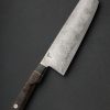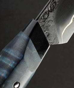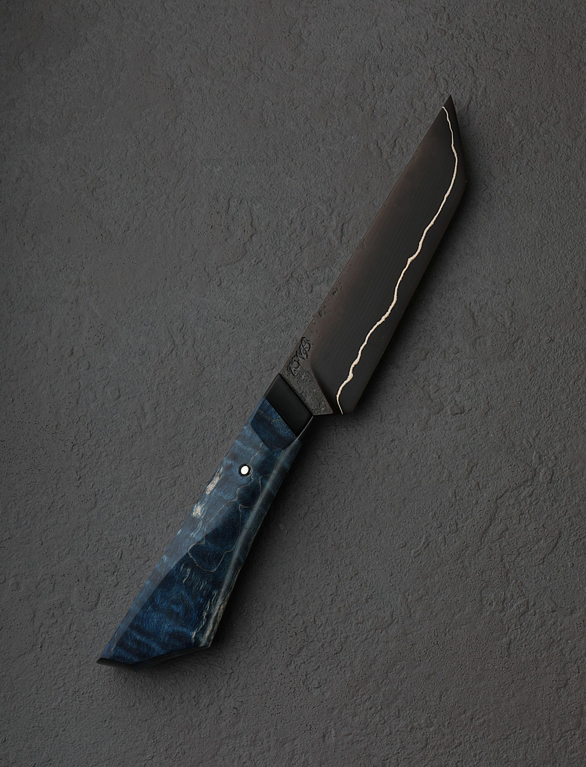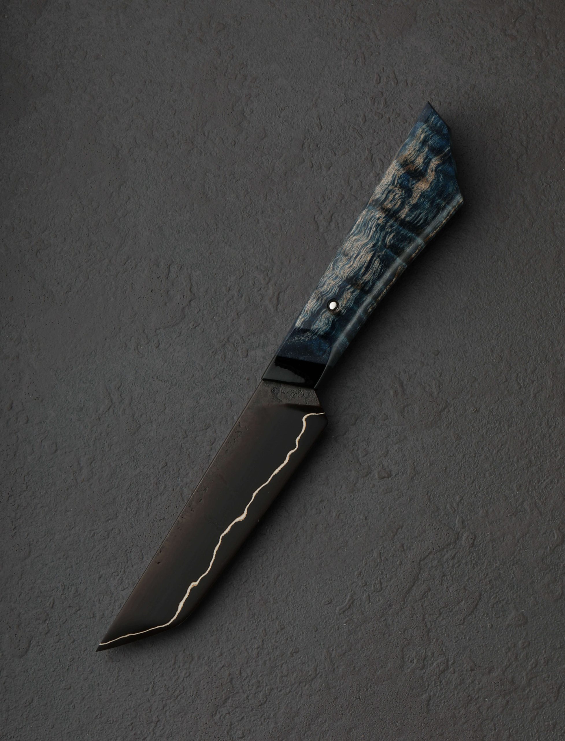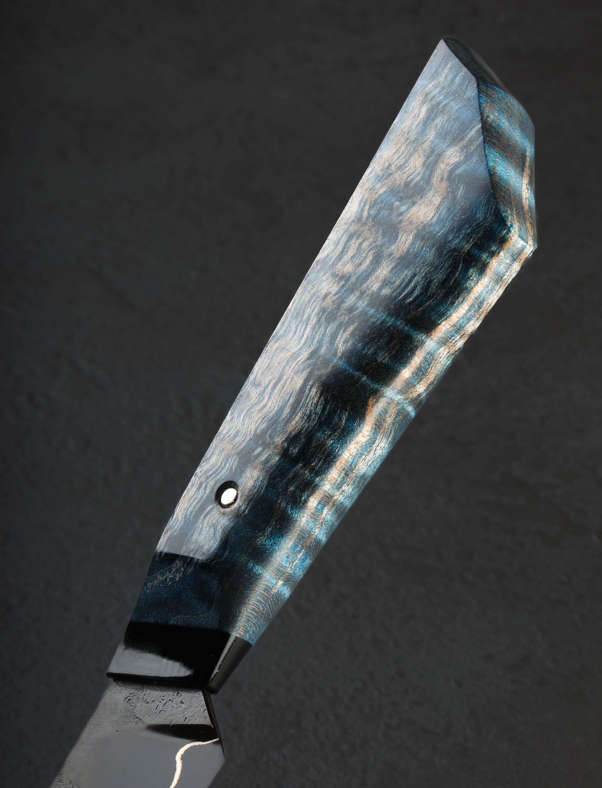 With a sakimaru style tip, often referred to as a tanto, a thin, razor-sharp edge of 80Crv2 carbon steel, and a vein of nickel jacketed by two slim layers of pure copper, Korben Bloomfield crafts a stunning, versatile, and unique blade for the chef’s kitchen. Forged by hand at his studio in England’s south-east, the housemade cu-mai steel bears the marks of its hand-hammered origins along the spine and tang, with convex bevel geometry and a fine, pointed, yet tough tip providing unlimited utility breakfast, lunch, and dinner. Prep and cook with it, and then take this stunning tool to the dining room and use it at the table to dine to the last bite. For comfort and control in a beautiful, ergonomic, hand-filling form is a handle shaped from dyed and stabilized curly maple secured by an heirloom-fit, domed, and polished steel pin and capped with an elegant ferrule of black micarta. The handle has been designed to allow for removal in the case that care or maintenance are needed.