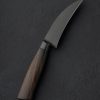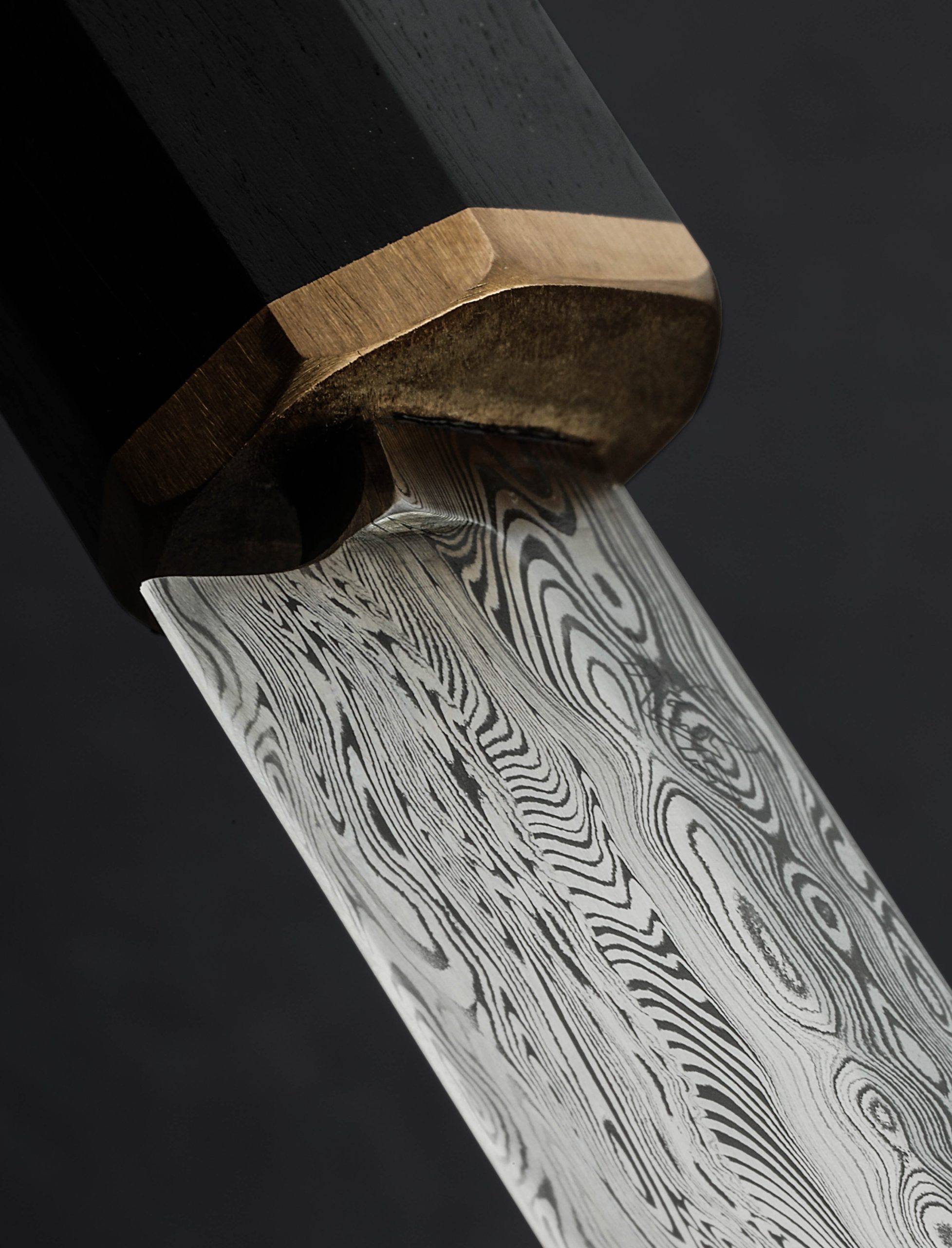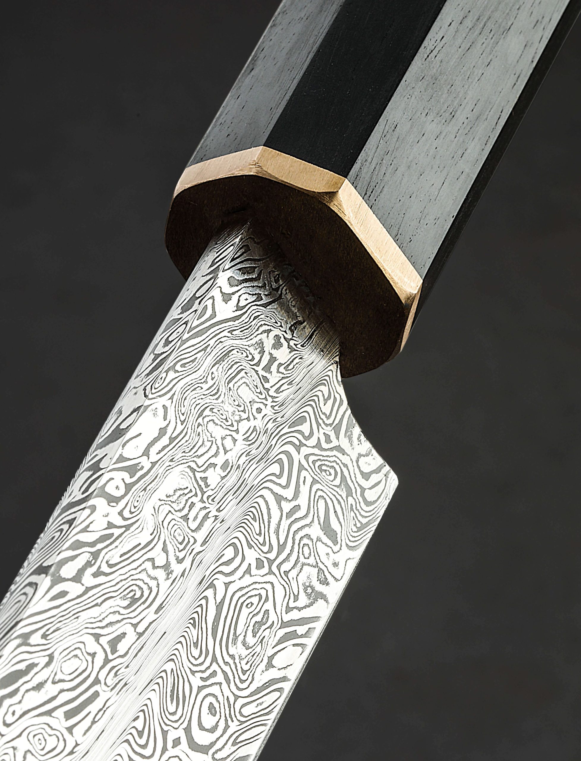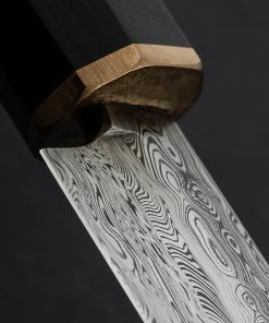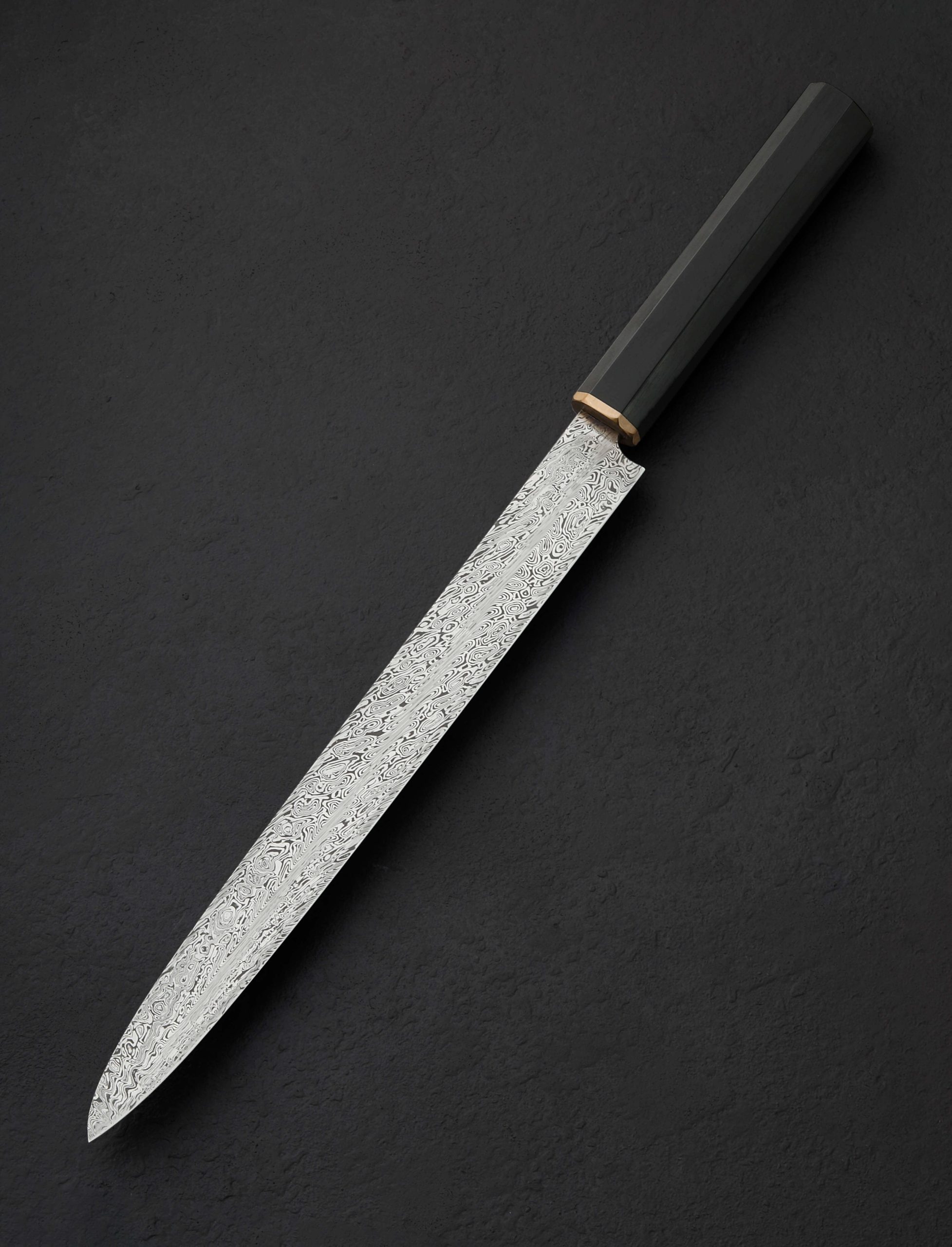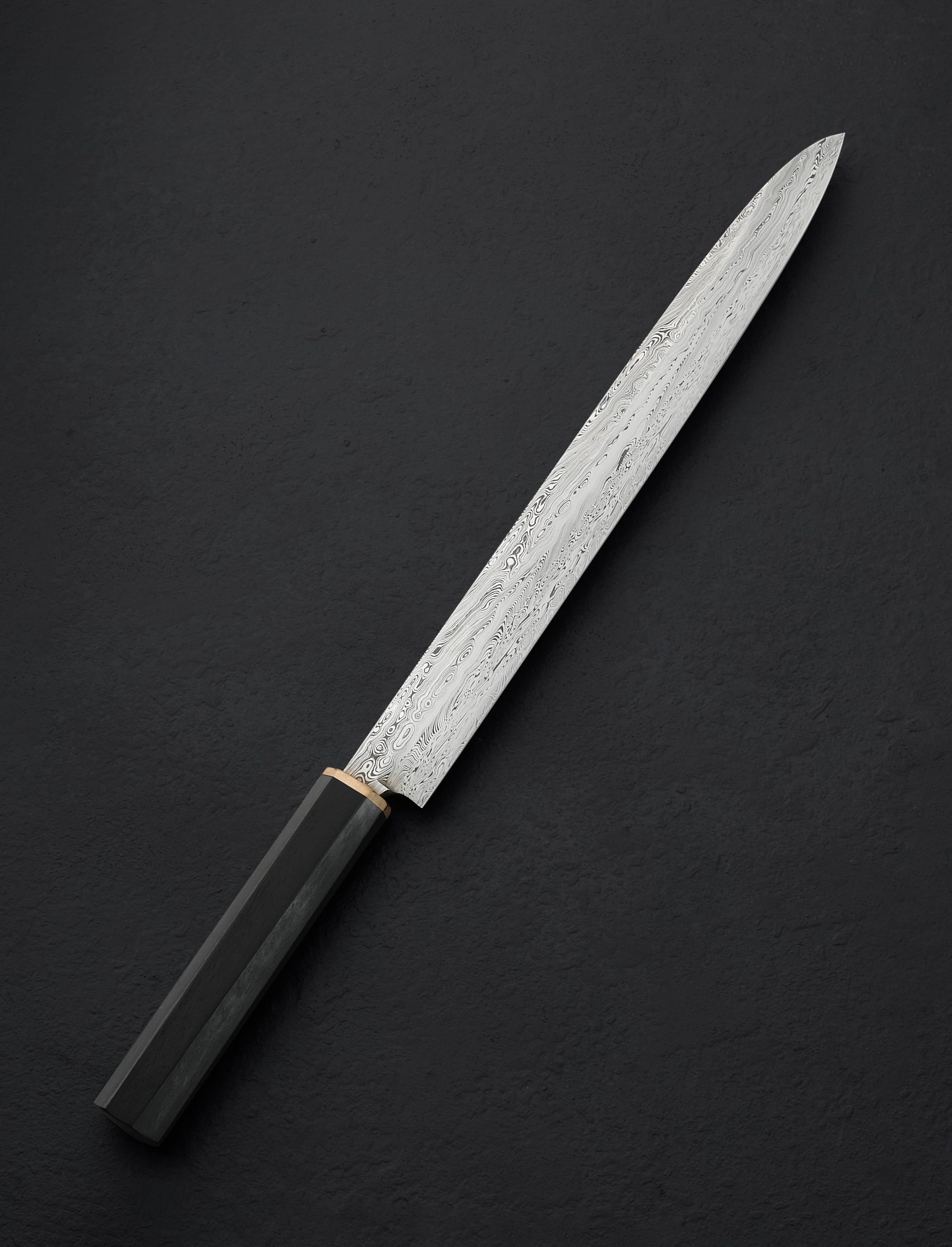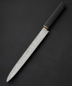 We count on artist Casey Vilensky to innovate and push boundaries with each new creation, and in making the Chameleon Yanagiba he does just that. Employing not one but two distinct patterns of high performance, Swedish-made Damasteel stainless damascus; Heimskringla pattern for the blade’s ura (the concave back side, in this case the left side for a right-handed chef), and Dense Twist pattern forming the omote (the beveled front side), Casey delivers a stunning, single-bevel yanagiba made for the precise and delicate cuts required by sushi and sashimi preparation. The knife’s weight, finely honed geometry, straight, 262mm / 10.3″ razor-sharp edge at a hardness of 62 HRC, and slim, needle-like tip, come together to form a purpose-built tool as functional as it is beautiful. For comfort and control at the cutting board, Casey has dressed this one-of-a-kind object with a traditional, octagonal wa handle carved from Indian Ebony and capped with a solid bronze ferrule.
