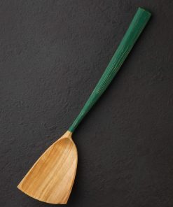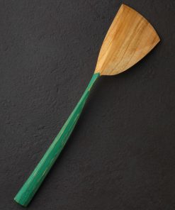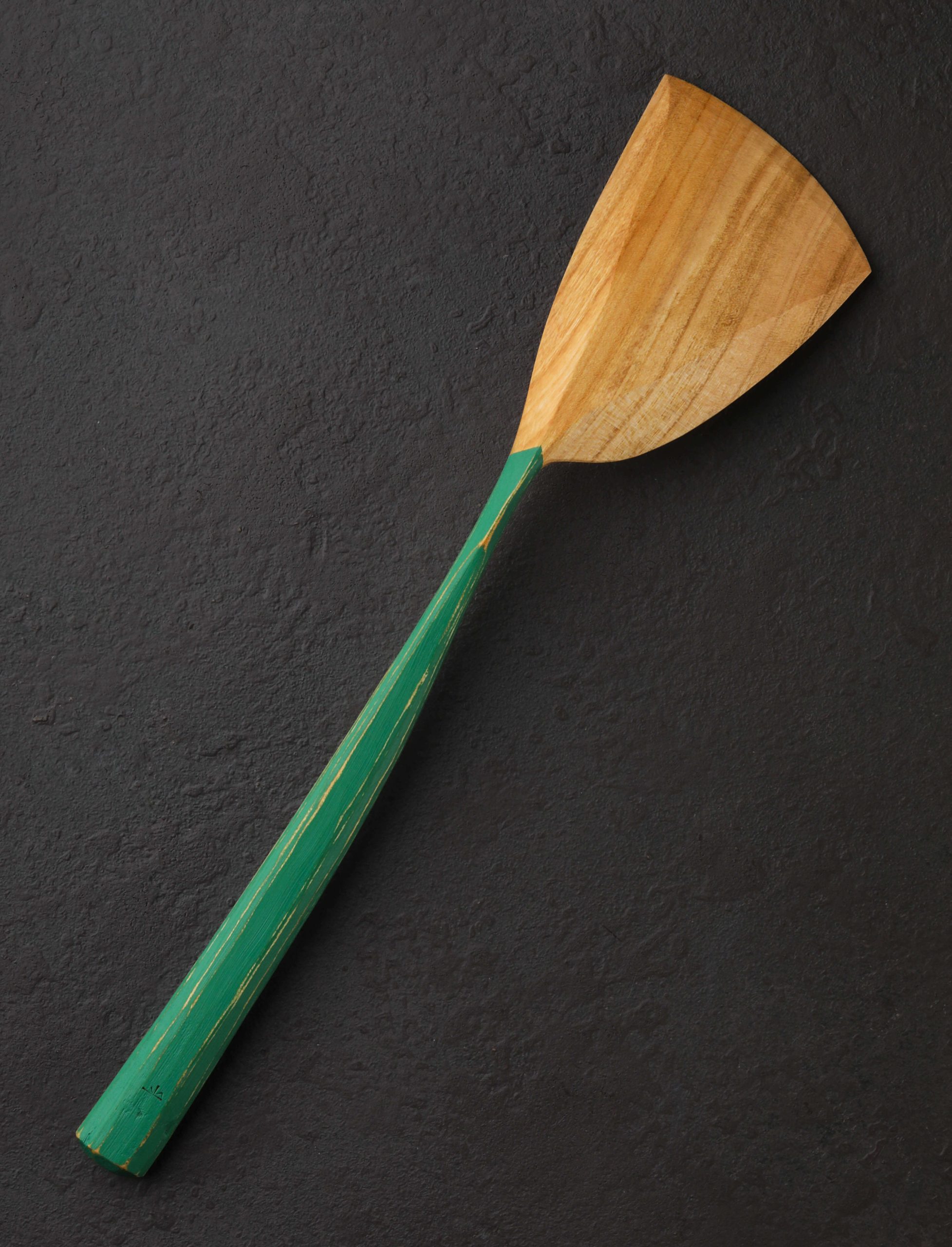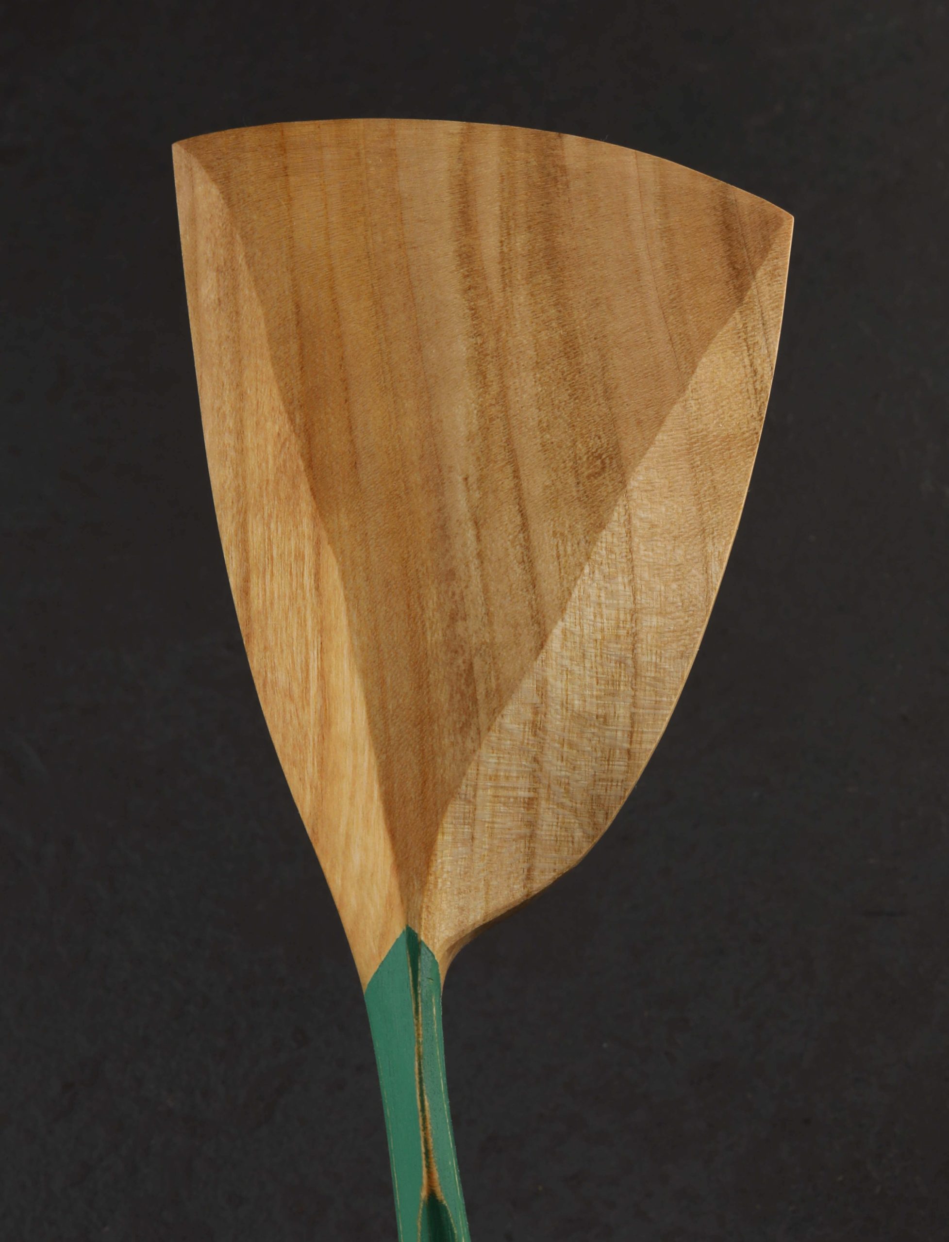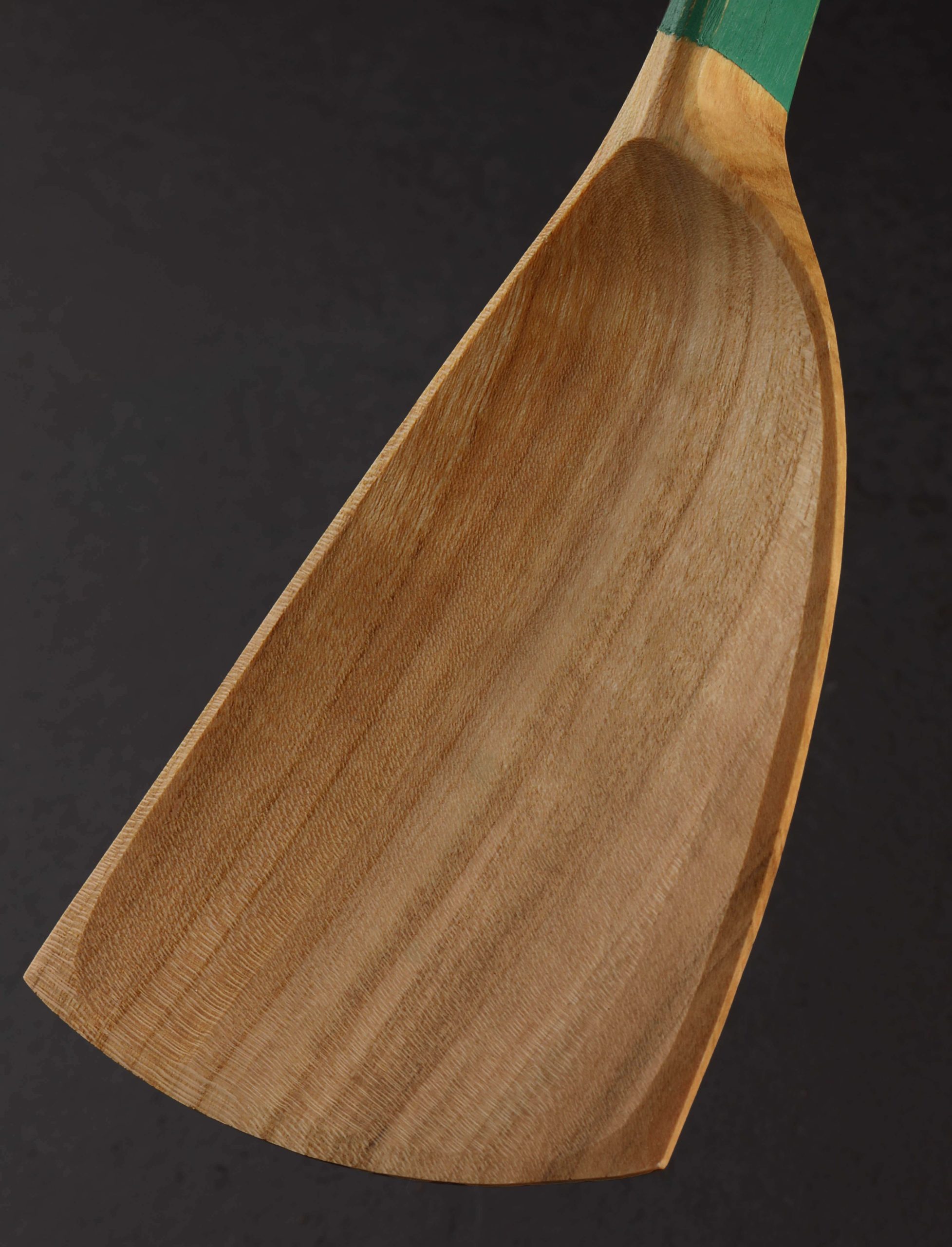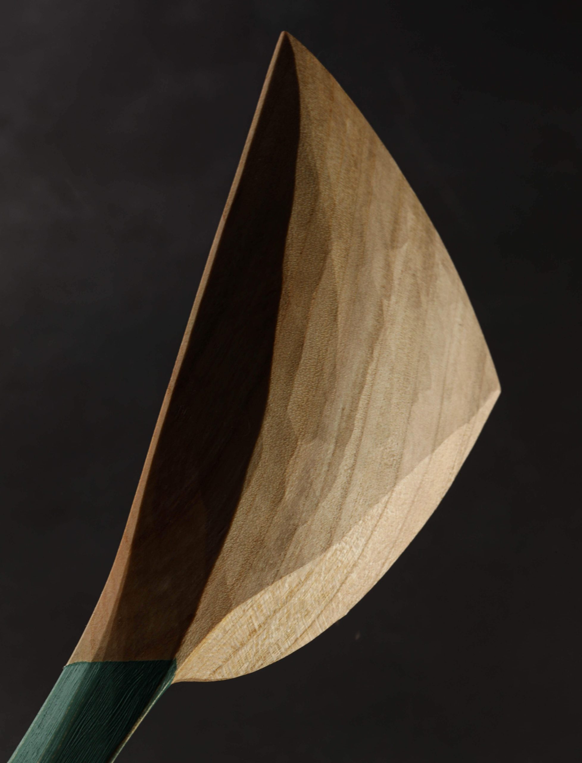 With figure and character, color and wisdom, beautiful cherry is shaped by Austrian wood carver Maximilian Neukäufler to form a limited batch of a design that captivates: the SideWinder. For the kitchen and for the dining room, part spatula, part spoon, the offset head of the design finds endless ways to serve. Sculpted using only hand tools and traditional methods, the handle of each enjoys Max’s painted wabi sabi finish, Max selecting a green for this collection. The marks of the knife’s blade, shaping each line, curve, and transition a stroke at a time are visible throughout each object’s thoughtful details.