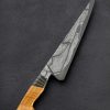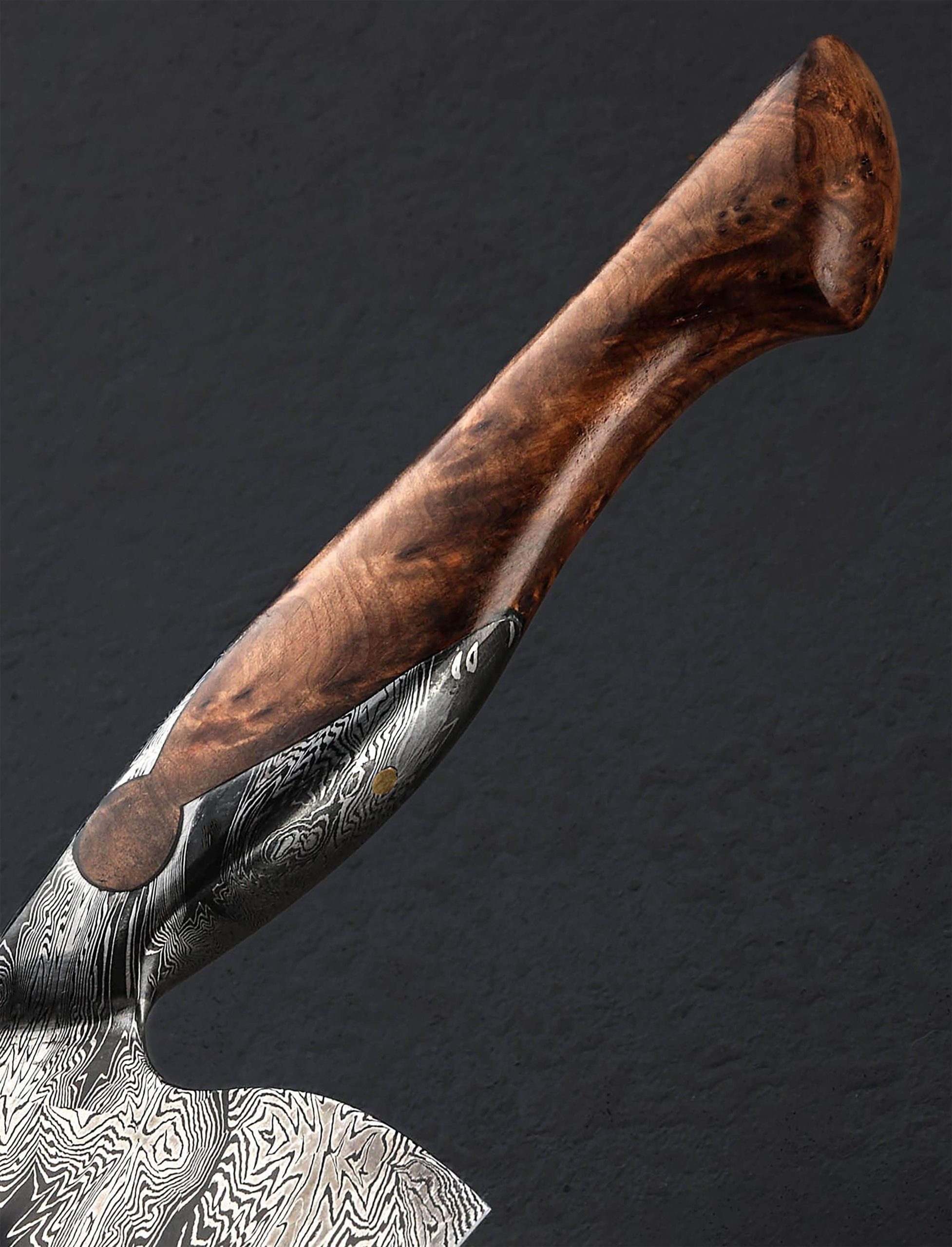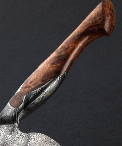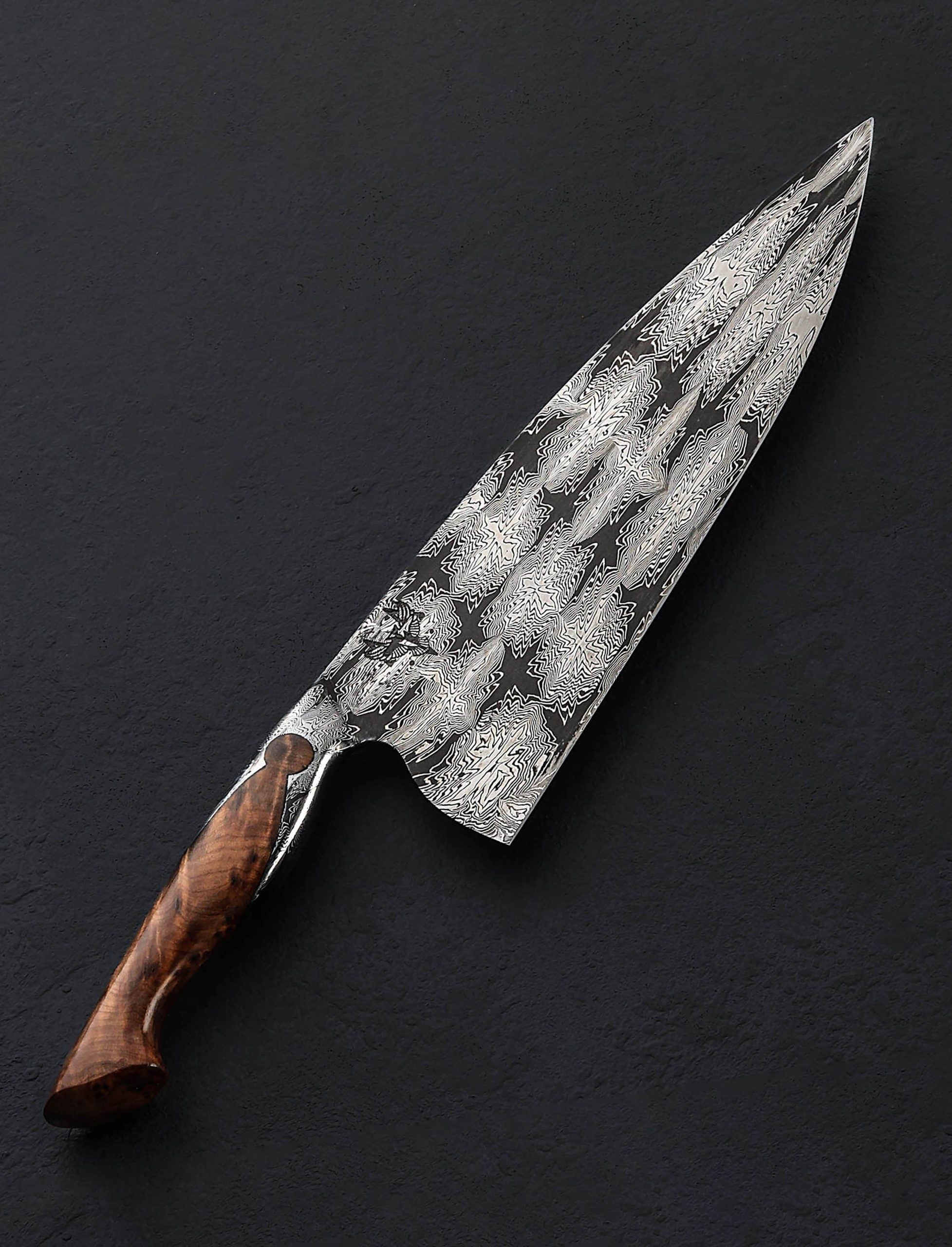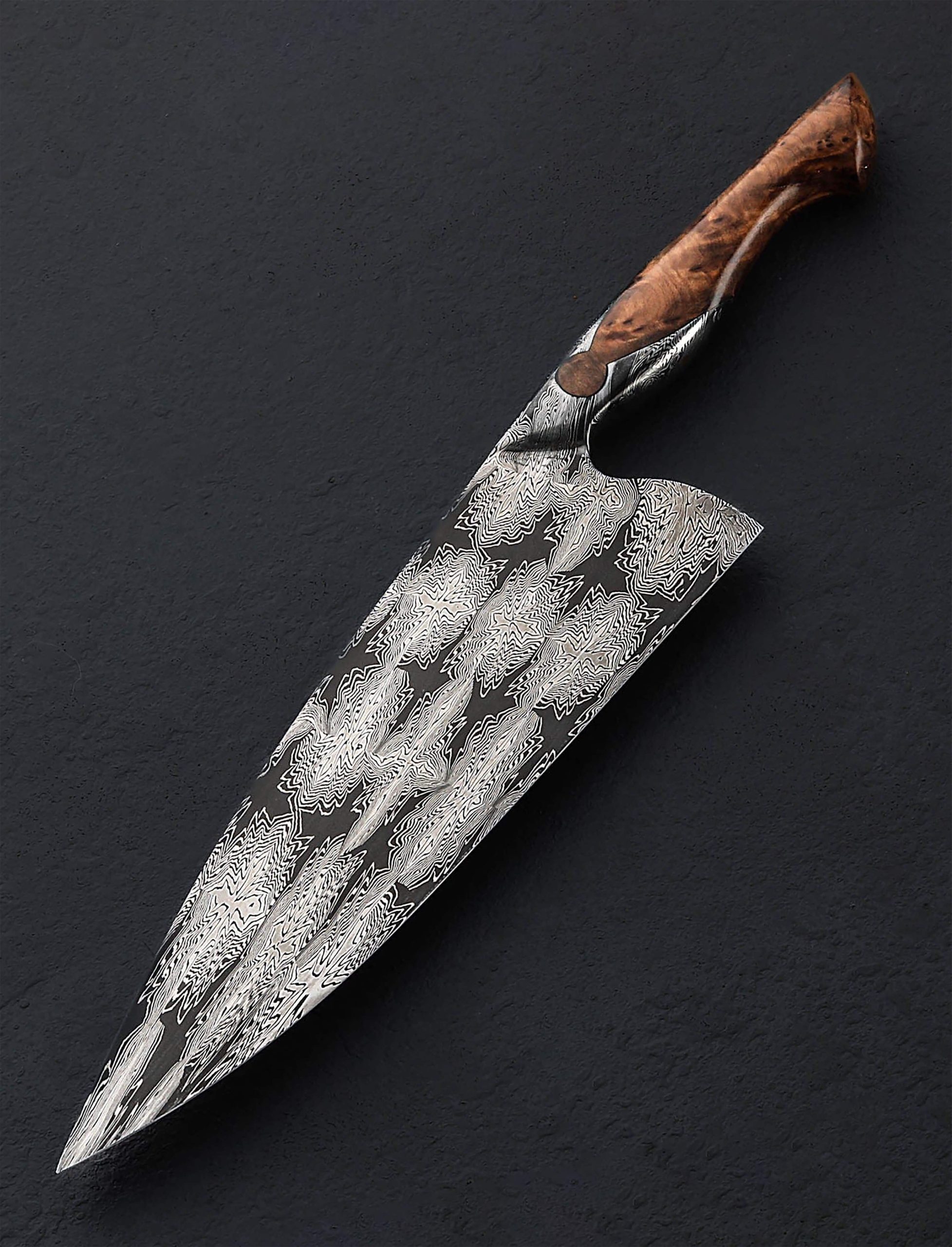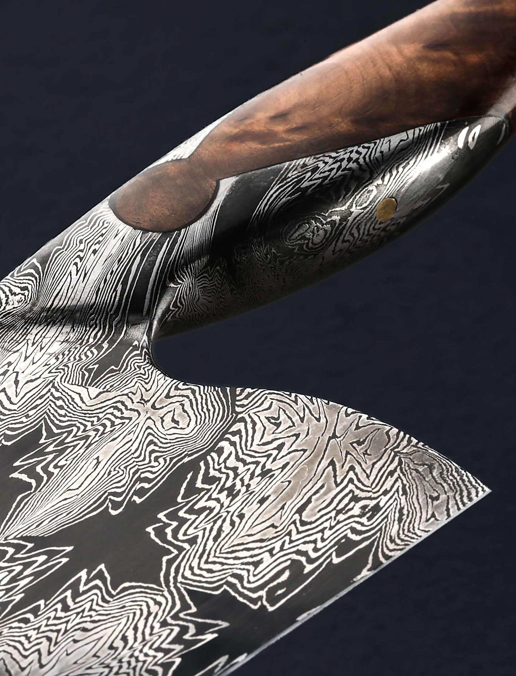 For his debut in our collection, bladesmith and artist Andrés Maldonado knows how to make a splash. Based in Córdoba in the south of Spain, the son of a blacksmith and lifelong metalworker, Andrés has created an exquisite piece of culinary art in this 235mm long by 70mm tall chef knife forged by hand from a house-made damascus pattern of his making, a high-contrast star pattern in 1095 and 15n20 carbon alloys. From a tapering, rounded spine the tall, symmetrical blade bevels slim downward to a thin, beautifully honed edge, hard and razor-sharp, shaped for versatility and cutting pleasure. Convex above an edge that balances finesse and strength to tackle all variety of daily kitchen work, the blade is large enough for the toughest ingredients, providing firmness and rigidity toward the heel with a slight amount of lateral flexibility as the pointed yet sturdy tip is approached. Every bit as beautiful, and functional as the blade, is the knife’s handle with its keyhole construction which sees the same Star damascus pattern, forged from the same piece of steel as the blade, extending back on top and bottom as it wraps around the sculpted piece of stabilized chestnut root. Full of grain and character, this organic material is the perfect complement to the intangible qualities of this tangible object. With single brass pin and finished with silky, high polish, shaped in a slim and elegant Western form to create an extension of the chef’s hand, the handle is the gateway to a one-of-a-kind cutting experience.
