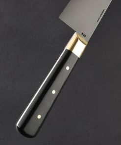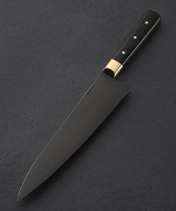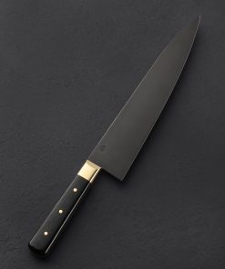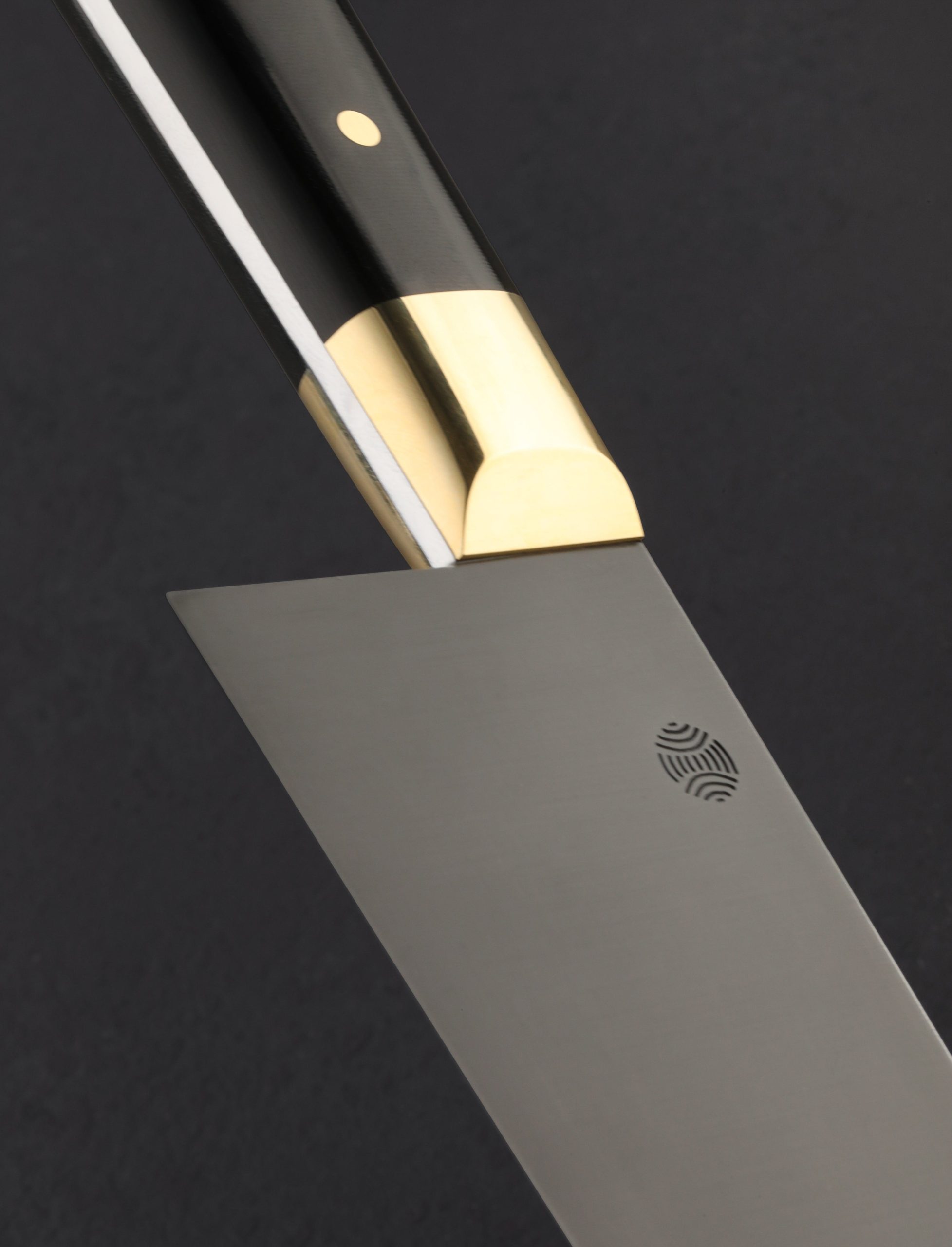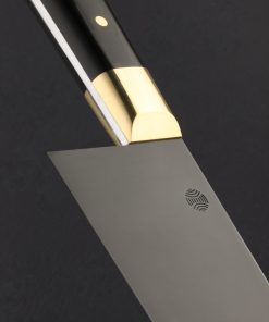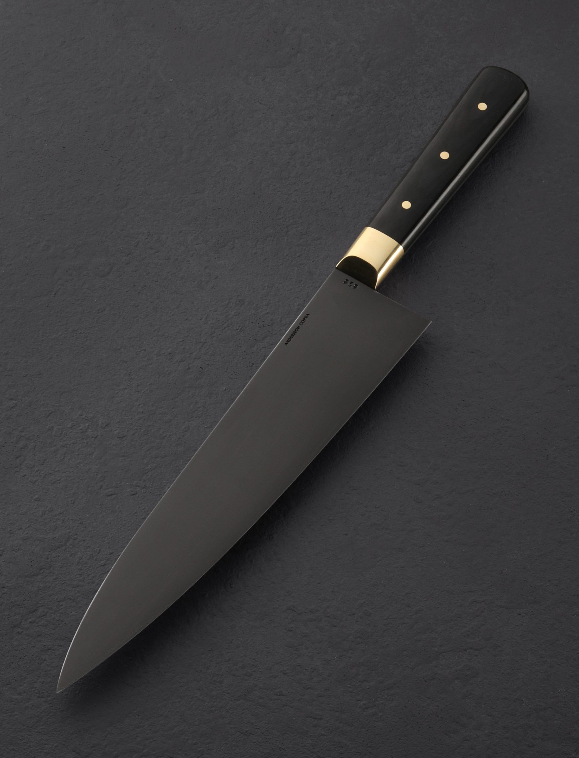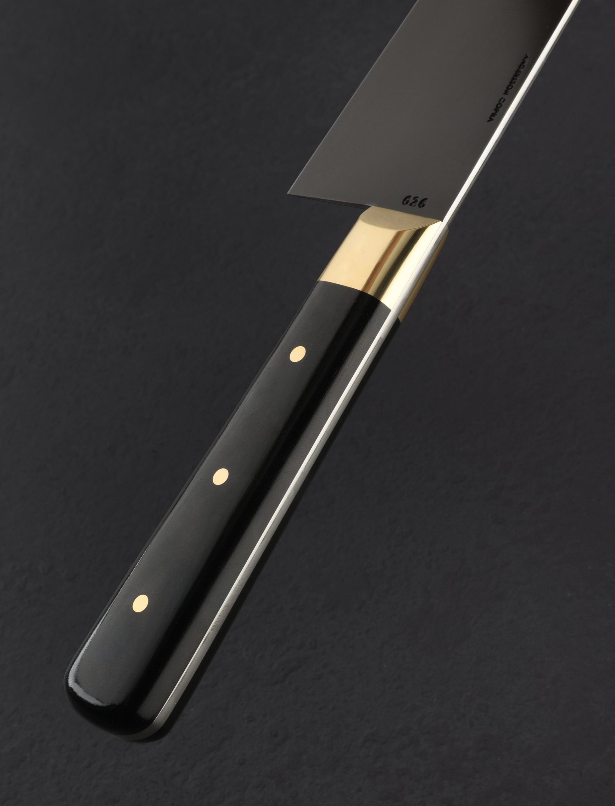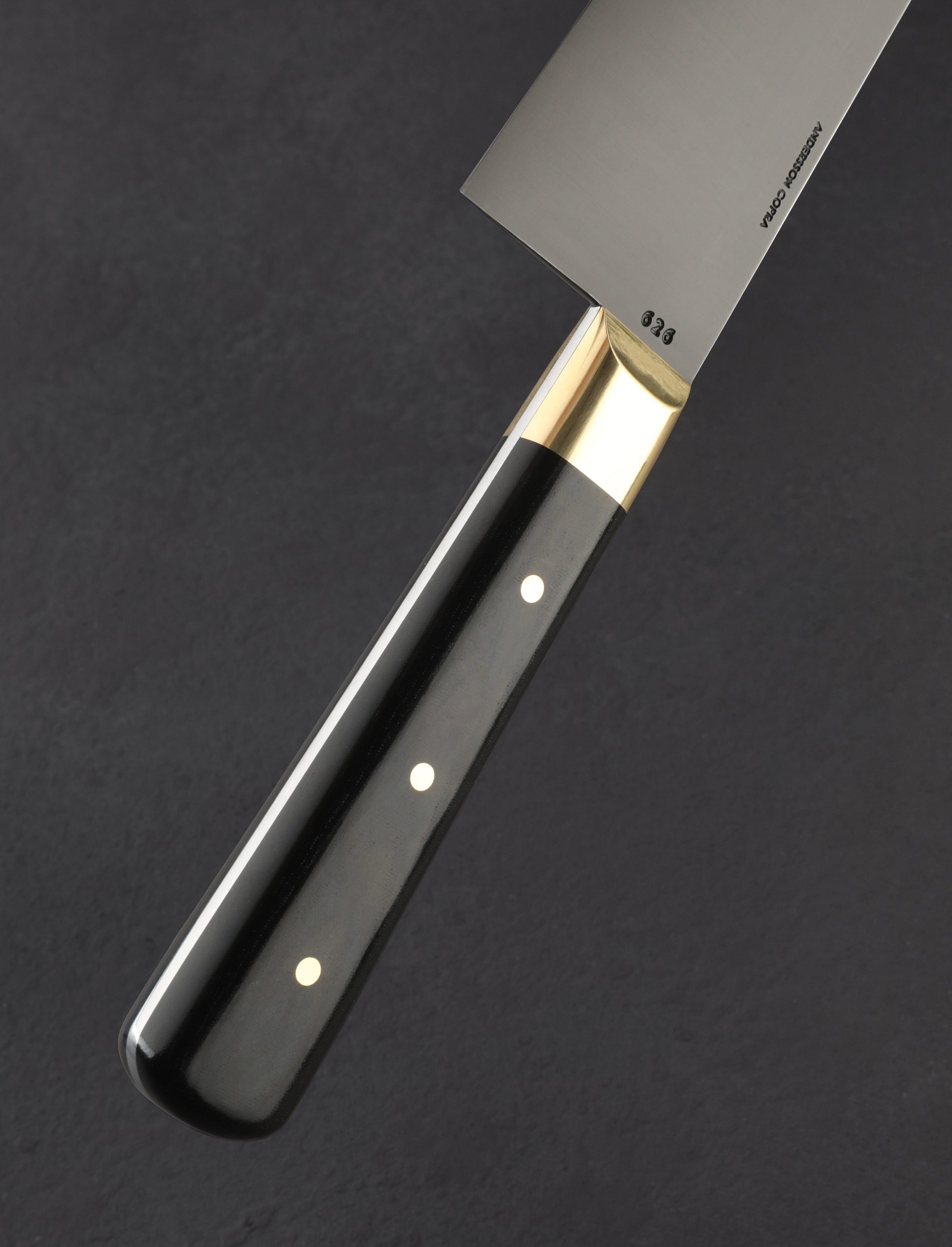 A handcrafted chef knife collaboration between Living Steel and Sweden’s Joel Andersson and Adisa Copra, the talented team behind Andersson Copra, this elegant, French-style knife is built to be the go-to cutting tool for daily meal prep of all variety in home and professional kitchen alike. At 235mm / 9.25″ long and standing 49mm tall at the heel, the blade is sculpted from Swedish Uddelholms UHB20C high-performance carbon steel, tapering steadily to a fine tip for detail work, and delivering a thin, hard, whetstone-sharpened edge beneath superbly shaped convex bevels. The blade receives a forced patina for extra protection and good looks, contrasting the rounded and high-polished spine and choil. Simple in form, wonderfully finished, and comfortable in any grip, the handle of polished black micarta is secured with three solid brass pins and capped with tapered brass bolsters.