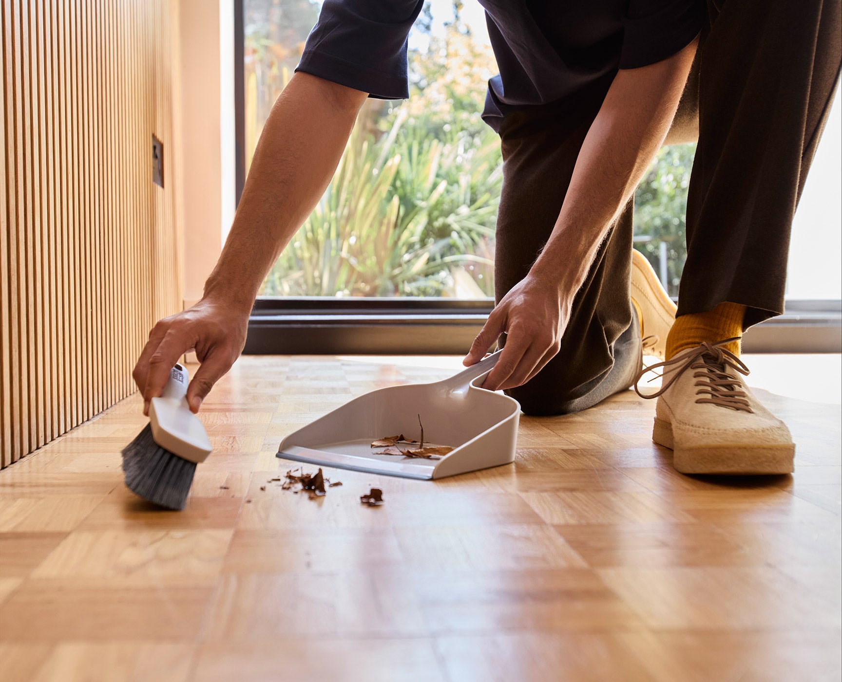 This dustpan and brush set includes a Dust-shield™ holder for cleaner and more hygienic storage. The brush has angled bristles and pan has a rubber edge for more efficient sweeping.
