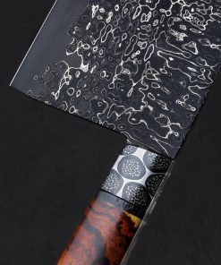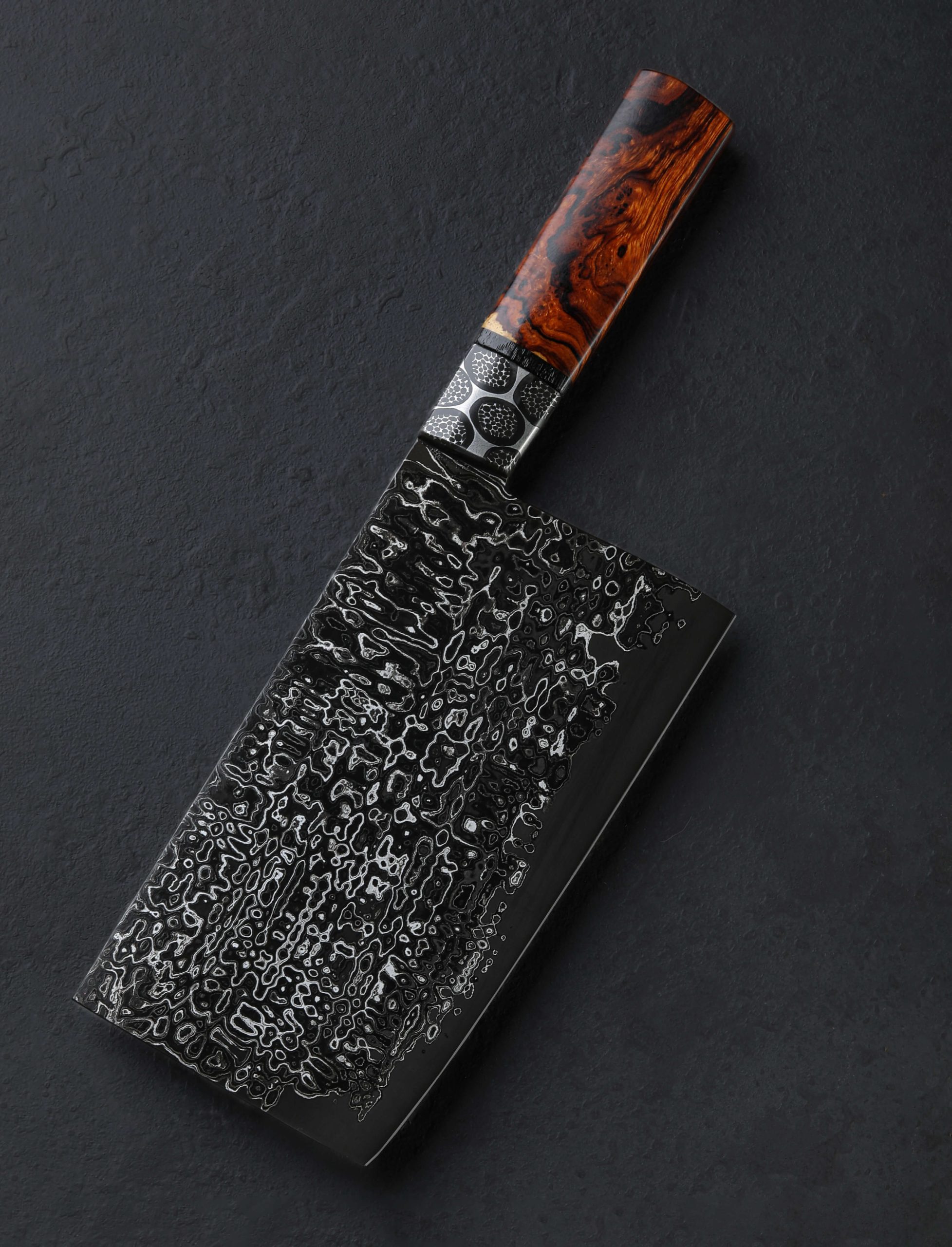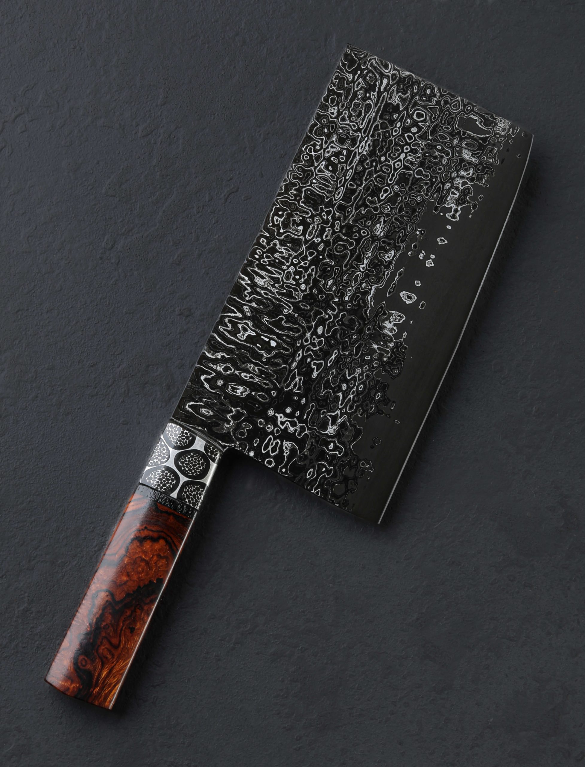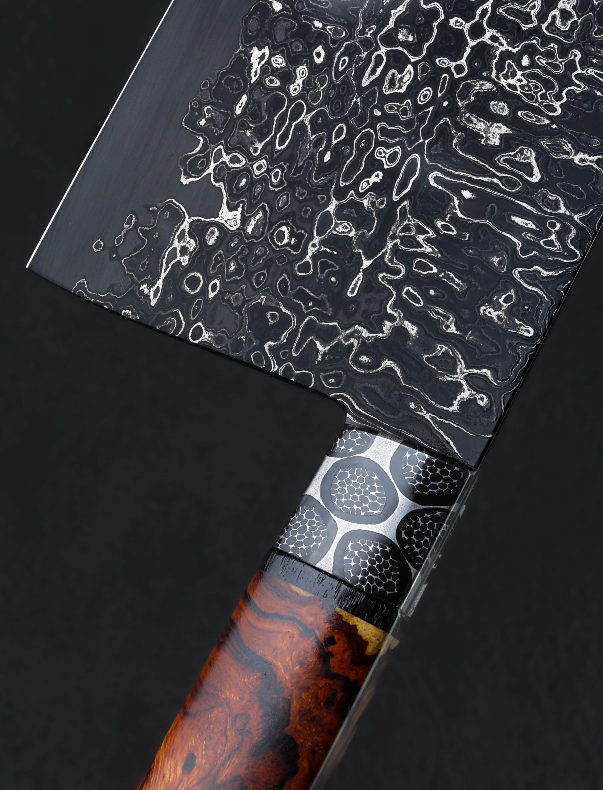 Detroit bladesmith Nico Nikolaides delivers in breathtaking style with his first offering of 2025. A one-of-a-kind vegetable cleaver designed and built for daily meal prep combines a collection of materials that just may define a new genre of visual art. With Niko’s technical and performance-driven attributes a firmly in place, attention turns first to the homemade san mai (three layer) blade steel’s cladding which he has forged from a combination of 52100 high-carbon ball bearings, 1084 powder steel, and 4800kc powder steel, to produce a striking visual effect. Metallic ripples, like a soft rain on a still pond, produce a topographic-like texture from the spine downward through the symmetrical bevels, fading away into the dark, 52100 core which forms the cutting edge. Niko’s outstanding bevel geometry and forward-leaning balance that allows this purpose-built tool to perform with minimal effort ensure efficient vegetable chopping breakfast, lunch, and dinner. A very thin, hard and razor-sharp edge is backed by 12.2oz / 348g of mass, resulting in a powerful and steady feel in the hand. For comfort and control, a handle with as much unique style as the blade marries bolsters hand-forged from Niko’s Cluster pattern mosaic damascus steel with a stunning piece of ironwood burl and a ring of ancient, textured bog oak. From the heirloom fit damascus-to-wood transition, to the subtle rounding of the 91mm-tall blade choil, and every detail in between, this Detroit-based artist as raised the bar yet again.