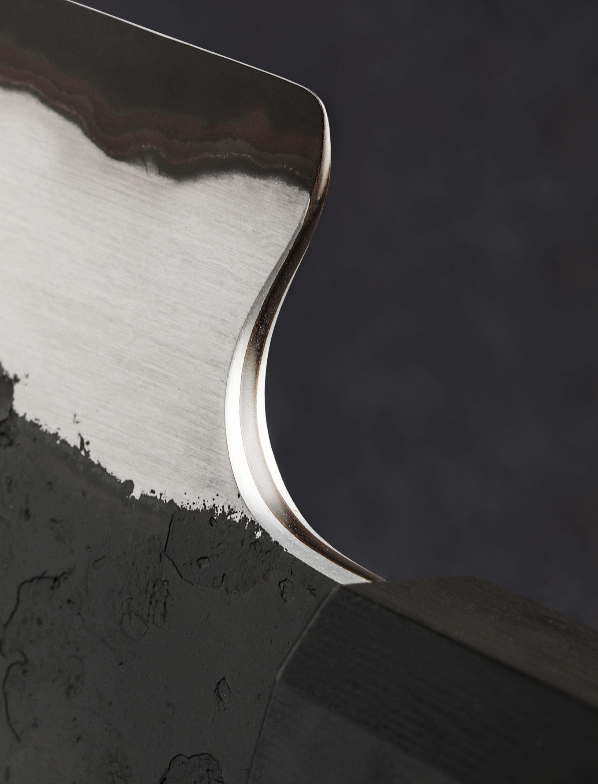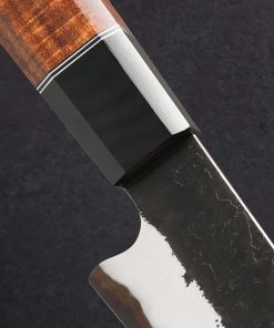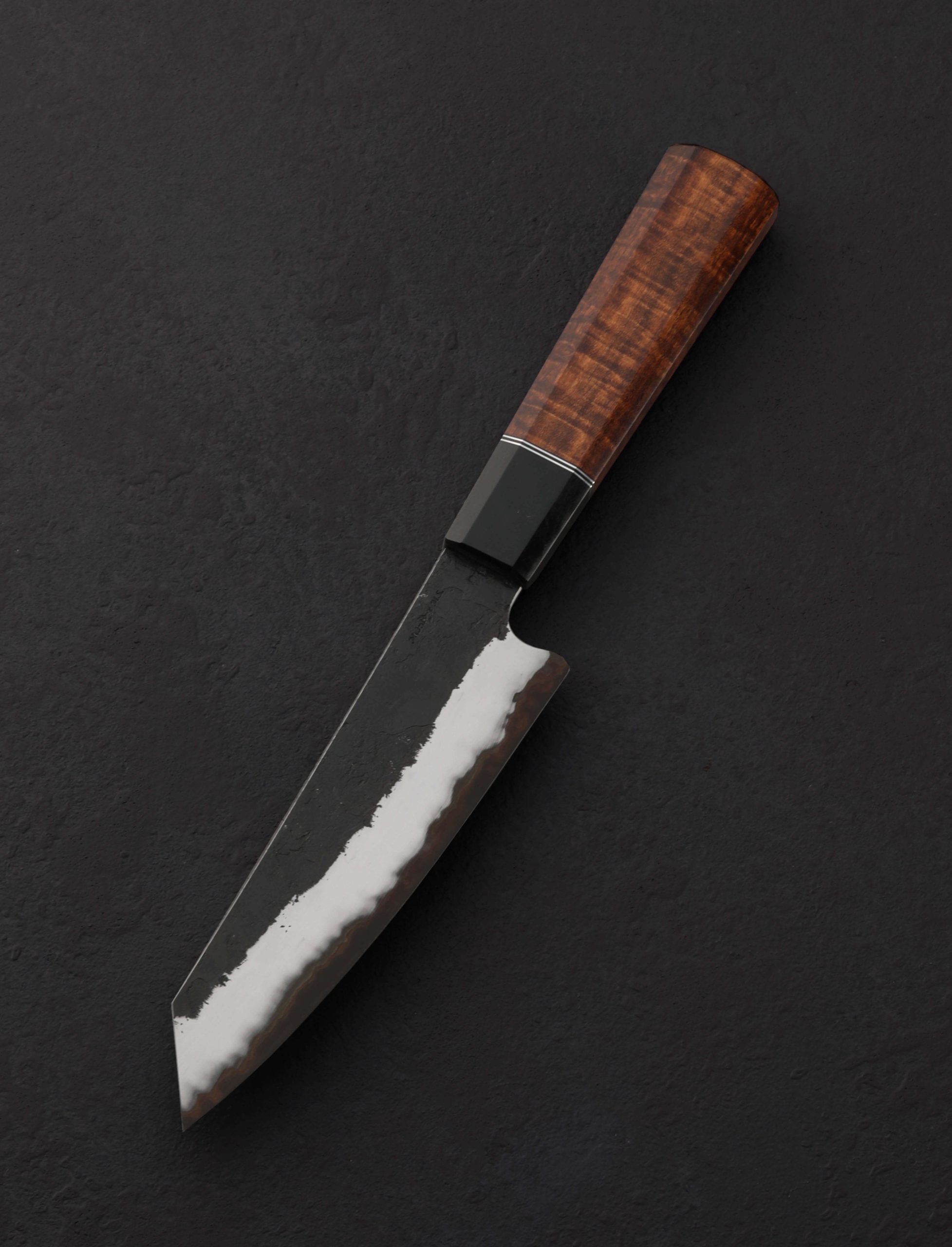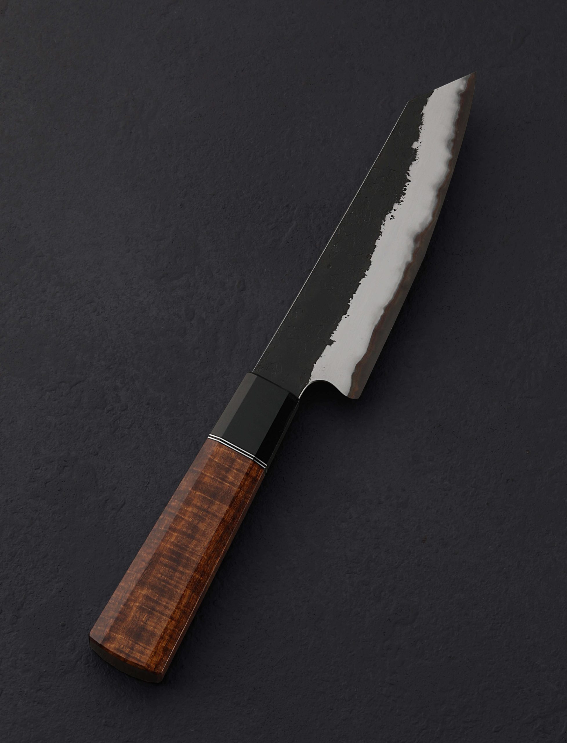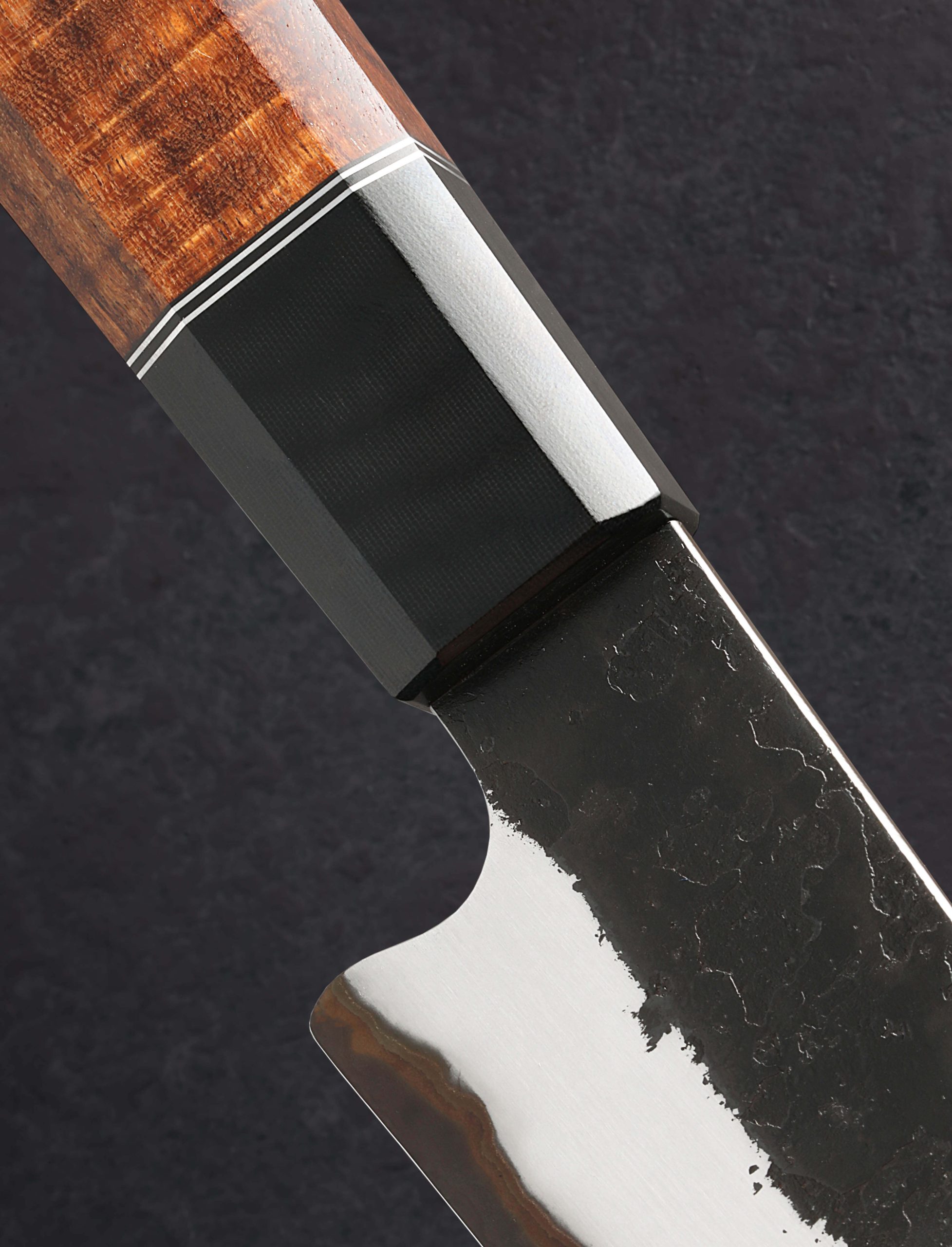 The first culinary knife by this extraordinary artisan to feature in our collection for a number of years is a tool as handsome and refined as it is versatile and utilitarian in the chef’s kitchen. Shawn McIntyre of Melbourne, Australia, first an Eatingtools maker in 2016, forges 416 stainless steel atop a core of W2 high-carbon to create the K-tip blade of this 150mm / 5.9″ petty chef knife designed to function as a do-all kitchen utility blade. Stiff and sturdy along the rounded spine, one which shows in stark visual contrast the san mai (three layer) steel formula, comes a blade with a honesuki-like profile complemented by thoughtfully shaped geometry designed for all manner of daily meal prep: convex bevels provide mass where it is needed for toughness during chopping tasks and cuts of dense ingredients, while a thin, finely honed, razor-sharp edge and especially fine, needle-like tip make precision slicing and detail work a breeze. The textured, forge-finished blade flats tell the story of the knife’s hand-hammered origins, with silky, satin-finished stainless bevels below culminating at the carbon steel core that has been dipped in a coffee etch for a dark, multi-colored aesthetic with beautiful alloy banding clearly visible. Balanced just at the front of the hidden-tang wa handle, the knife moves nimbly and naturally in the hand, the robust, octagonal grip sculpted from stunning ringed gidgee wood with black micarta bolster.