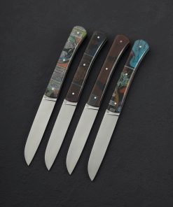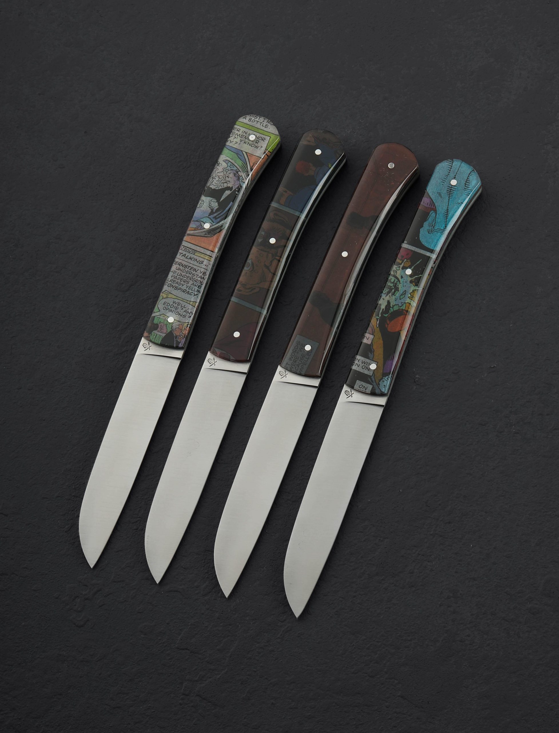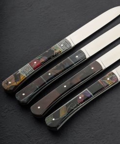 Perhaps the most unique tabletop offering from maker Roland Lannier of Thiers, France are these one-of-a-kind table knife sets with handles crafted from Roland’s favorite comic books. Delivered in an in-house 3D-printed storage stand, the handle of each knife is sculpted from a resin composite that layers the actual paper pages from the comic books in beautiful style for a bit of fun and mystery in the dining room. With sharp, elegant blades of stainless steel they perform beautifully and the steel is easy to care for, but keep the handles out of the dishwasher (like any fine culinary tool) to keep them in top condition. A very limited number of these special sets are available.