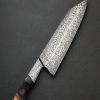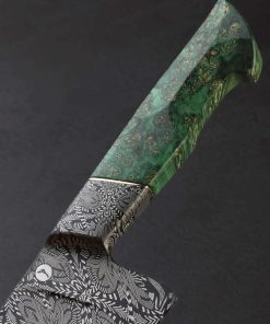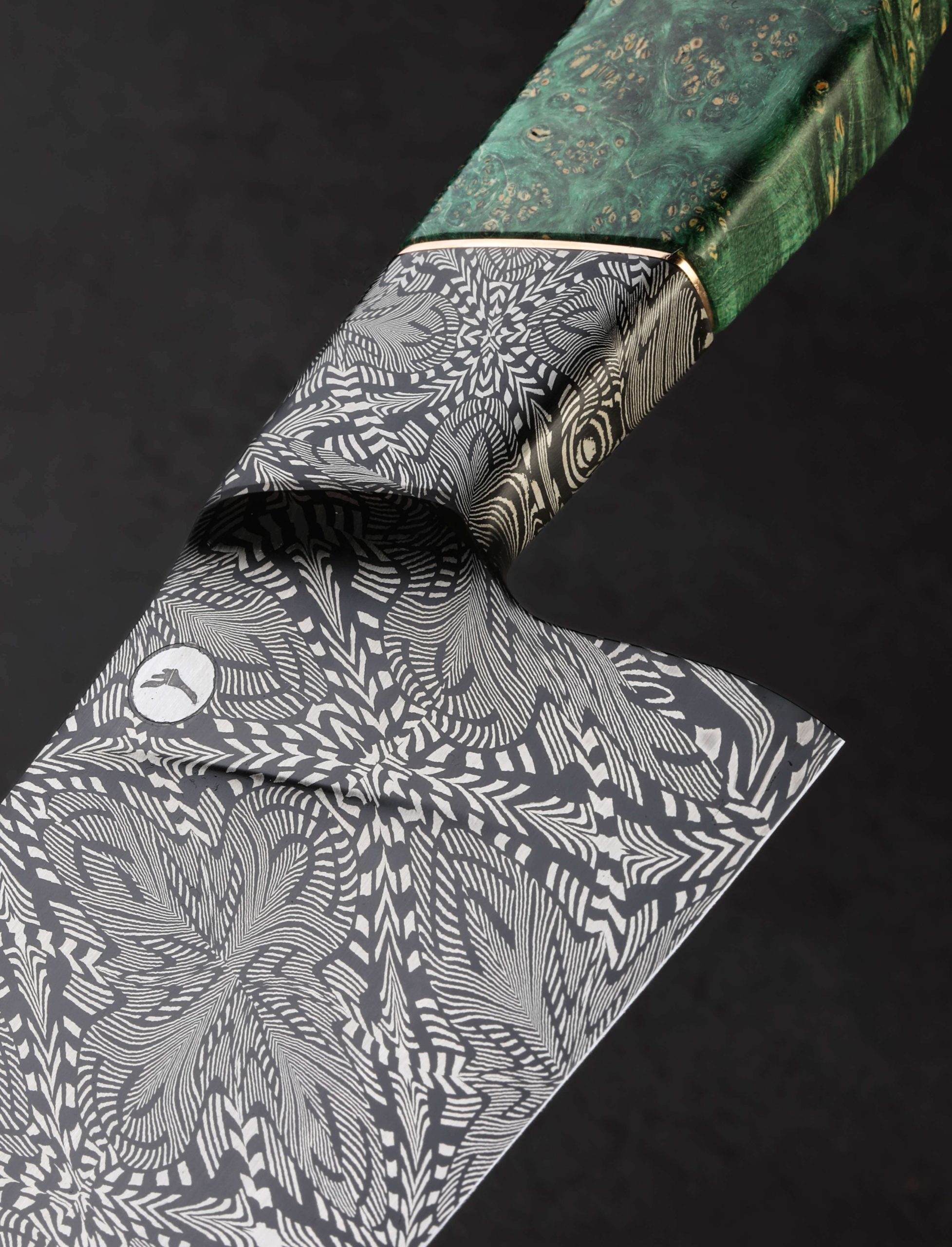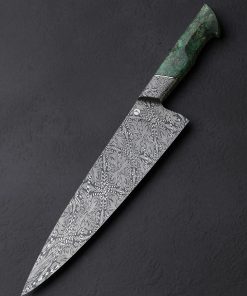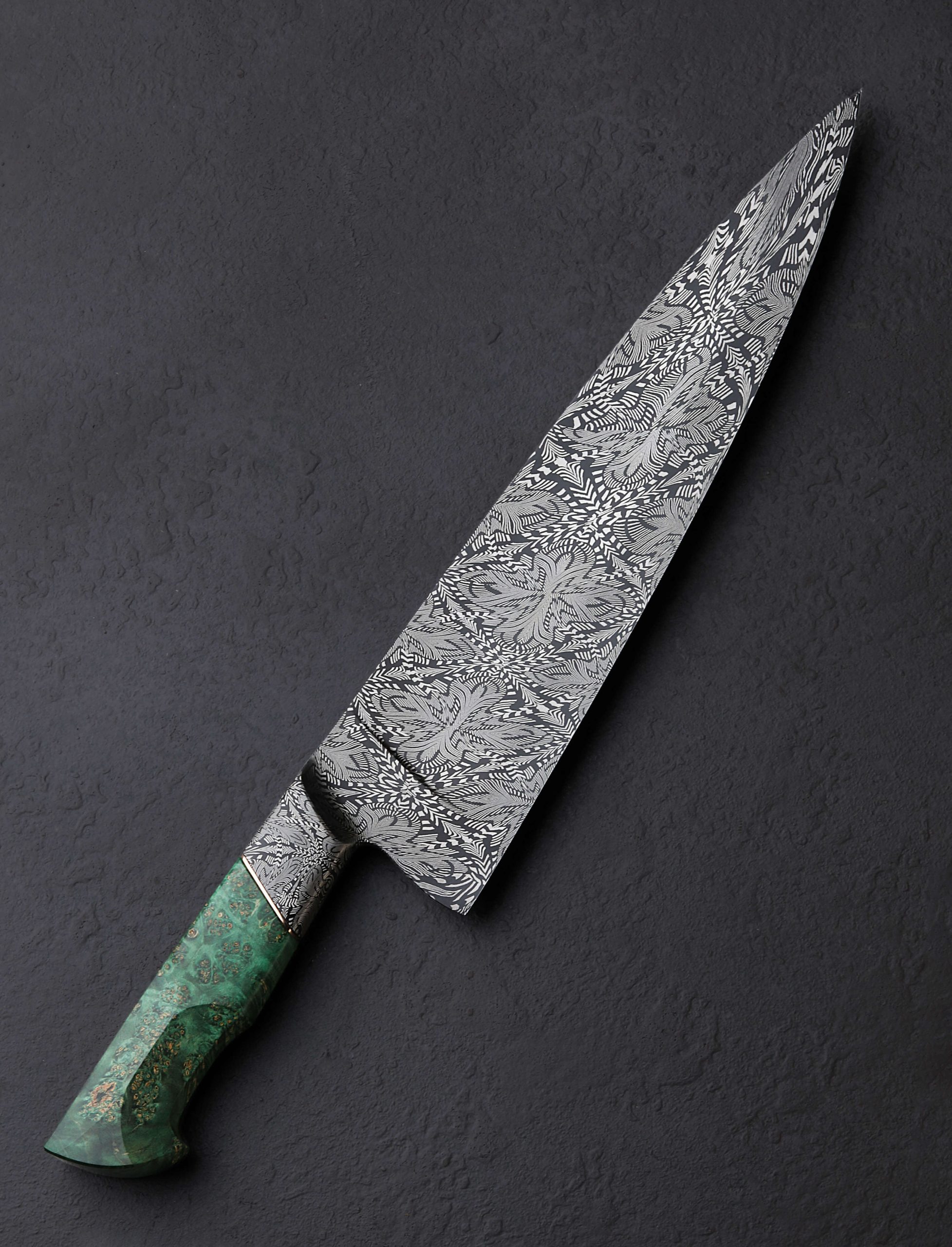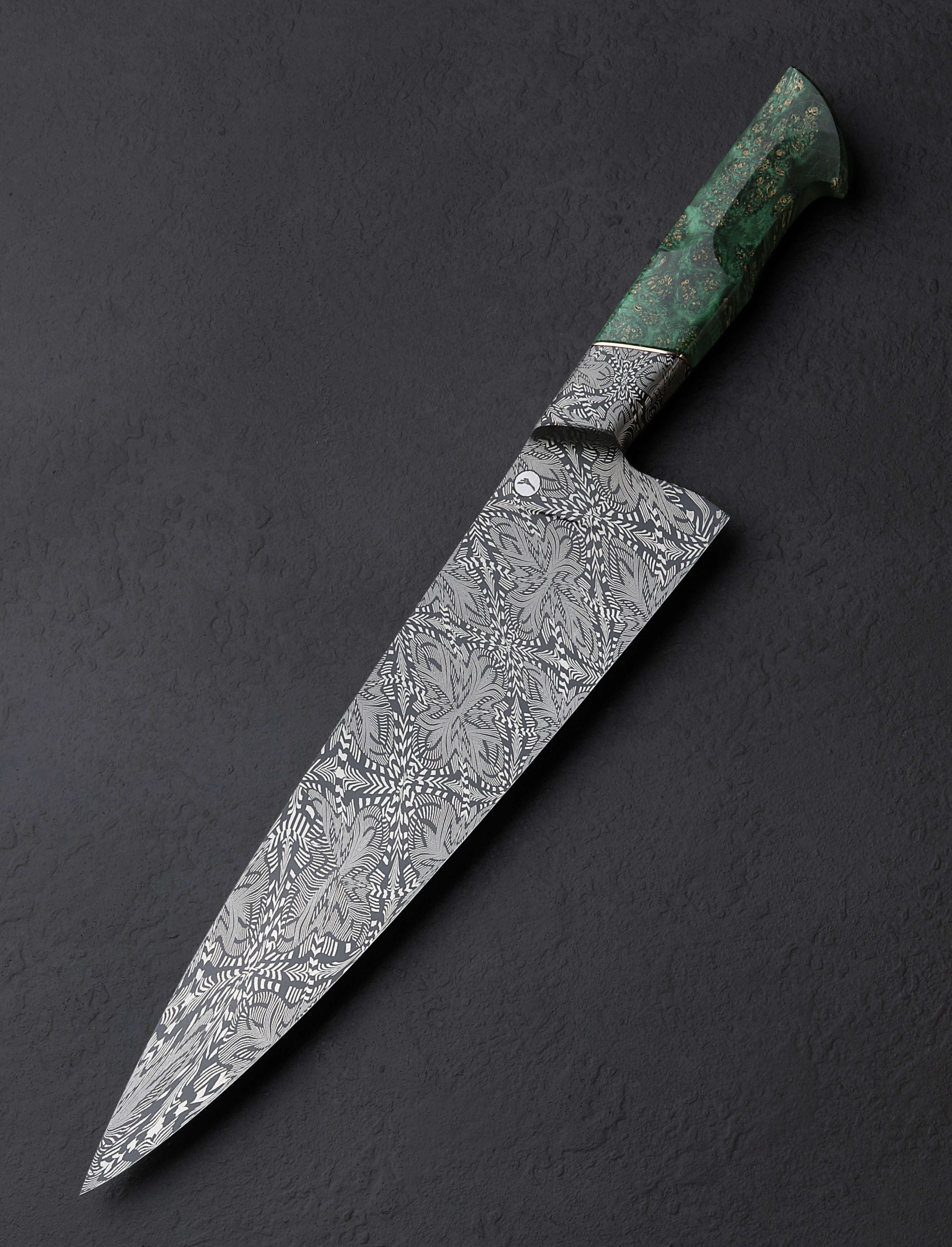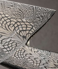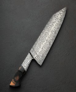 The latest and greatest by one of the best in the business upholds in every way the extraordinary standards he has set for his culinary artwork: by bladesmith Salem Straub, Constrained Vibrations is the freshest chef knife to be cooked up at his Washington studio. The blade, measuring 262mm / 10.3″ long and 63mm tall, is shaped from a newly conceived mosaic damascus pattern that merges dense and open elements, perpendicular and parallel lines, and stretched and condensed forms, which tiled together form a striking and detailed metallic artwork that flows from the integral forged bolster to tip. Light and thin, the entire object weighing under eight ounces, the blade enjoys Salem’s usually superb compound ‘S-grind’ bevel geometry above a thin, hard, razor-sharp edge. The dimensions in tandem with Salem’s carefully calibrated heat-treatment process results in no small degree of lateral flexibility in the forward half of the blade. Tapering steadily along the rounded spine, the blade’s width from top to bottom slims until a fine, pointed, yet not-delicate tip is reached, perfect for all manner of slicing and detail work. Comfort and control are provided by a Western style handle in spalted maple wood with a stunning combination of curved faces and flat facets, set with an heirloom-fit Zildjian Cymbal bronze spacer, and capped with a silicon bronze retention bolt cap at the rear.