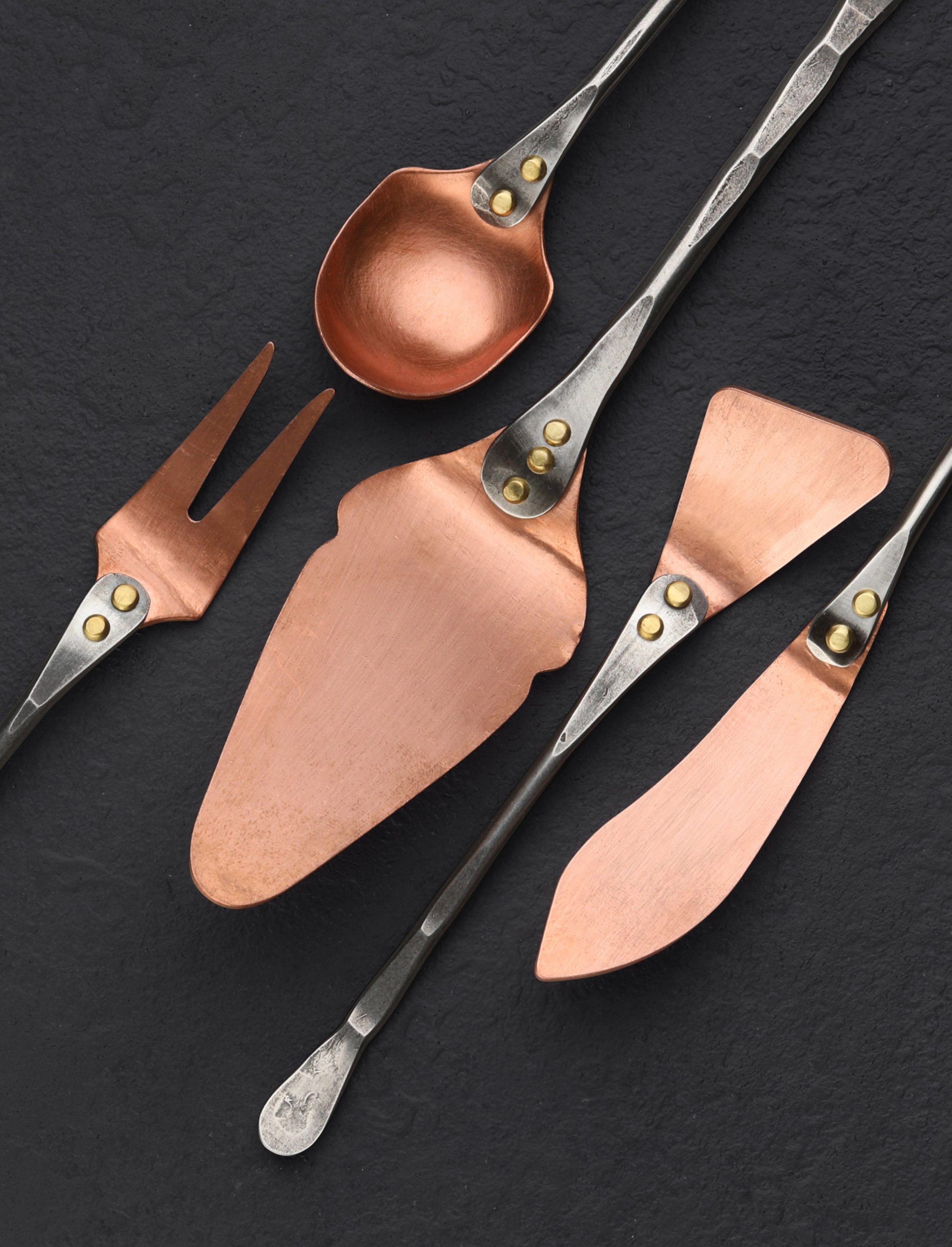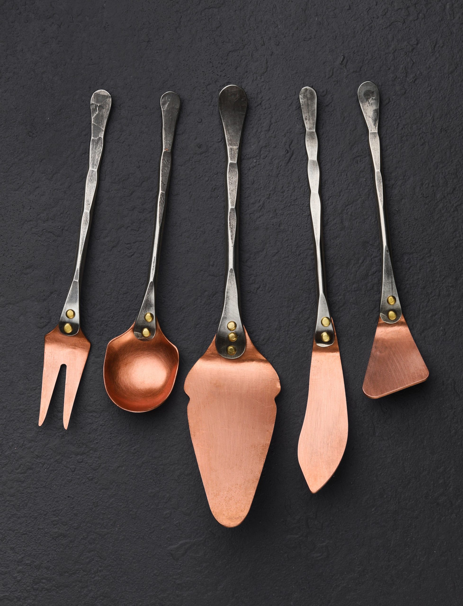 Elegant and rustic, handcrafted in Colorado by Jill Rikkers, an appetizer set with five forged utensils in steel and copper with brass rivets. Beautifully shaped spreaders for butter, cream cheese, jams, and marmalades. A two-tine appetizer fork for pickels, olives, onions and more. The perfect spoon for capers as well as dry ingredients. And a small server for the rest. There will be no shortage of uses for this wonderful set.