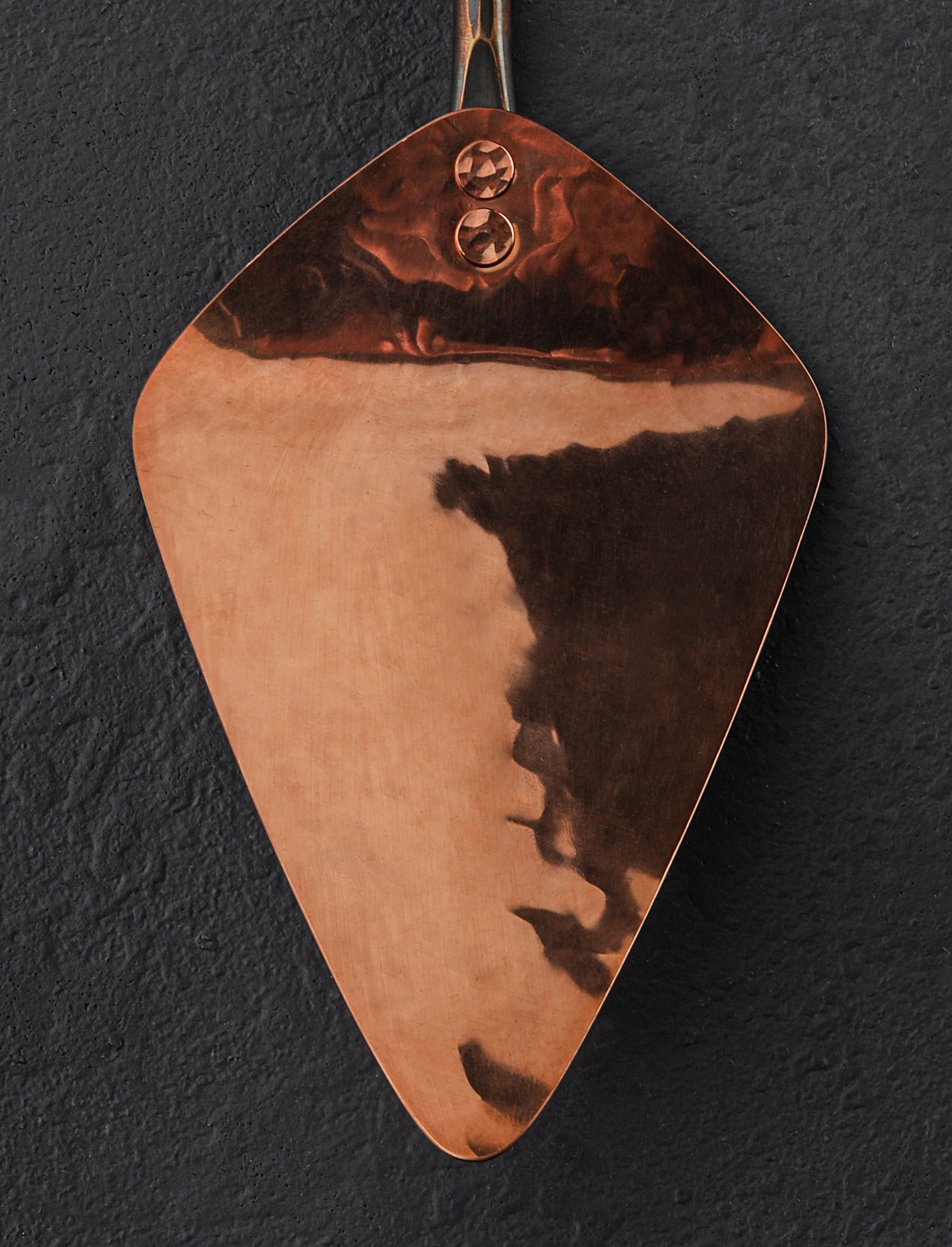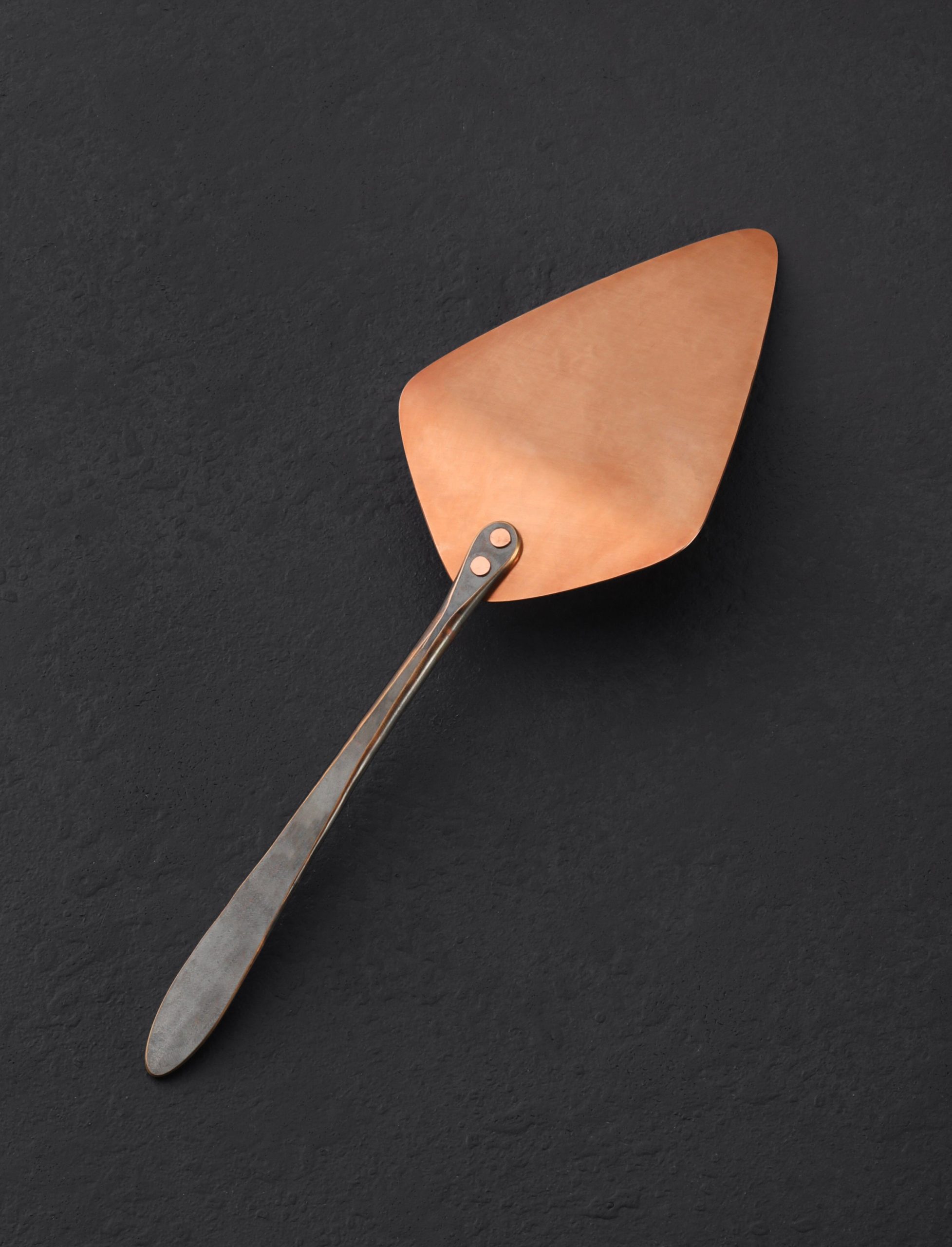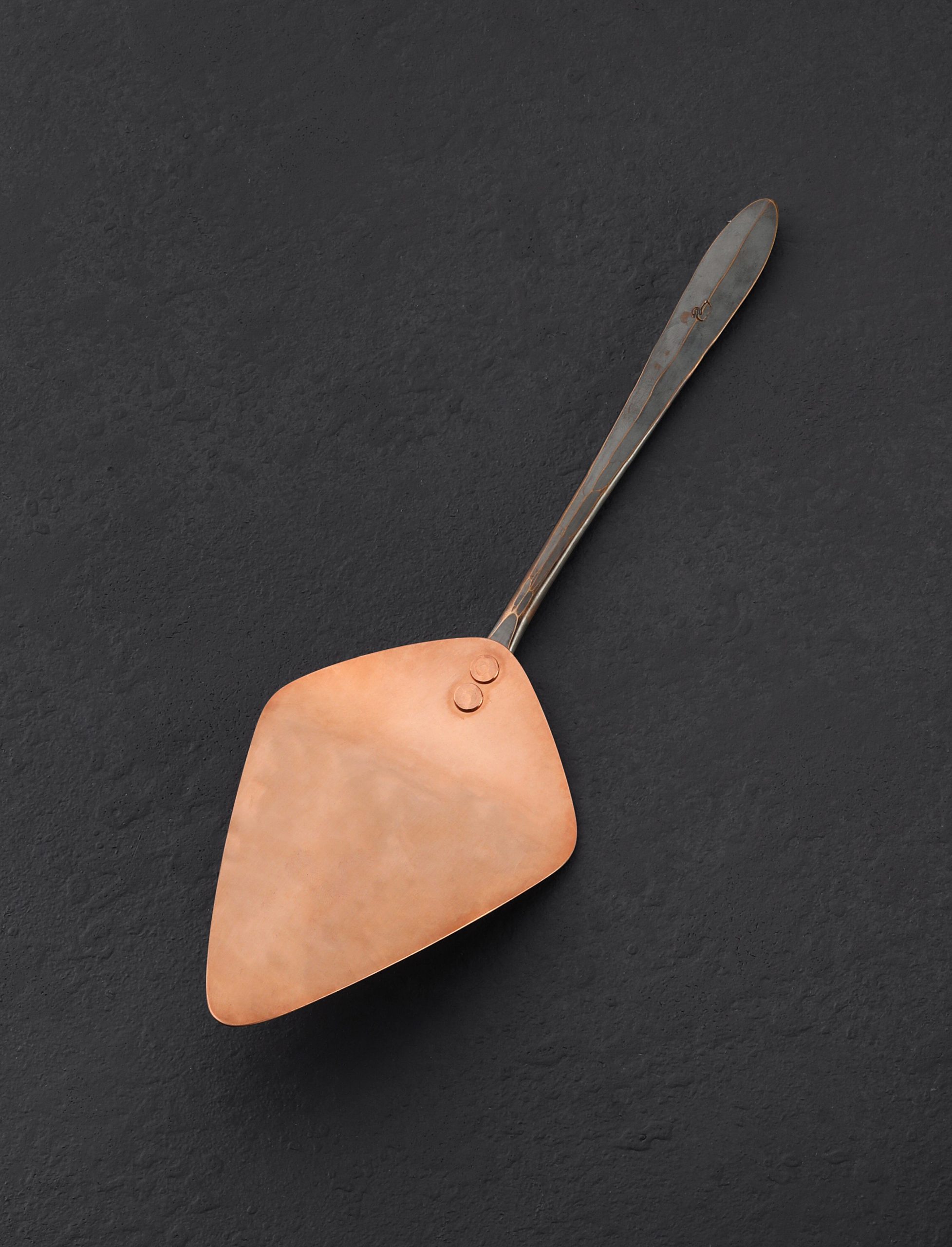 Crafted from consciously sourced, American-made metals, each Copper & Bronze Pie Server is hand-hammered to completion by Park Swan of Black Swan Handmade at his workshop in Virginia. The forged C655 silicon bronze handle is fastened to the head with two raw copper rivets and has a beautiful, multi-tone finish and wonderful feel in the hand. The hammered copper head creates a unique kitchenware style with a classic aesthetic that includes a visible mark from each hammer, helping to tell the story of the handmade process Park uses for each item he creates. The copper and bronze will patina over time to produce a lovely and ever-changing finish. An exceptional tool for serving baked goods.