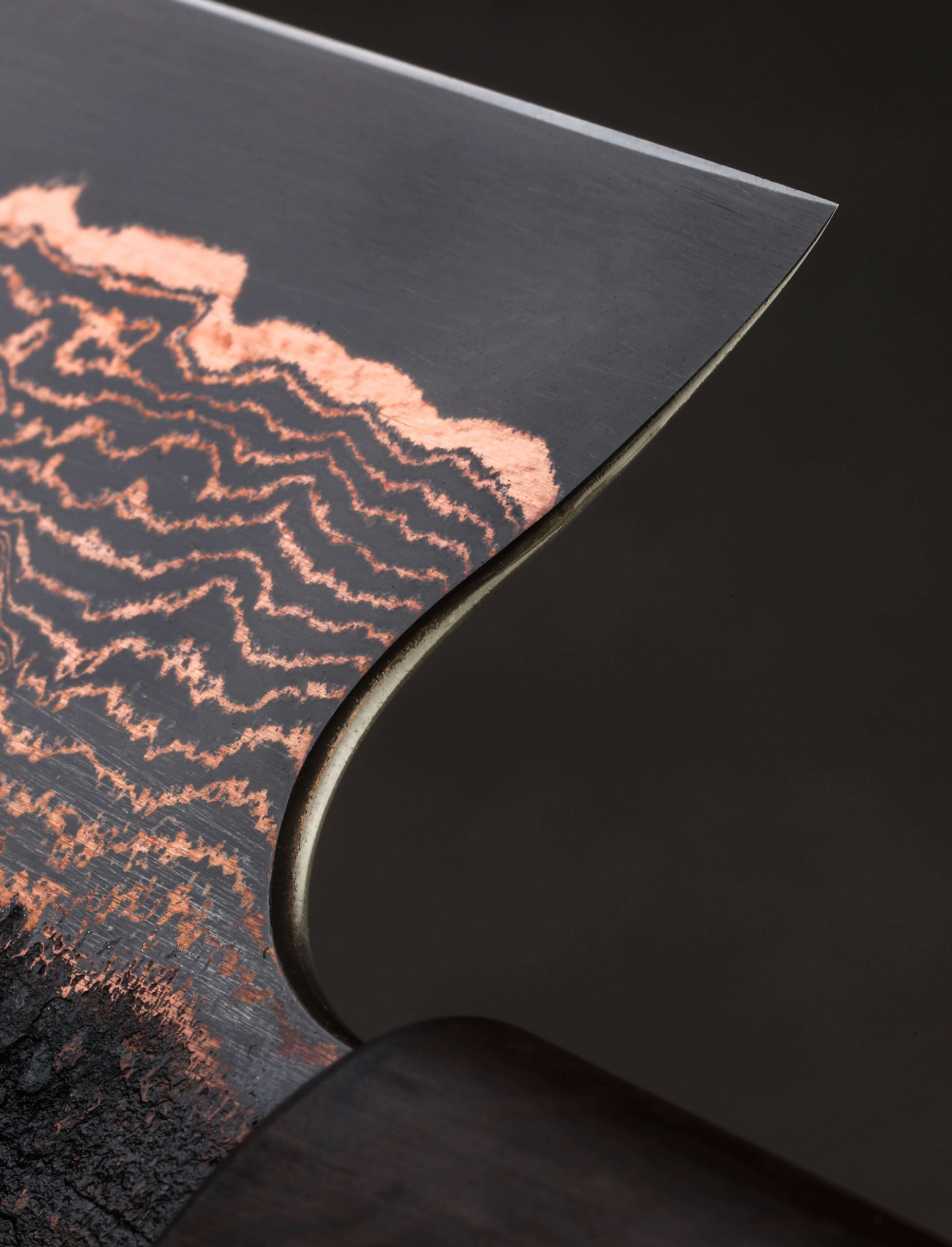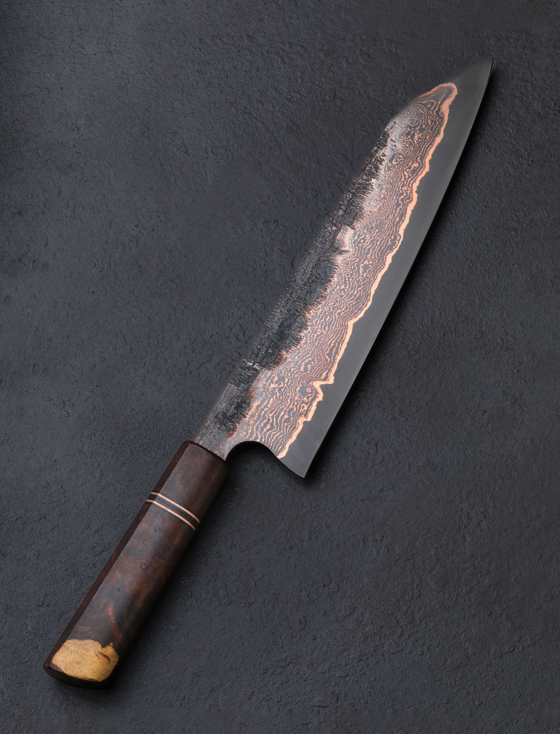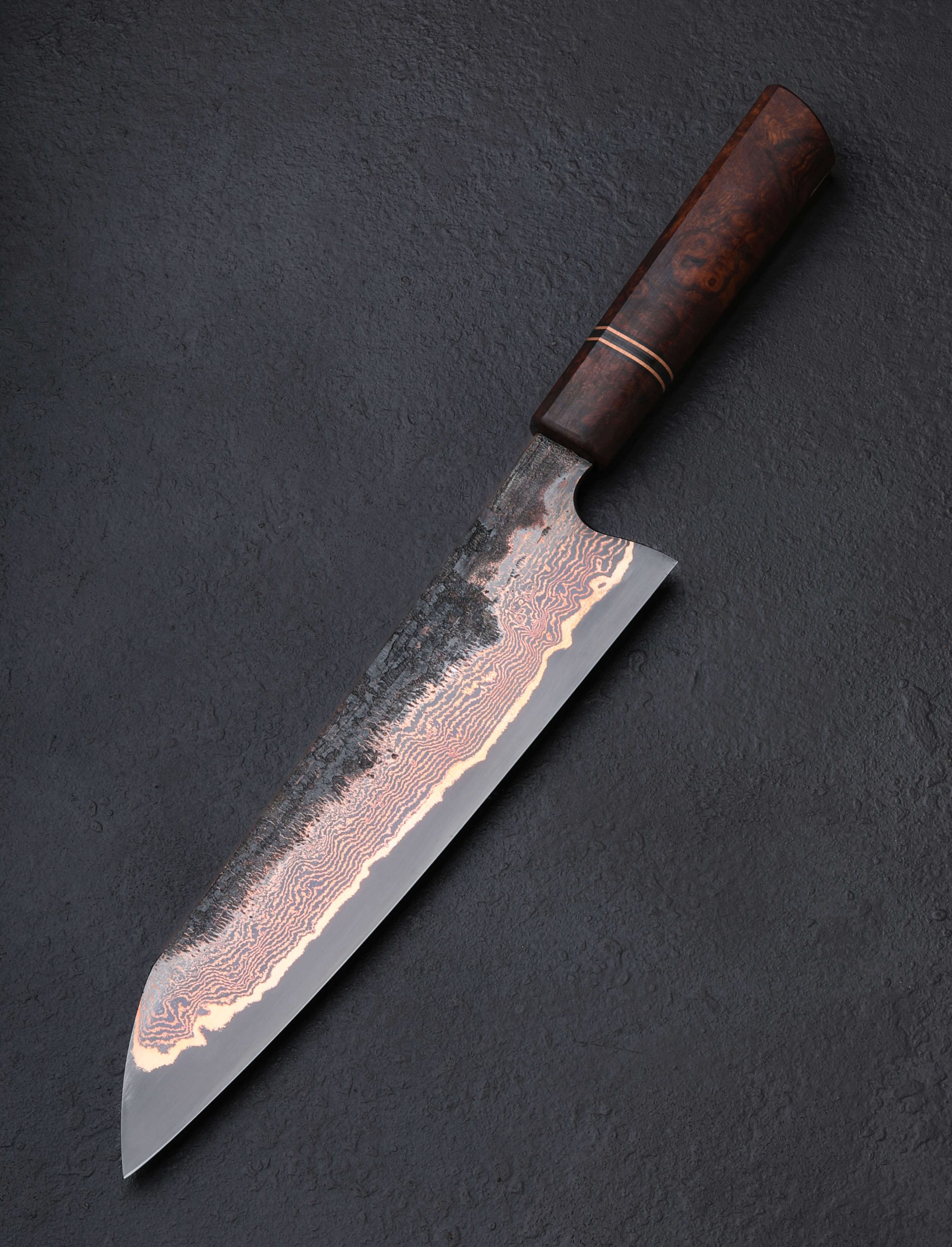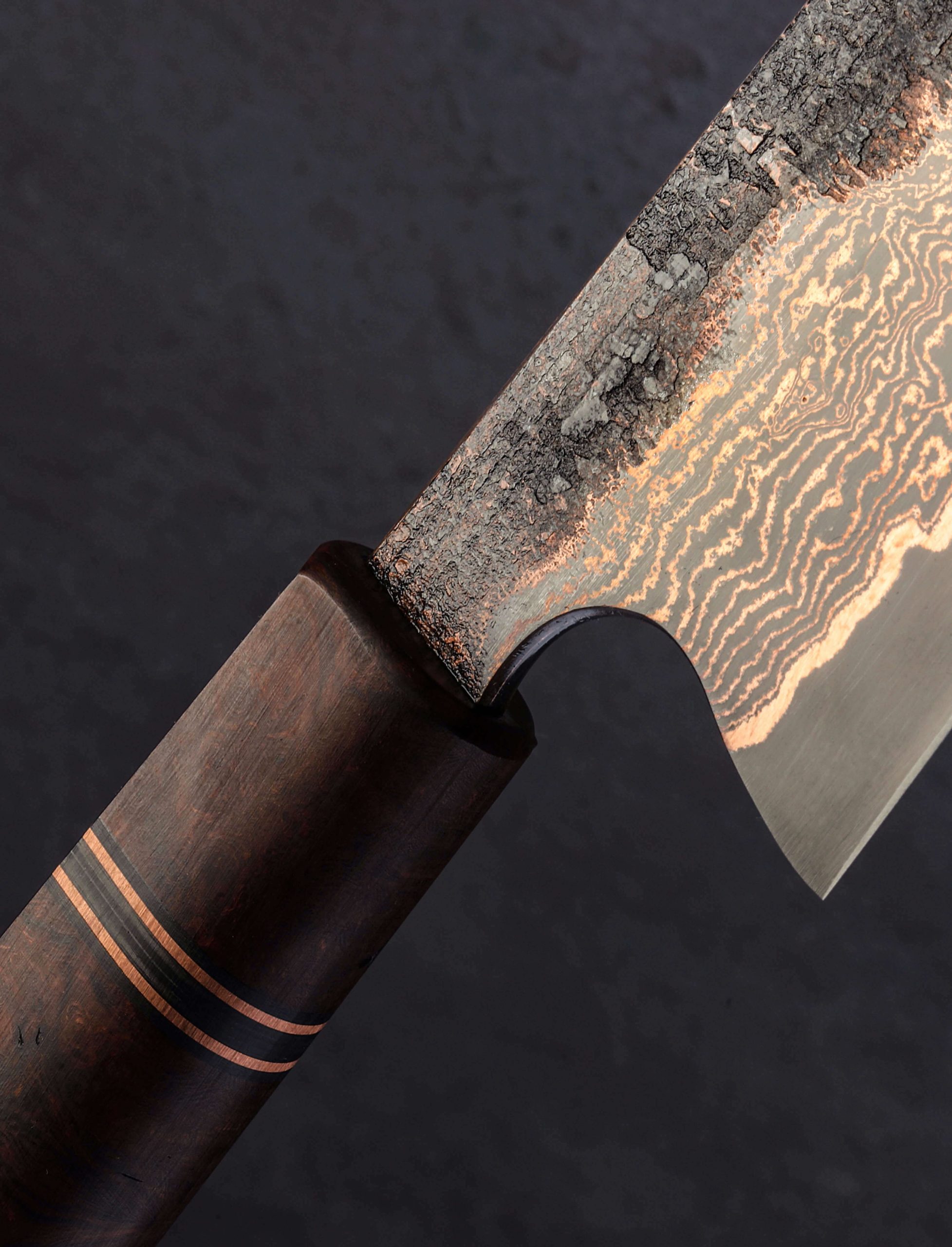 Stand-out work by Austrian bladesmith Martin Huber that checks all the boxes: premium materials, visual beauty, and finely honed geometry, all in a package designed to do it all. Formulated and crafted from the ground up, Martin forges the damascus cladding from pure copper and 02 carbon steel, layering the finished product atop a core of 1.2419 high-carbon steel which forms the cutting edge. And that long, 240mm / 9.4″, razor-sharp edge is ready for action. Especially thin at, and just above, the cutting edge, the bevels are superbly shaped, convex with a medium height grind, perfect for not only all types of chopping tasks that take advantage of the tool’s overall size and heft, but for long, precise, and delicate slices as well. The rounded blade spine tapers significantly in the final inches as it leads to an aggressive, glass-thin tip, further adding to the edge’s versatility. With its nicely etched bevels that darken the steel and bring out the sheen of the copper, and forge-finished flats that show the rustic, hand-forged origins of its creation, the blade presents a touch of perfectly balanced lateral flexibility to boot. For comfort and control over the elegant blade in a style that complements the metallic portion of the tool wonderfully is a handle of dessert ironwood embellished with rings of black micarta and copper. The handle’s form, Martin’s shield-style wa rendition, is symmetrical in all directions and welcomed by all hand sizes and cutting styles.