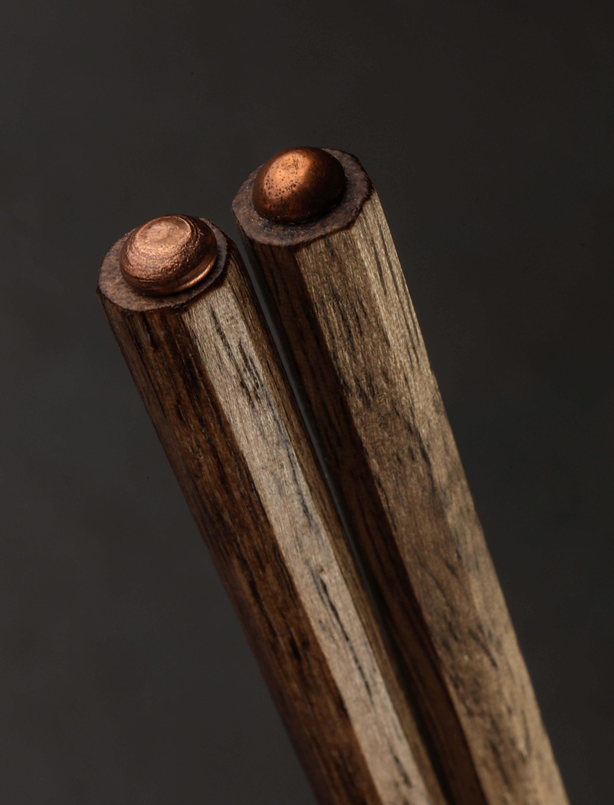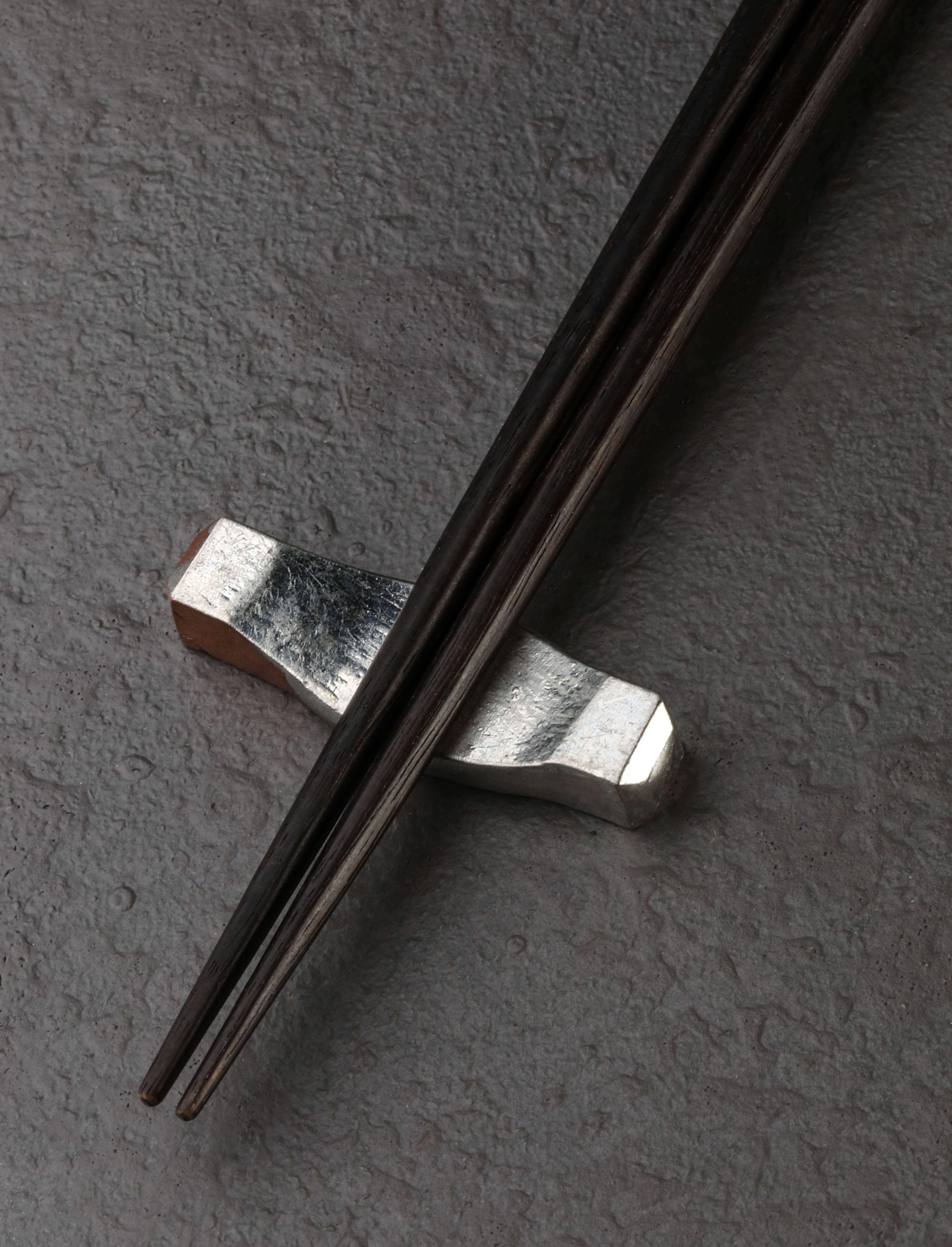 The classic Japanese hashi style is adapted by artist Eric Wright to form a beautiful dining set that includes a pair of persimmon chopsticks inlaid with copper and a tinned copper rest. Partially charred by fire for both a handsome two-tone aesthetic as well as protection and durability, the persimmon wood tapers from an octagonal form downward to thin, round tips. Balanced and comfortable in the hand, the natural material offers grip and a wonderfully tactile experience, whether sushi, noodles, salad, or any other dish is on the menu. Solid and weighted, the copper rest matches the domed inlays at the top of the chopsticks and boasts a tinned finish on the top surface. This newest culinary offering by Eric, our long-time collaborator and maker crafting in the US state of Georgia, makes a cherished gift for any gastronome.