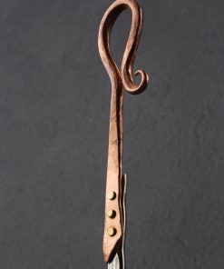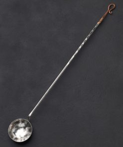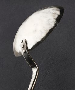 Perhaps one of the most unique and niche tools in a chef’s arsenal, the egg spoon provides a raw, agrarian method of preparing this versatile staple: frying atop the coals of a fire. Forged by hand in Colorado by Jill Rikkers, this beautiful object features an extra-long 820mm / 32″ handle for safe handling at the fireplace, hammered and textured for grip, and embellished with a decorative copper end, secured with brass pins, for hanging on the wall. The bowl, finished with a lovely brushed and hammered sheen, is contoured just so for cooking an egg at a time.