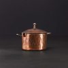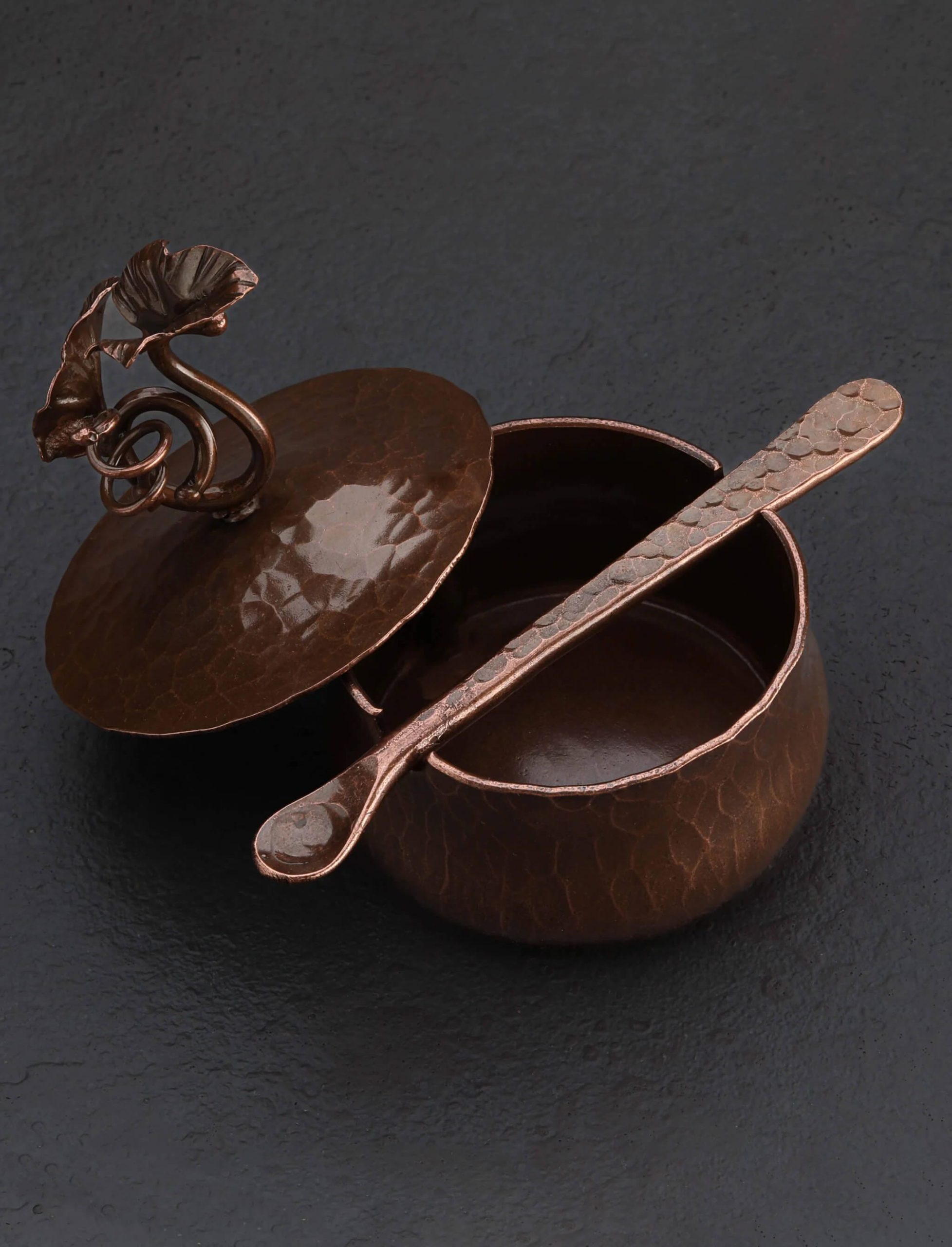This beautiful, hand-hammered vessel and spoon set complements any interior, whether at home in the dining room to store your preferred finishing salt, or in the kitchen topped off with crystal kosher salt. Part copper sculpture and part culinary tool, husband-wife team Rex and Marsha Morton of Mountain Metalsmiths show off their many talents, the results of their combined decades of coppersmithing experience, in this piece of functional art. Three pieces of art, to be precise: The cellar itself boasts elegant, contoured walls that flare outward toward the base, a notch at the rim in which the spoon rests, and a small post with which to receive the lid. The elegant, domed lid, also bearing the hammer marks of the object’s hand-hewn origins, is capped with a decorative Vine handle, giving each a one-of-a-kind adornment. Made removeable to use the cellar with or without it, the lid includes a hole to receive the post built into the cellar so that it can easily opened and closed. Finally, a handsome and simple salt spoon, also forged from solid copper, completes the three-piece set. Each is sealed with a food-safe varnish for longevity.