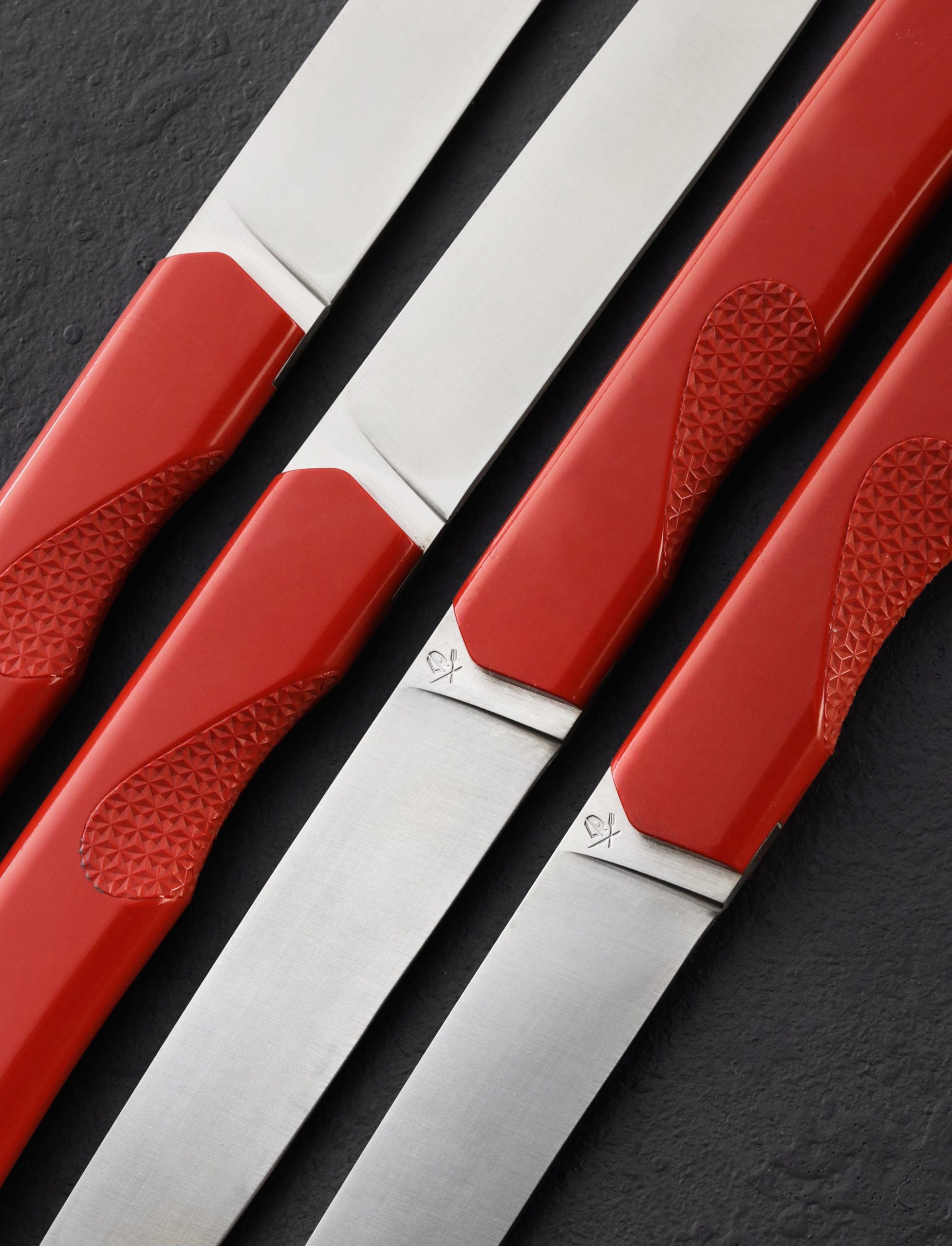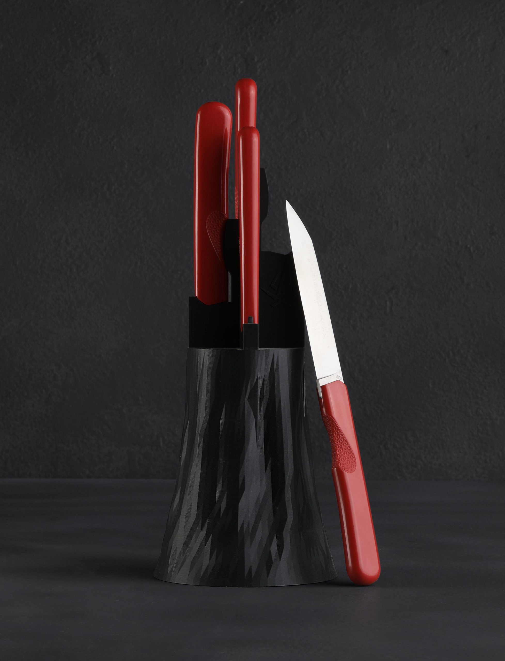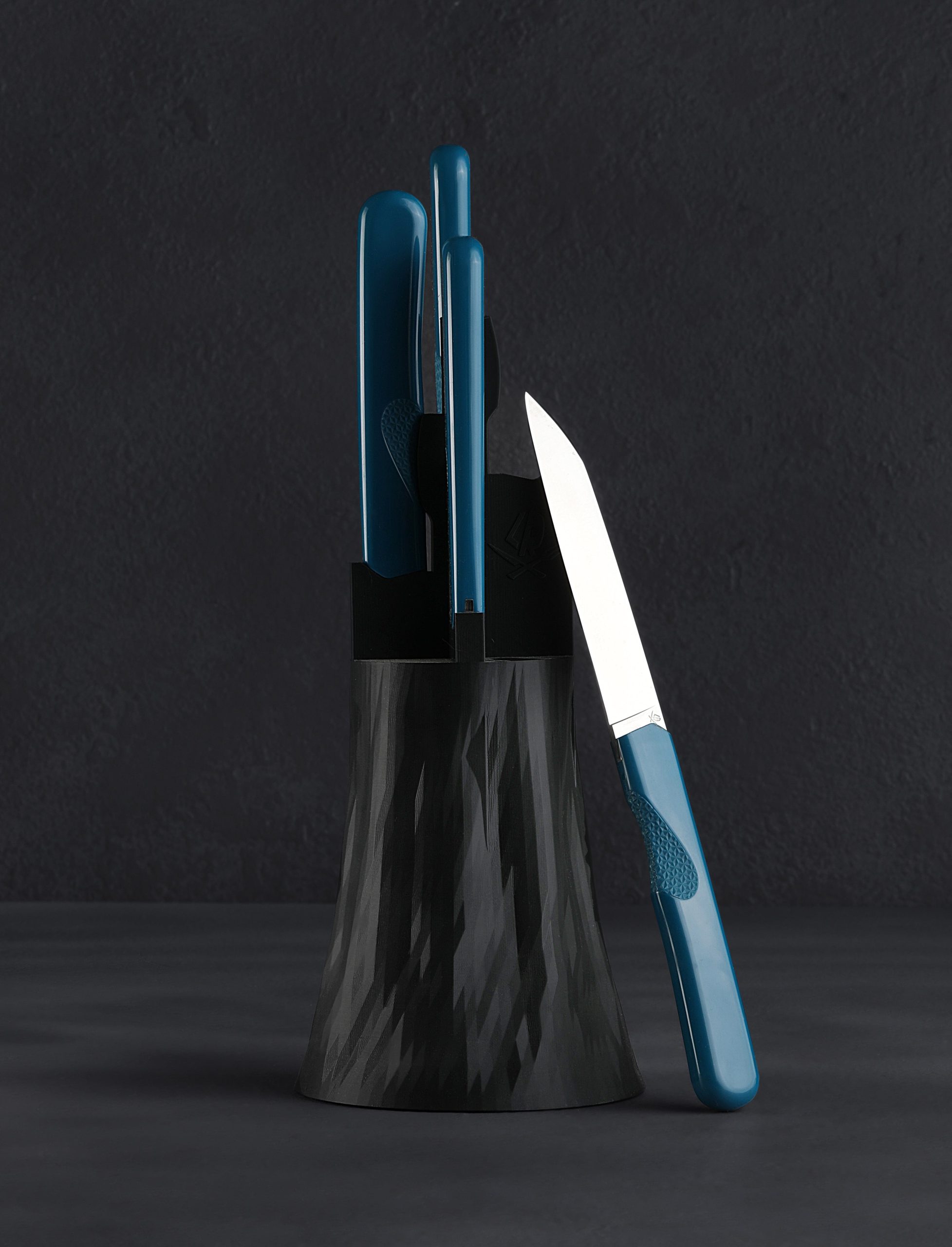 Roland Lannier’s new minimalistic and sleek steak knives from his Cut the Bullsh*t collection, crafted as four-knife sets, are available in white, azure, maroon, and black. Thin, long, and sharp blades are designed for versatile cutting at the dinner table. Made from durable and high heat-resistant ABS terpolymer, each handle has a smooth finish with a textured finger grip that effortlessly connects your hand to the process of cutting for optimal ease and comfort. These steak knives perform well and add a decorative element to any kitchen, while taking up little space, as they rest in an upright, simple and modern black stand designed and printed at Roland’s studio in Thiers, France.