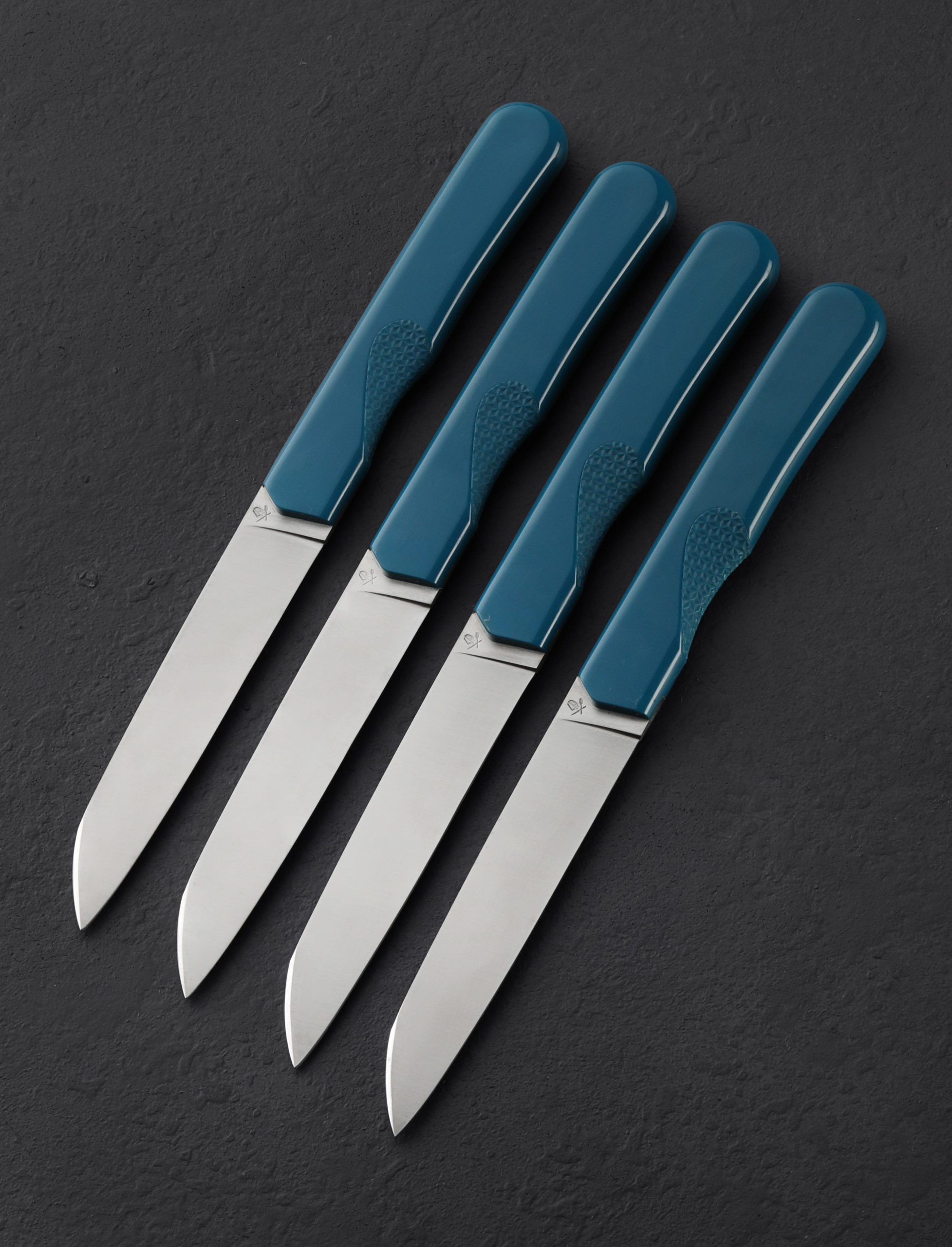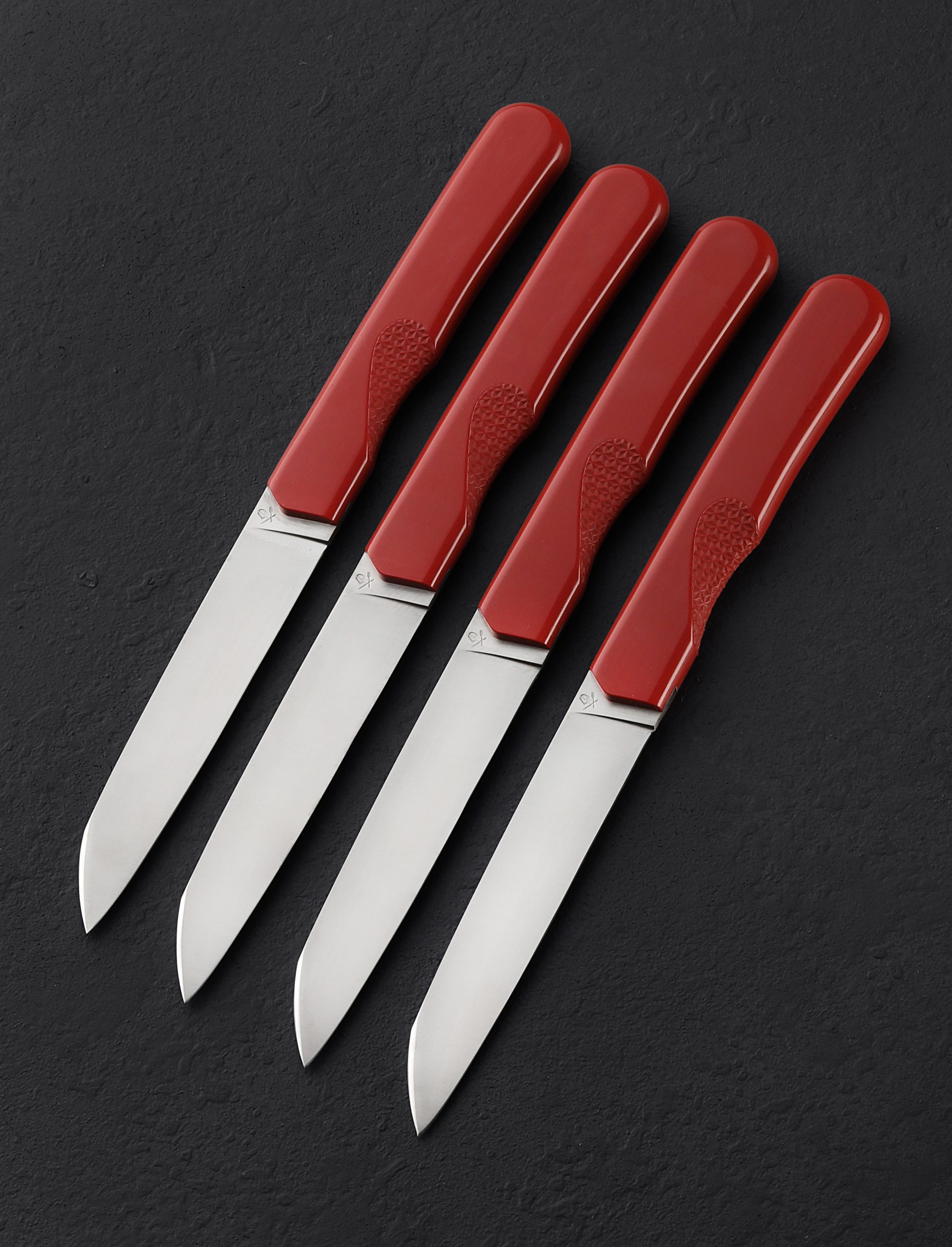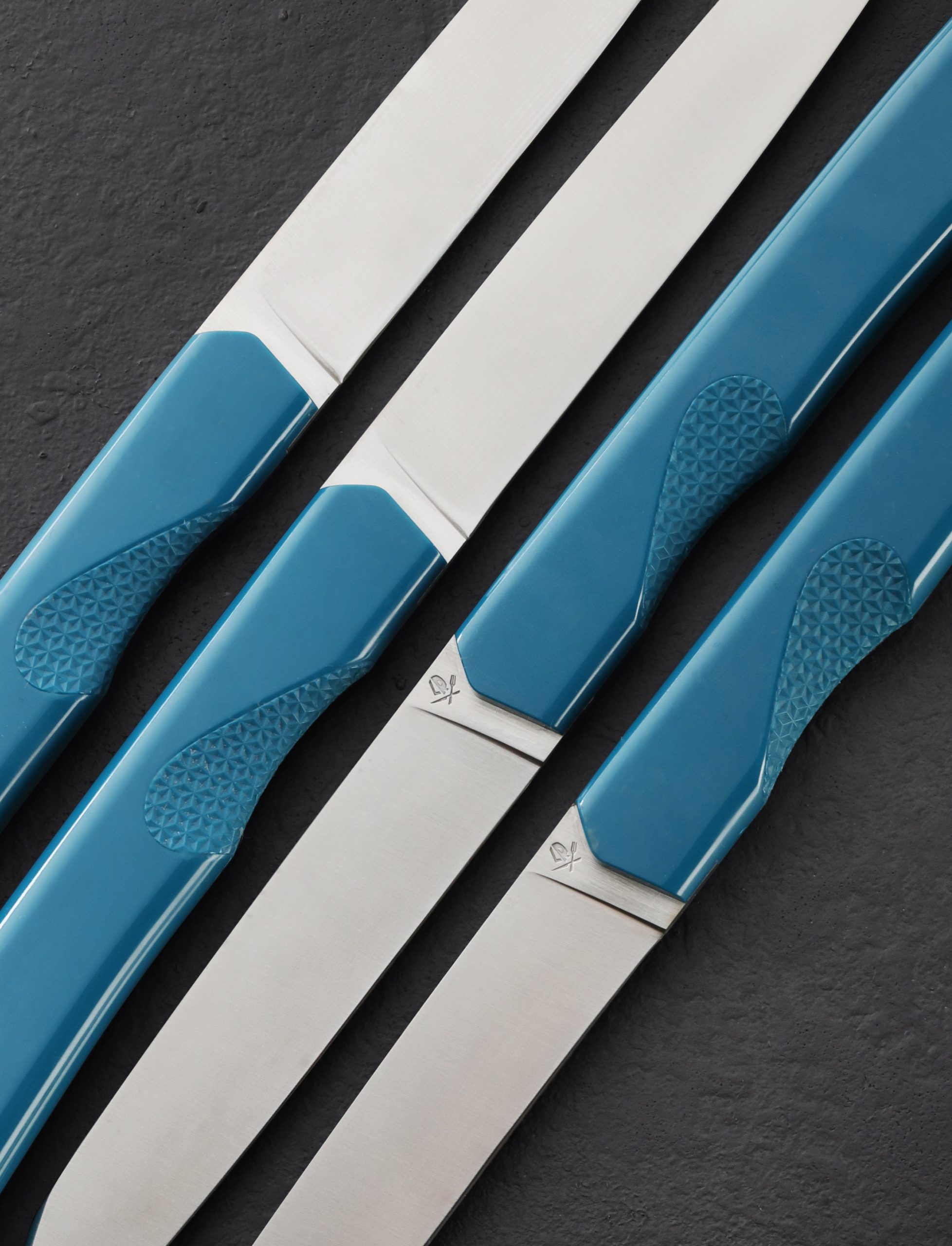 Roland Lannier’s new minimalistic and sleek steak knives from his Cut the Bullsh*t collection, crafted as four-knife sets, are available in white, azure, maroon, and black. Thin, long, and sharp blades are designed for versatile cutting at the dinner table. Made from durable and high heat-resistant ABS terpolymer, each handle has a smooth finish with a textured finger grip that effortlessly connects your hand to the process of cutting for optimal ease and comfort. These steak knives perform well and add a decorative element to any kitchen, while taking up little space, as they rest in an upright, simple and modern black stand designed and printed at Roland’s studio in Thiers, France.