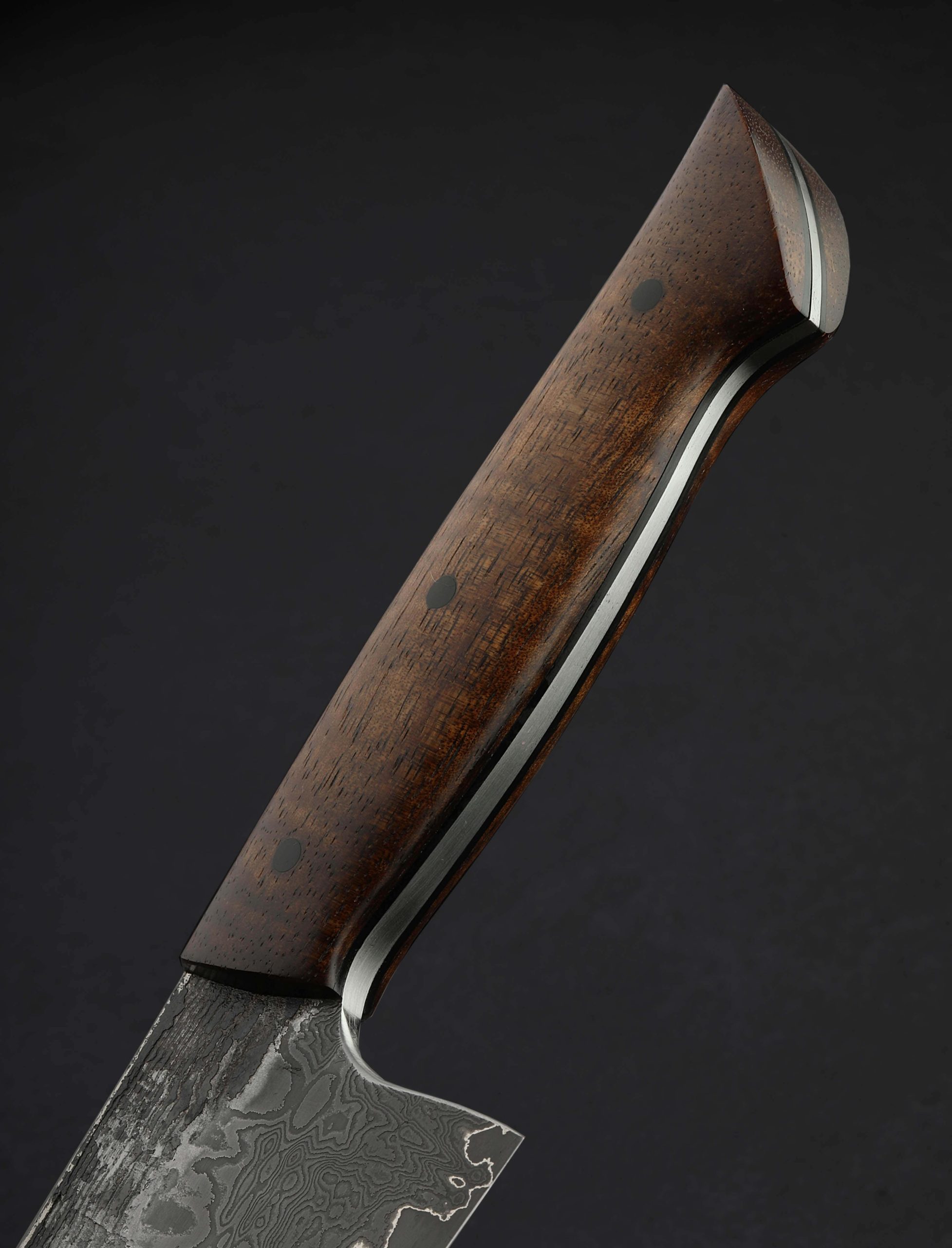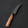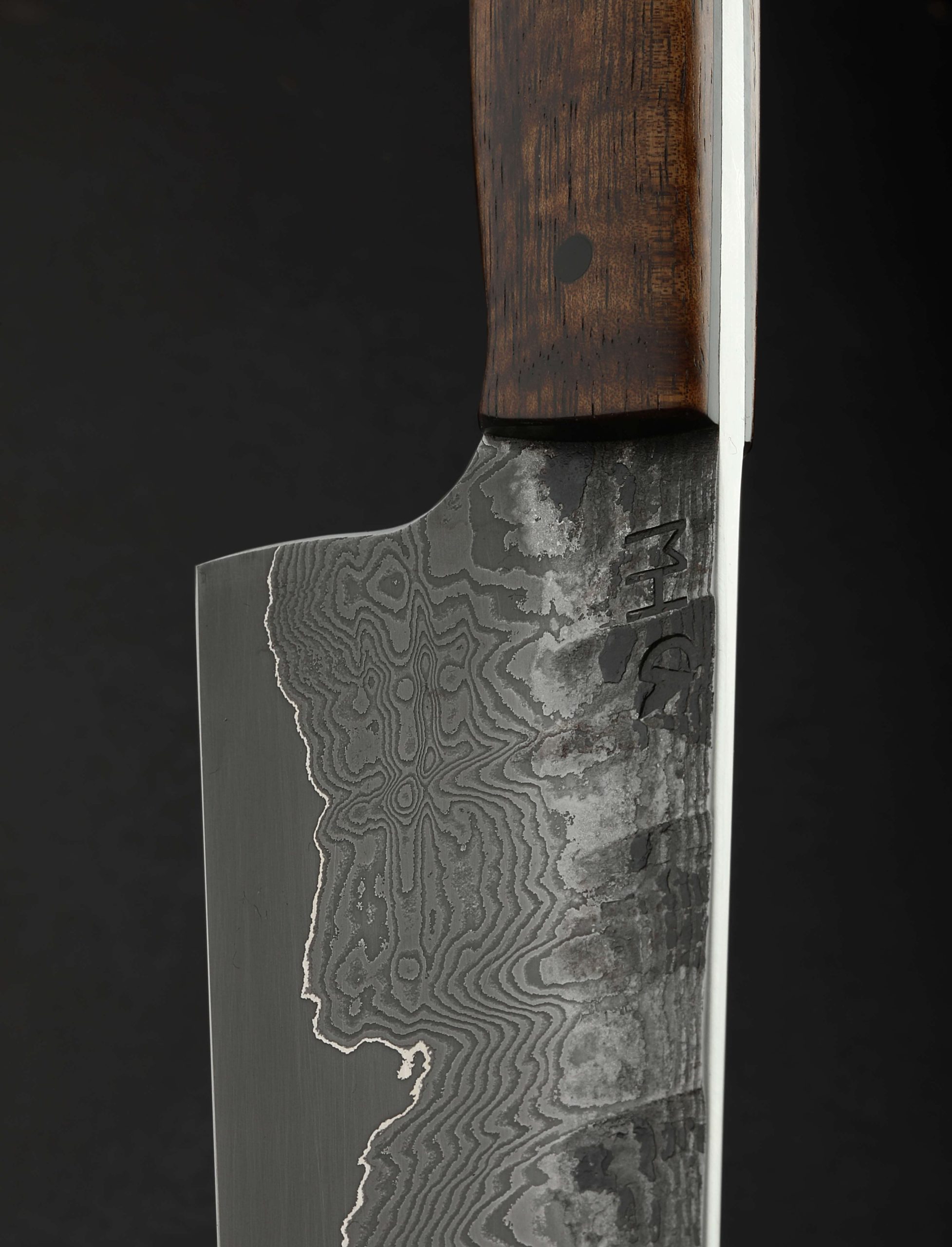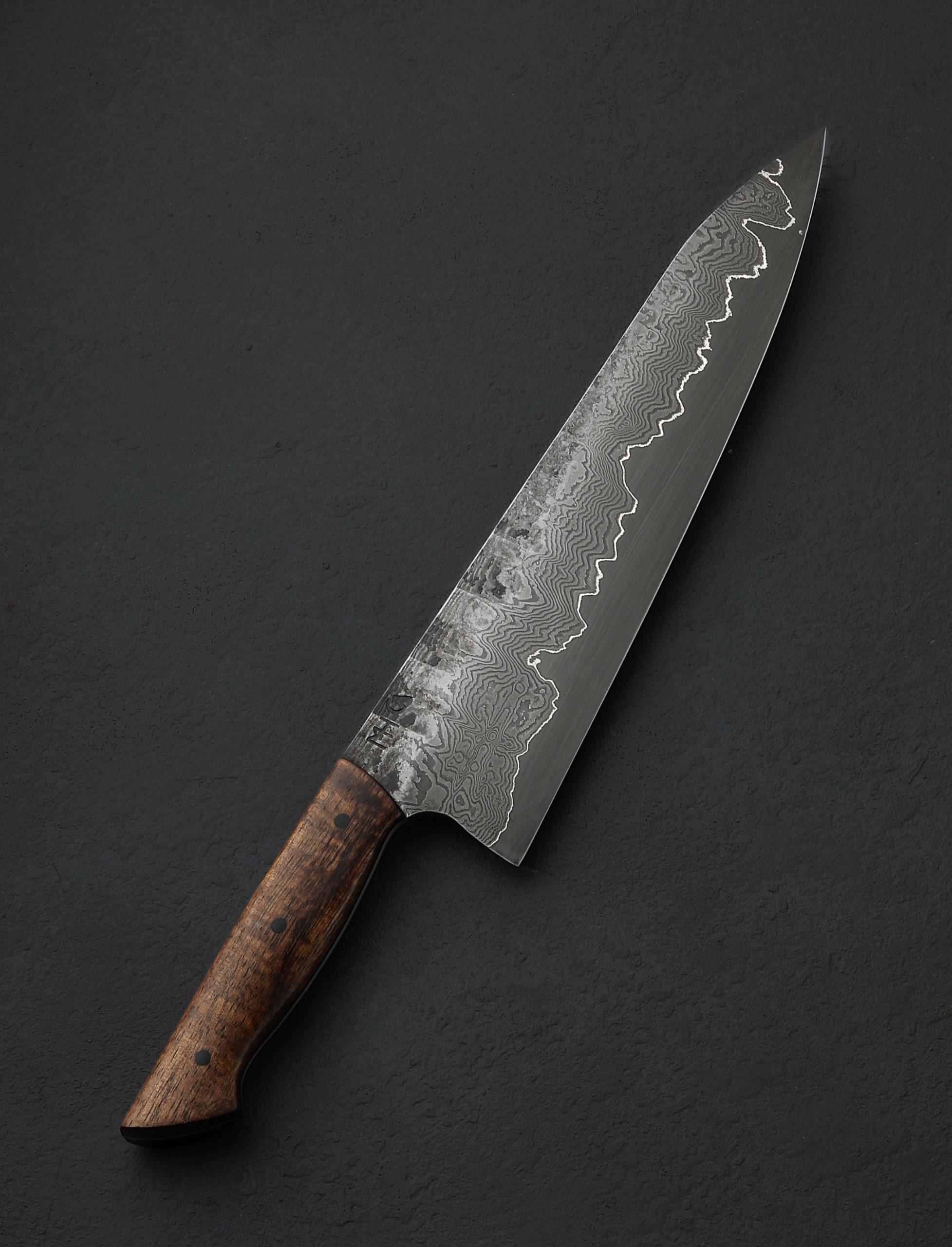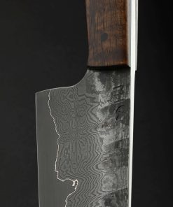 In full-tang construction with damascus-clad homemade steel formula comes a Western-style workhorse chef knife forged by Austrian designer and bladesmith Martin Huber. Rarely seen from Martin, known for his more common wa-style handles and Eastern profiles, this Western build features a beautifully balanced, full-size 233mm / 9.2″ blade with a polished spine that measures 4mm across at the maker’s mark and then tapers both backward between the handle scales, and forwards to a fine, needle-like tip. Textured, forge-finished flats show the marks of the blade’s hand-hammered origins, with 120 layers of carbon damascus steel dripping down through the tough, beautifully honed convex bevels, culminating at a vein of pure nickel which reduces carbon diffusion, the build culminating at a thin, hard, razor-sharp edge of 1.2419 tungsten-carbon steel. The rounded spine and choil provide comfort and soft touch in the pinch grip, with striking, sculpted acacia over black micarta liners completing the hand-hugging handle. A knife built for the rigors of the kitchen’s daily demands, with the style and heritage to pass down through the generations.