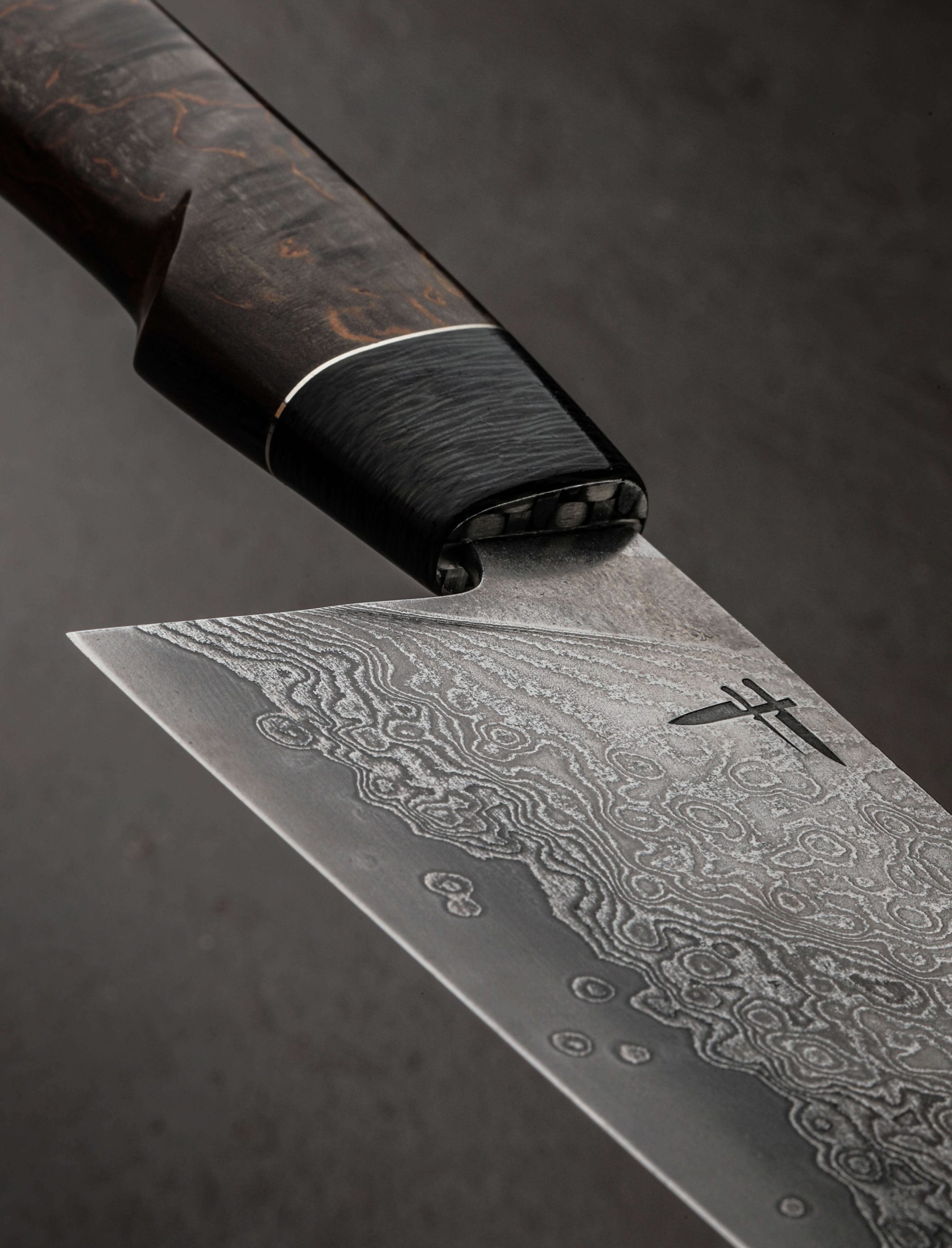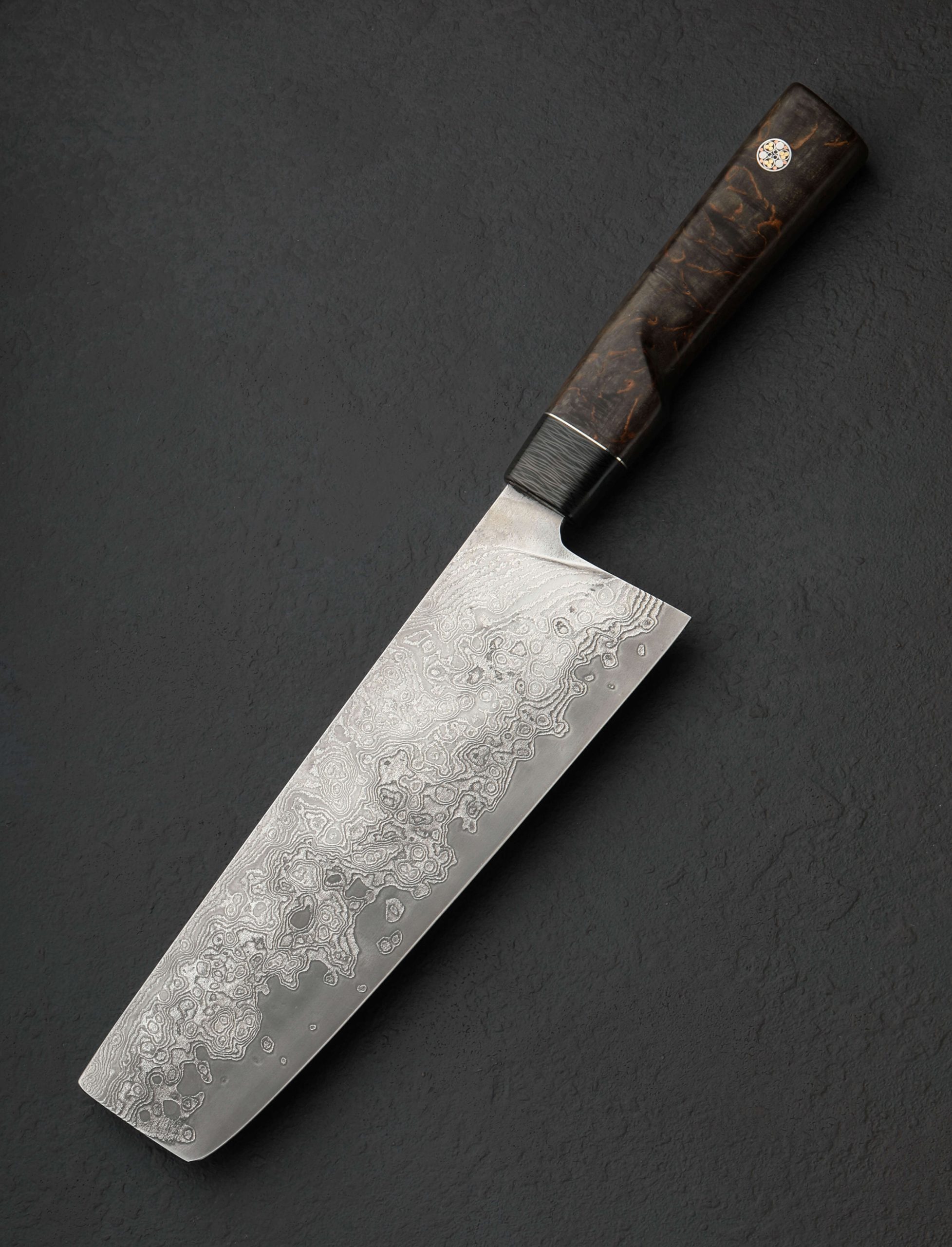 Standing 67mm tall at the heel with 200mm / 7.9″ of thin, sharp edge in VG10 stainless steel below layered suminagashi cladding, this one-of-a-kind vegetable cleaver by maker Fingal Ferguson is ideal for quick and efficient chopping. Forged at his family farm, Gubbeen, in Ireland’s south-west, this knife is fit to be any chef’s go-to for daily vegetable processing. The blade’s spine tapers slightly from 2.5mm wide above the tall, 67mm-high heel to 2mm at the tip-less end, thick enough to provide strength but thin enough keep the knife light and balanced. Power and stability come naturally with this tool, its 7.3oz / 206g of total mass centered at the point that handle meets blade. A hidden-tang build in shield profile with a striking combination of curly birch and carbon fiber in Fingal’s trademark design, the handle provides comfort and control over every cut, with his trademark mosaic pin completing the handsome build.