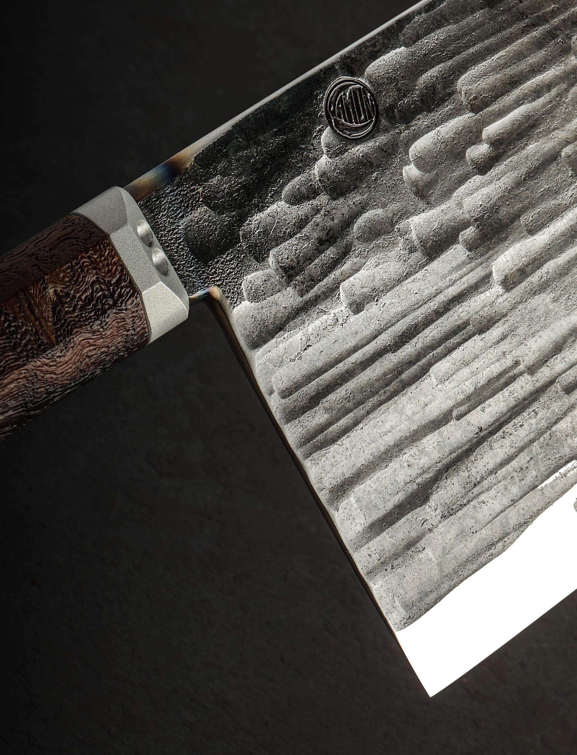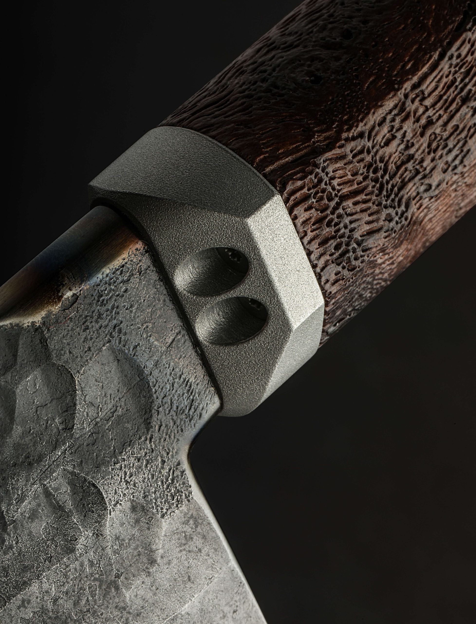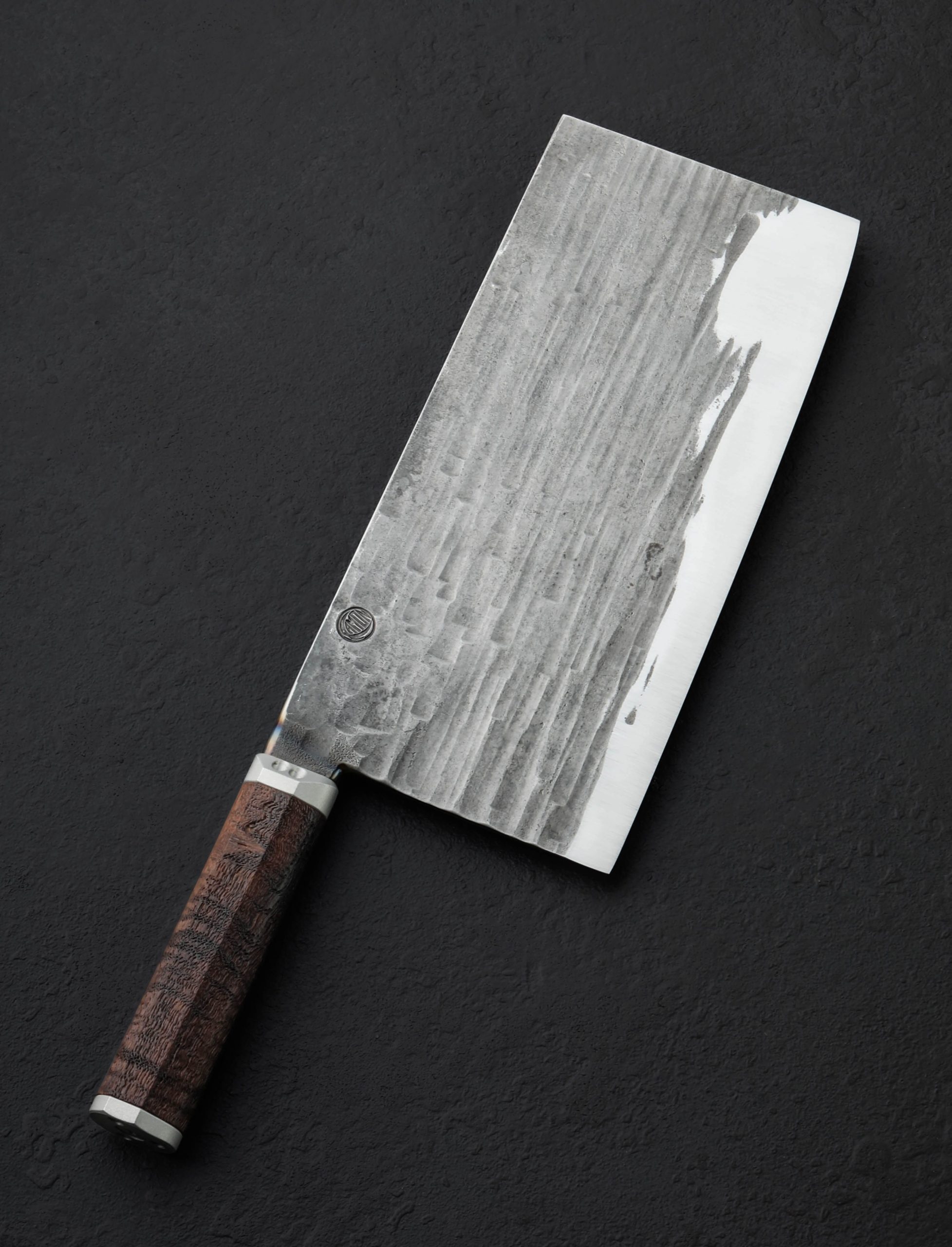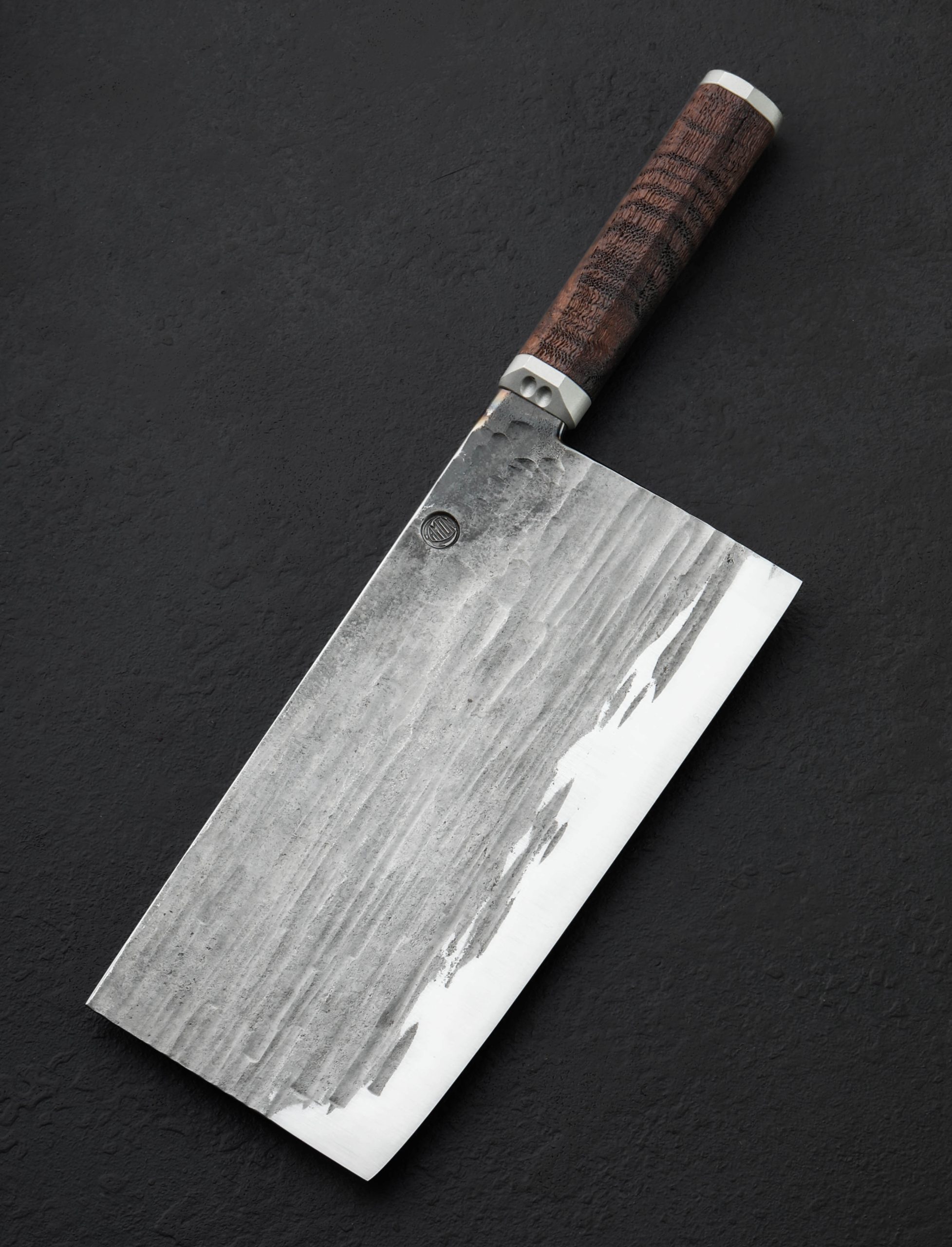 Each culinary creation by bladesmith Benjamin Kamon is a work of art, engineering, and craftsmanship. For this 200mm long by 100mm tall vegetable cleaver forged by hand from ApexUltra high-performance carbon steel, that certainly holds true. Thin, light, and imparting a wonderfully rewarding sensation on any chef lucky enough to grasp its handle, this is, as Benjamin himself puts it, “a special one.” Wave texturing with a wabi sabi-esque kurouchi finish sits below the rounded, polished spine and above the especially slim, convex primary bevels and razor-sharp, very hard (67 HRC) edge. As the blade’s flats morph into a short-neck tang, the ApexUltra enjoys a subtle rainbow heat coloring before disappearing into the handle’s Torpedo-style front cap of bead blasted aluminum. For the bulk of the shield profile-inspired wa handle, Benjamin rounding the top and bottom at different radius’ with flat planes on the left and right, is a stunning piece of curly walnut that has been an advanced rokkaku hanmaru texture for a beautiful aesthetic unique tactile experience. Matching the front cap, an aluminum butt cap with screws for handle removal completes the build. A custom saya is included.
