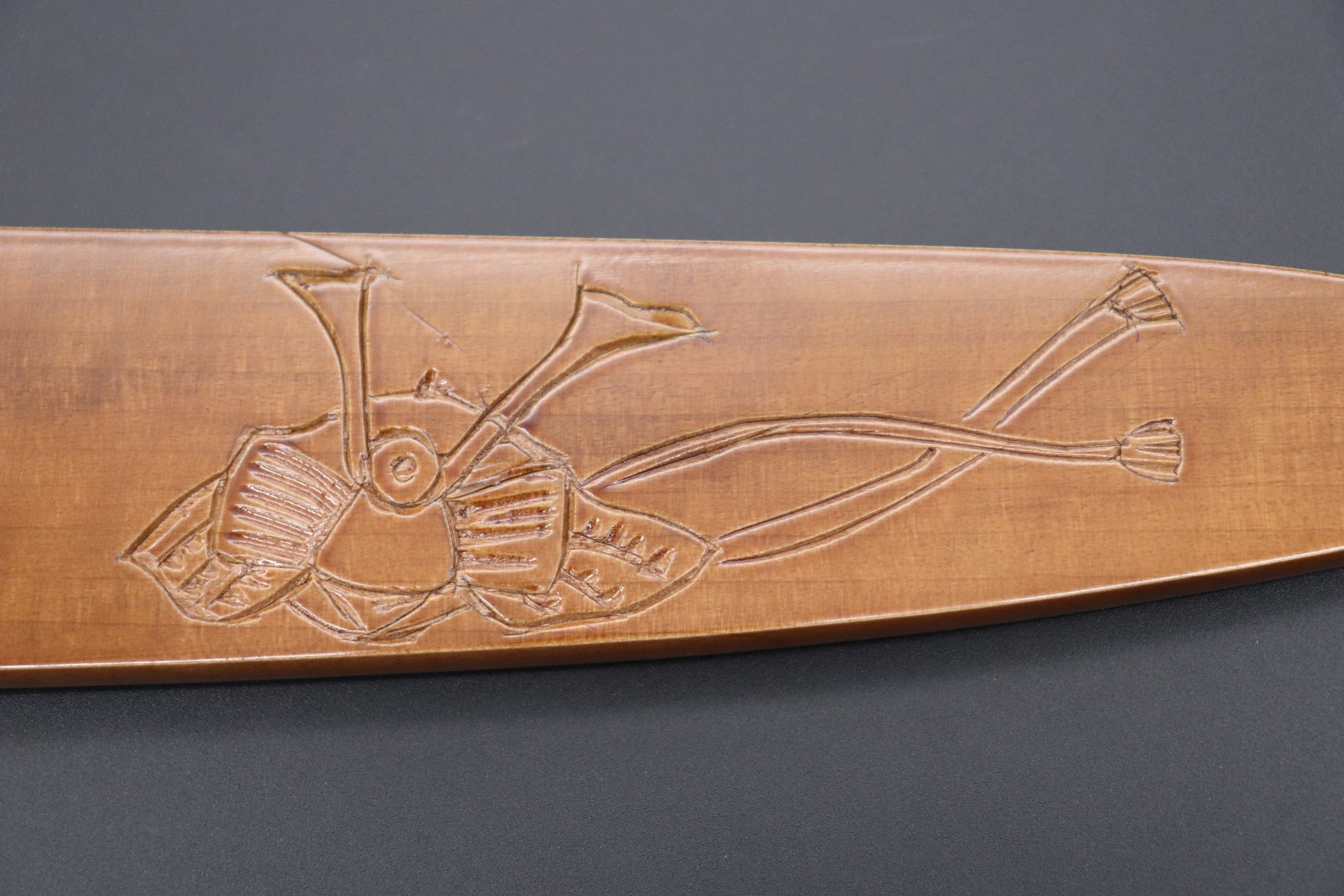 Each Special Edition Wooden Saya has been custom hand carved with a design motif inspired by Japan’s beautiful scenery, nature or culture. This one, is the “Kabuto Special Edition Hand Carved Saya” (Kabuto are a type of helmet historically worn by Samurai).
