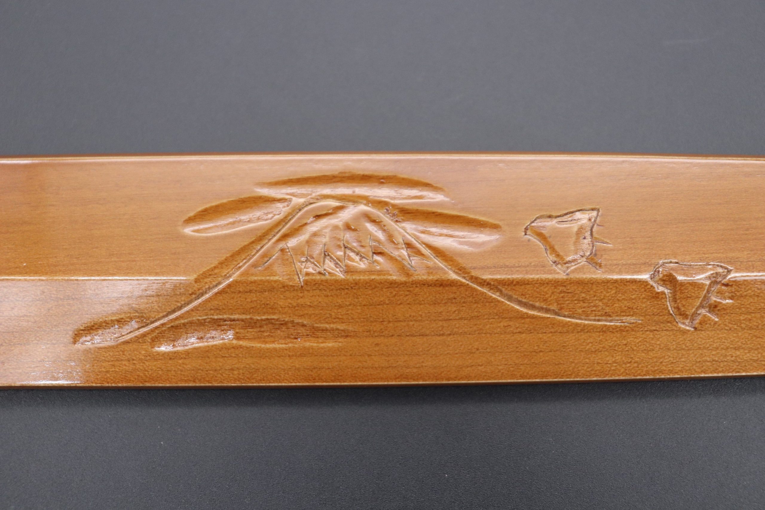 Each Special Edition Wooden Saya has been custom hand carved with a design motif inspired by Japan’s beautiful scenery, nature or culture. This one, is the “Mt. Fuji Special Edition Hand Carved Saya”.
