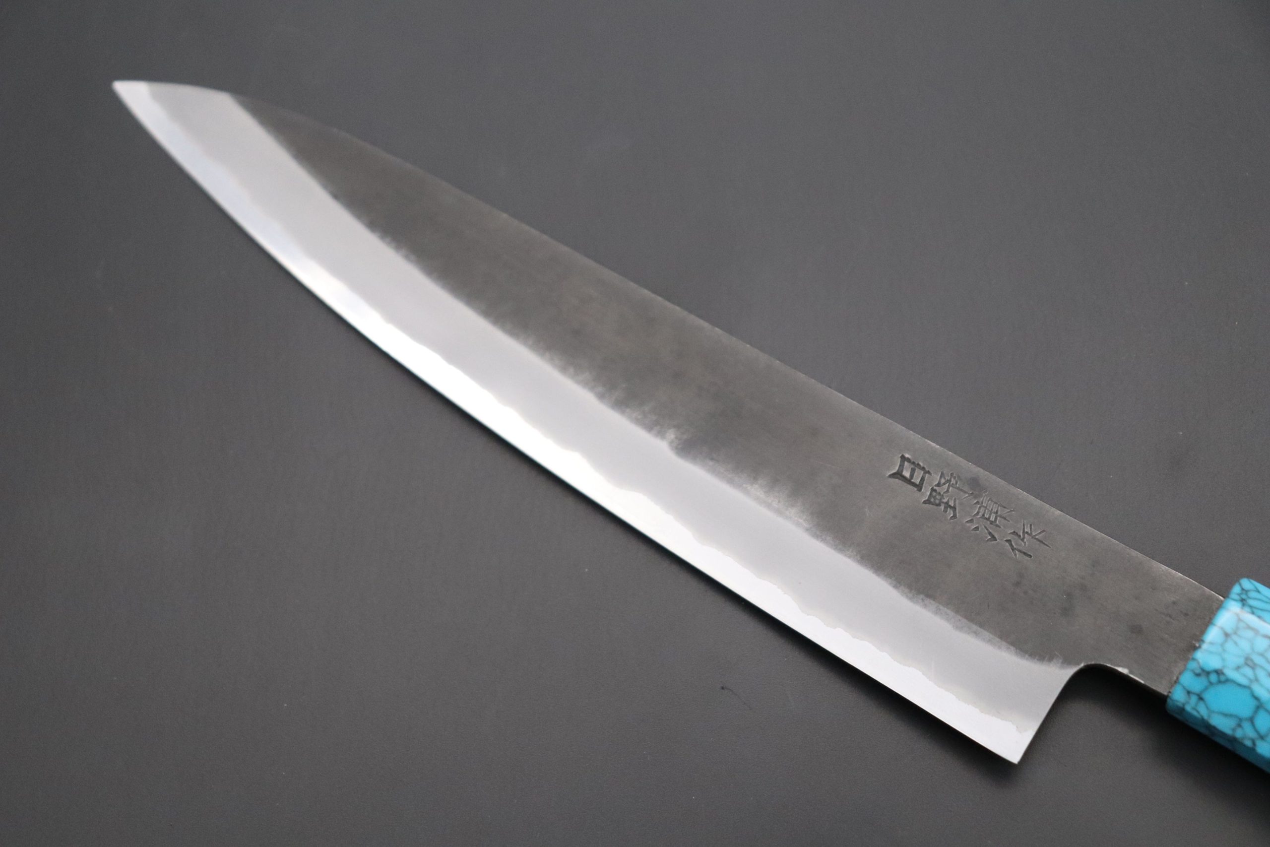 This is the Custom Limited Edition Special Knife Collection. Beautifully polished and finished, Hinoura’s natural gradation color and taste of the modern & traditional Kurouchi Wa Gyuto Knife is fitted a with a Innovative Octagonal Ebonywood Handle with Nickel Silver Spacers and a Turquoise Composite Stone Ferrule & Butt. Please feel the harmony of the traditional historical art and modern, high-sense design, quality.