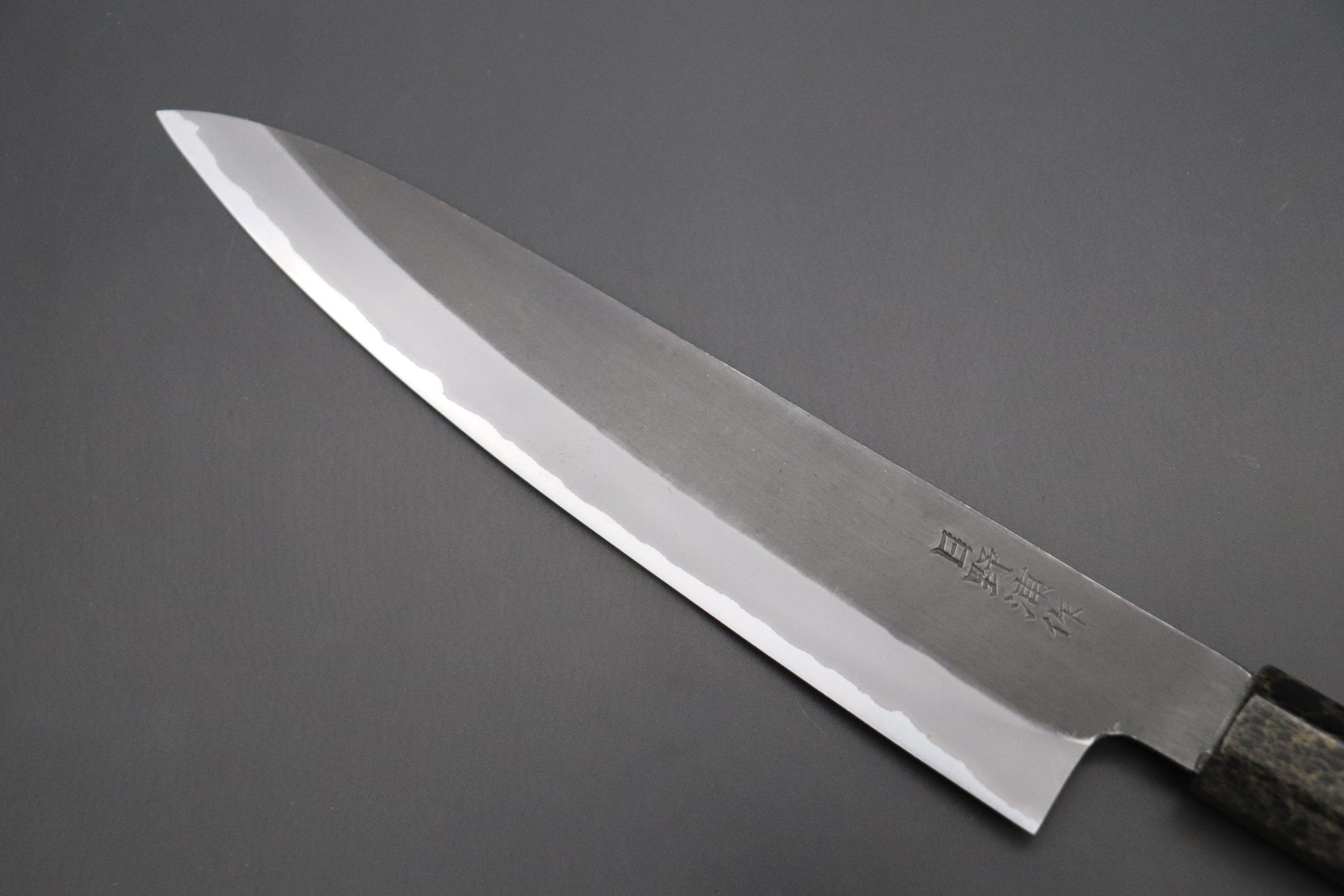Although some people consider Master Honoura’s knives to be thick and heavy, their geometry is the result of carefully considering every aspect of their function. Contrary to what you might expect, the process of forging a thick blade ‘to shape’ actually requires a lot of time and skill. Master Honoura’s knives are nicely tapered from their heel to the tip and from their spine down to the cutting edge, which is ground very thin behind the edge. We are confident that these knives will provide the high cutting performance that is demanded by Carbon steel lovers!