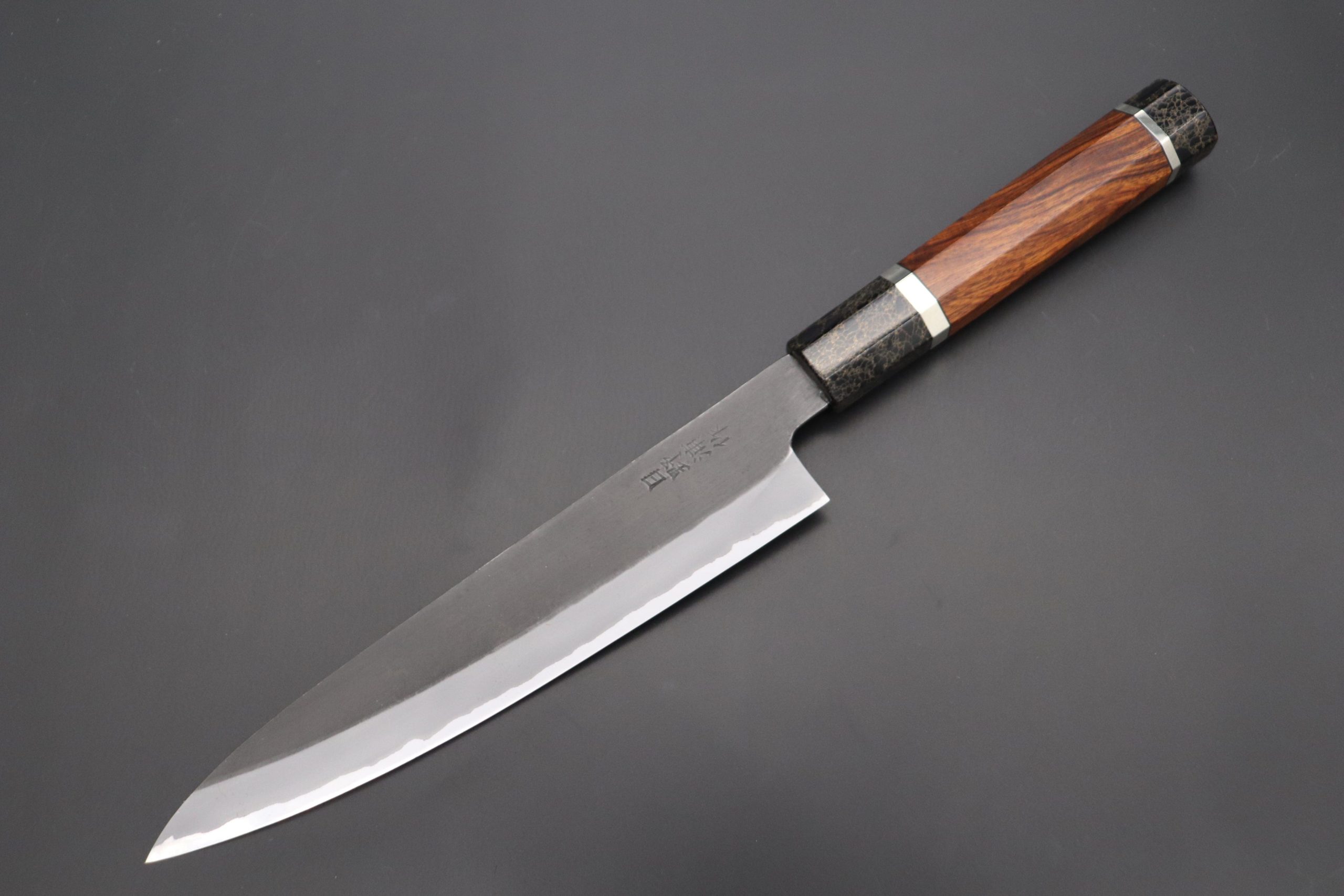 This is the Custom Limited Edition Special Knife Collection. Beautifully polished and finished, Hinoura’s natural gradation color and taste of the modern & traditional Kurouchi Wa Gyuto Knife is fitted a with a Innovative Octagonal Desert Ironwood Handle with Nickel Silver Spacers and a Black-Golden- Color Turquoise Composite Stone Ferrule & Butt. Please feel the harmony of the traditional historical art and modern, high-sense design, quality.