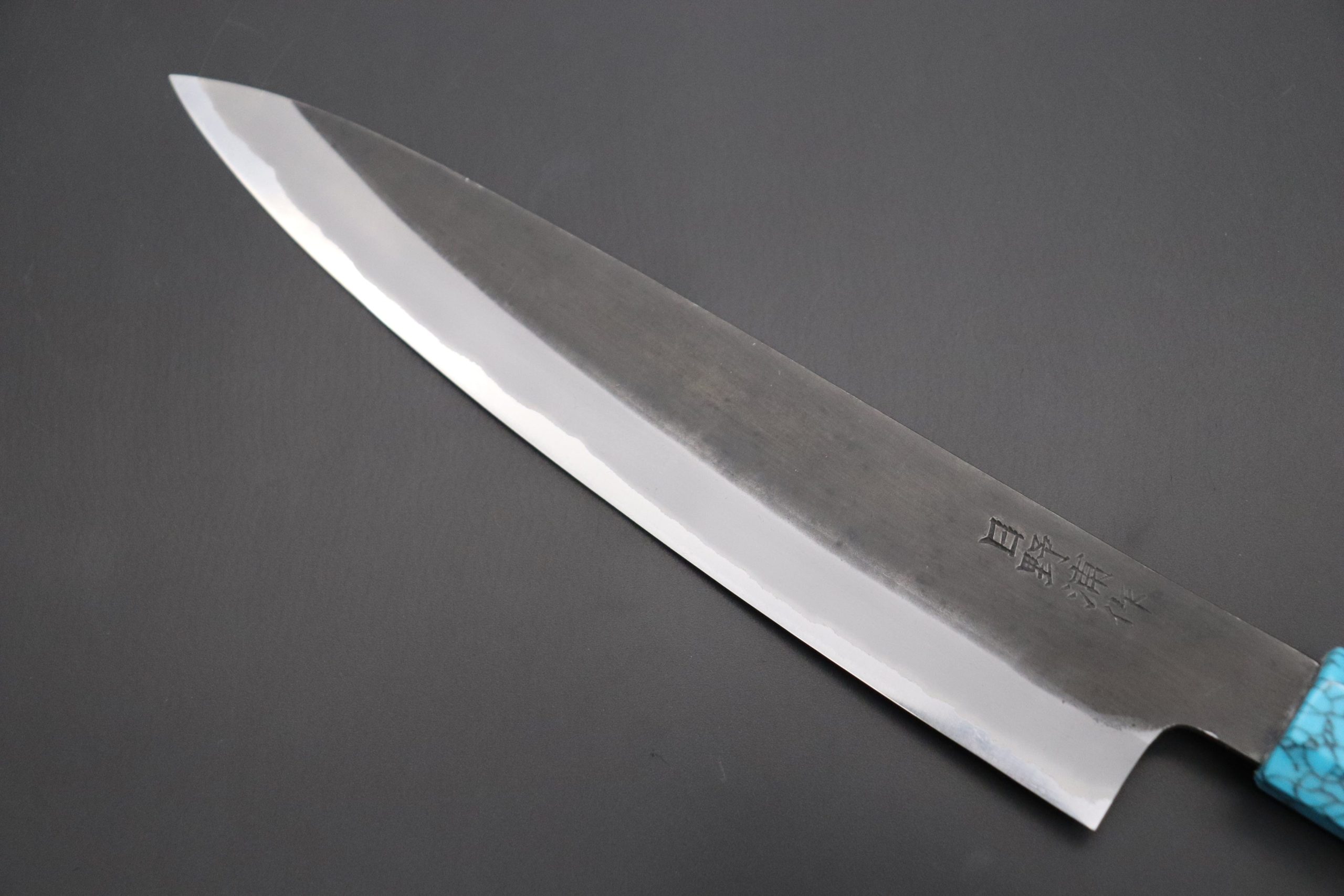 This is the Custom Limited Edition Special Knife Collection. Beautifully polished and finished, Hinoura’s natural gradation color and taste of the modern & traditional Kurouchi Wa Gyuto Knife is fitted a with a Innovative Octagonal Olivewood Handle with a Turquoise Composite Stone Ferrule & Butt with White Spacers. Please feel the harmony of the traditional historical art and modern, high-sense design, quality.