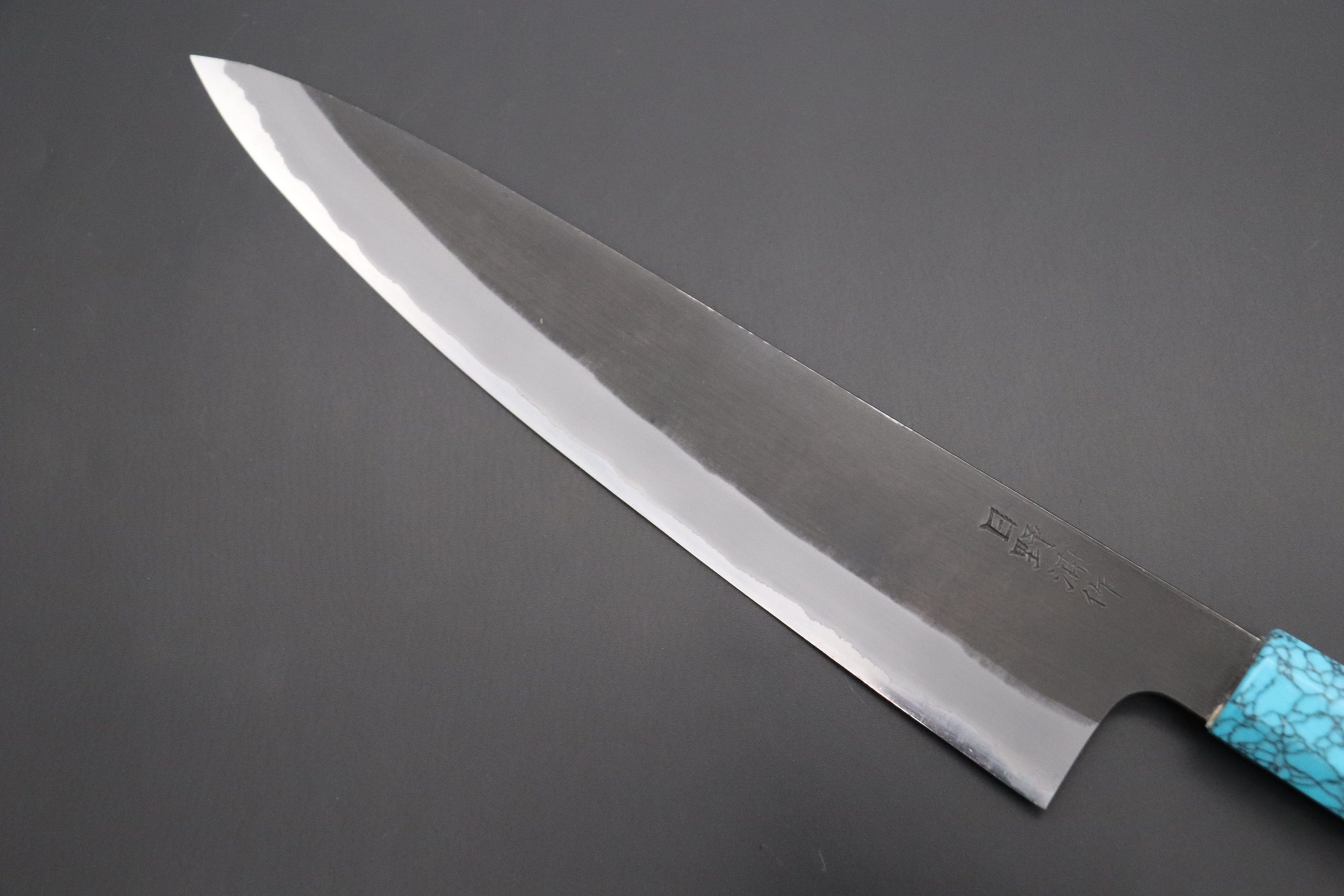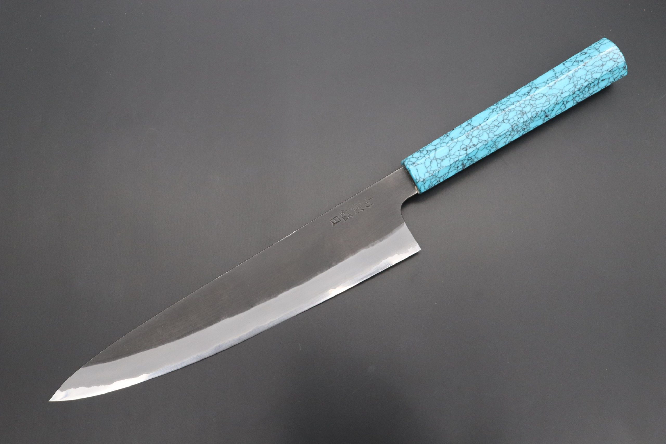 This is the Custom Limited Edition Special Knife Collection. Beautifully polished and finished, Hinoura’s natural gradation color and taste of the modern & traditional Kurouchi Wa Gyuto Knife is fitted a with a Innovative Octagonal Turquoise Composite Stone Handle. Please feel the harmony of the traditional historical art and modern, high-sense design, quality.
