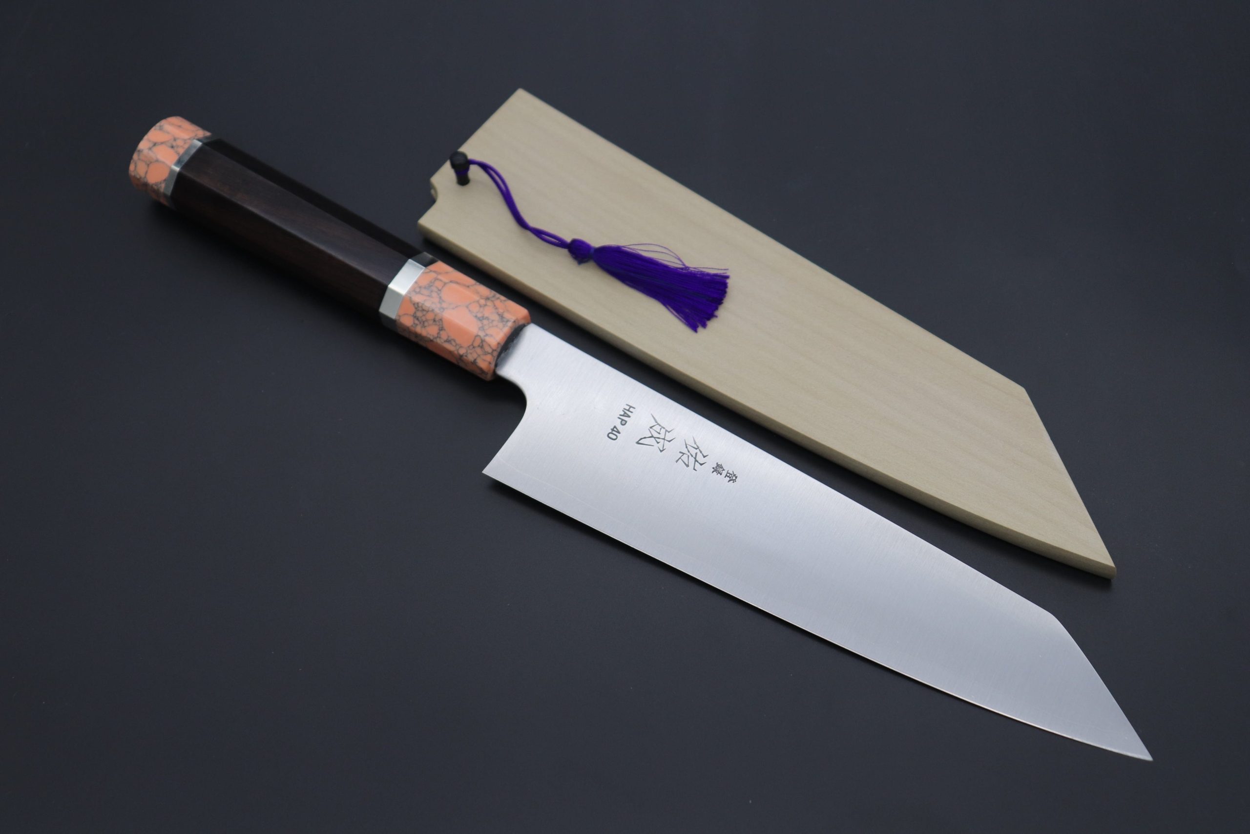This Custom Limited Edition Sukenari HAP-40 Clad Kiritsuke knife is fitted with a Innovative Octagonal Ebonywood Handle with Nickel Silver Spacers and Soft Pink Color Turquoise Composite Stone Ferrule & Butt. A matching Magnolia wood Saya (Sheath) with a black pakkawood Saya pin is also included with the knife.