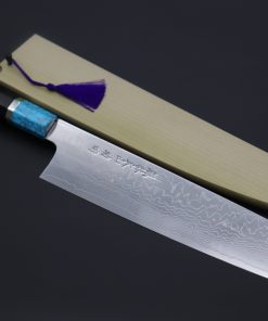This Custom Limited Edition Sukenari HAP-40 Clad Kiritsuke knife is fitted with a Innovative Octagonal Carbon Fiber Handle with Composite Black Color Turquoise Gemstone Ring and Nickel Silver Spacers. A matching Magnolia wood Saya (Sheath) with a black pakkawood Saya pin is also included with the knife.