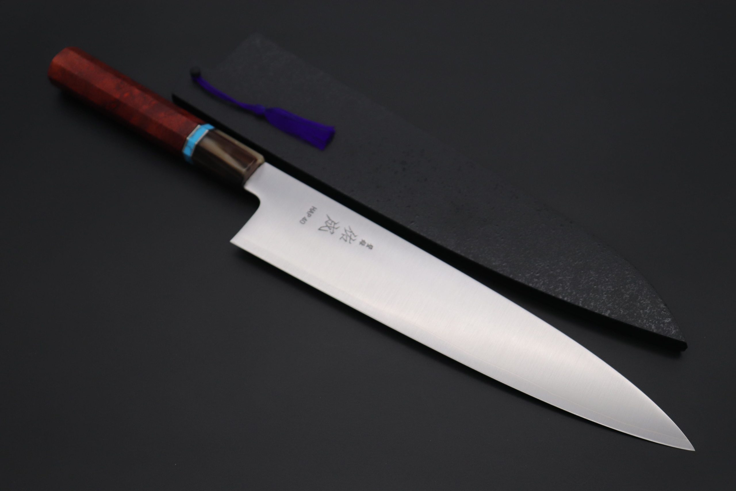 This Custom Limited Edition Sukenari HAP-40 Clad Wa Gyuto knife is fitted with a Innovative Octagonal Bubinga Burl Wood Handle with Marble Color Water Buffalo Horn Ferrule and Composite Turquoise Gemstone Ring and Nickel Silver Spacers. A matching Black Lacquered wood Saya (Sheath) with a black pakkawood Saya pin is also included with the knife.