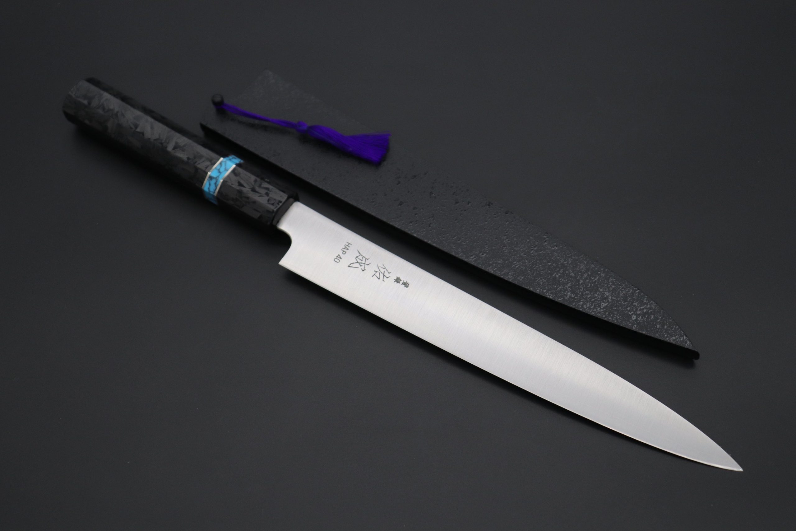 This Custom Limited Edition Sukenari HAP-40 Clad Wa Sujihiki knife is fitted with a Innovative Octagonal Carbon Fiber Handle with Composite Turquoise Gemstone Ring and Nickel Silver Spacers. A matching Black Lacquered wood Saya (Sheath) with a black pakkawood Saya pin is also included with the knife.