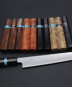 This Custom Limited Edition Sukenari HAP-40 Clad Wa Sujihiki knife is fitted with a Innovative Octagonal Bubinga Burl Wood Handle with Marble Color Water Buffalo Horn Ferrule and Composite Turquoise Gemstone Ring and Nickel Silver Spacers. A matching Black Lacquered wood Saya (Sheath) with a black pakkawood Saya pin is also included with the knife.