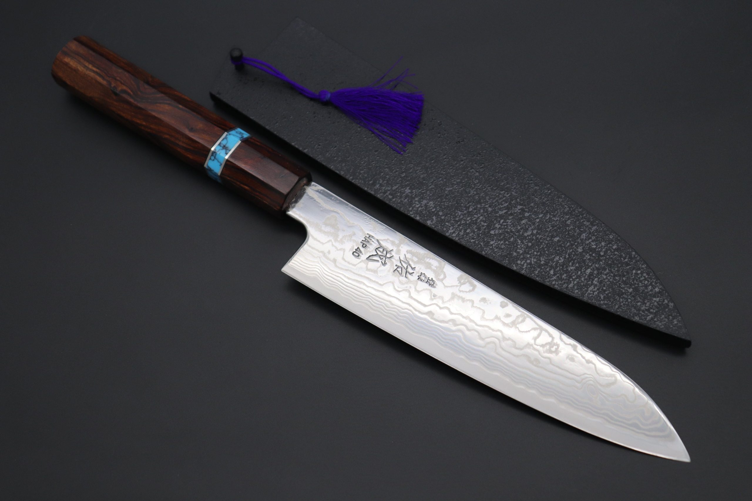 This Custom Limited Edition Sukenari HAP-40 Nickel Damascus Wa Santoku knife is fitted with a Innovative Octagonal Desert Ironwood Handle with Composite Turquoise Gemstone Ring and Nickel Silver Spacers. For safekeeping, this knife comes with a matching Black Lacquered wood Saya (Sheath) with a black pakkawood Saya pin.