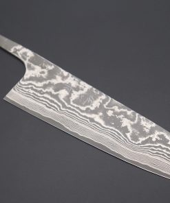 The HAP-40 core blade steel (HRc. 68) is forge-welded with Stainless Damascus steel cladding, which is made with alternating layers of Nickel Steel and Stainless Steel. The blade is beautifully mirror polished and finished so that the white color of Nickel Steel layers vividly contrast with the glossy silver color of the Stainless Steel layers.