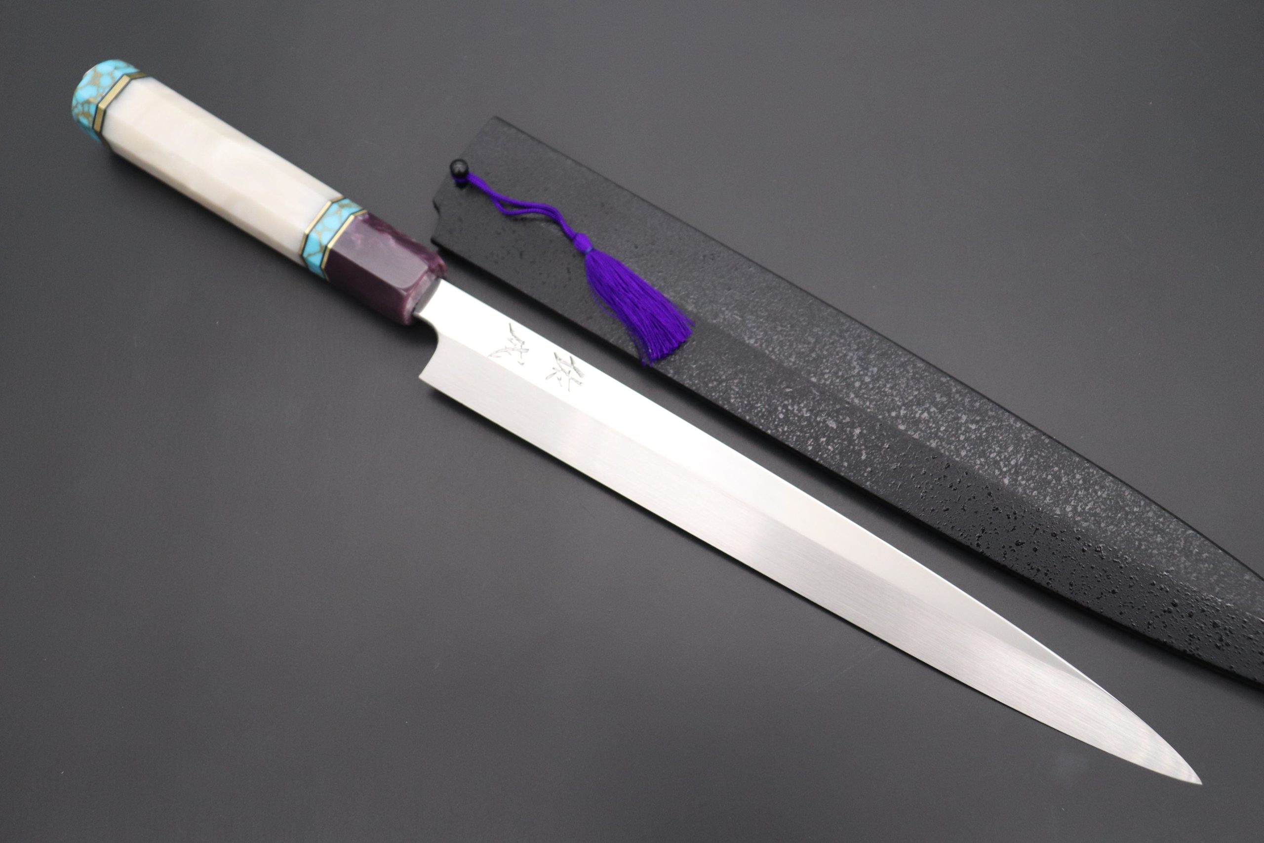 We decided to fit this new, futuristic generation of high-end Honyaki blades with Custom Handmade Octagonal Handle (Resin body and ferrule, Turquoise Composite Stone collar and endcap with Nickel Silver and Black Liner spacers). For safekeeping, this knife comes with a matching Black Lacquered Saya (Sheath) with a black pakkawood Saya pin.