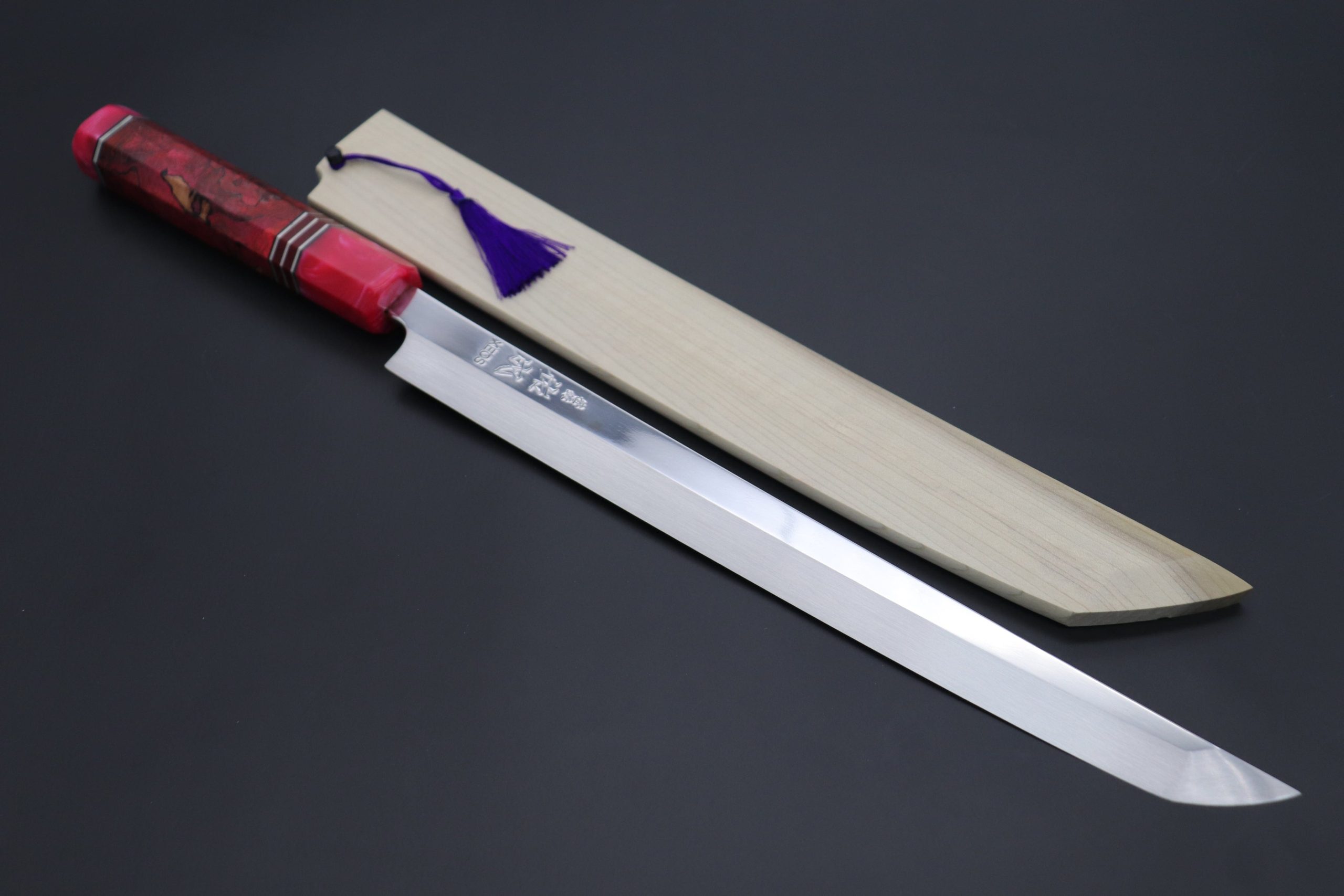 We decided to fit this new, futuristic generation of high-end Honyaki blades with Handmade, Custom Octagonal Handle (Forging-Fire-Red-Colored Stabilized and Dyed Spalted Maple body, Resin ferrule and endcap, G10 collar with Nickel Silver and Black Liner spacers) For safekeeping, this knife comes with a matching handcrafted Magnolia Wood Saya (Sheath) with a black pakkawood Saya pin.