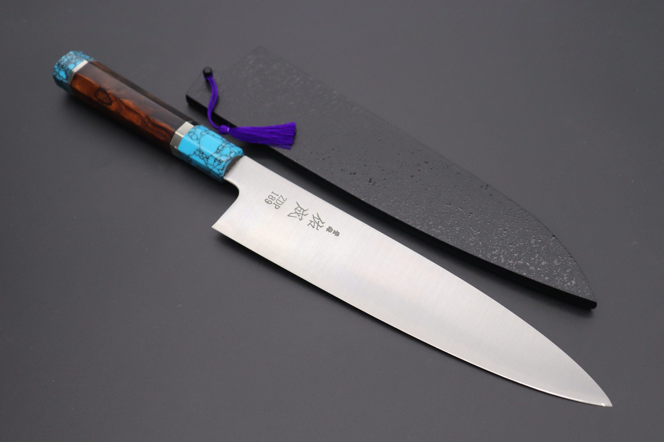 This Custom Limited Edition Sukenari ZDP-189 Clad Wa Gyuto knife is fitted with a Innovative Octagonal Desert Ironwood Handle with Nickel Silver Spacers and a Turquoise Composite Stone Ferrule & Butt. A matching Black Lacquered wood Saya (Sheath) with a black pakkawood Saya pin is also included with the knife.