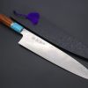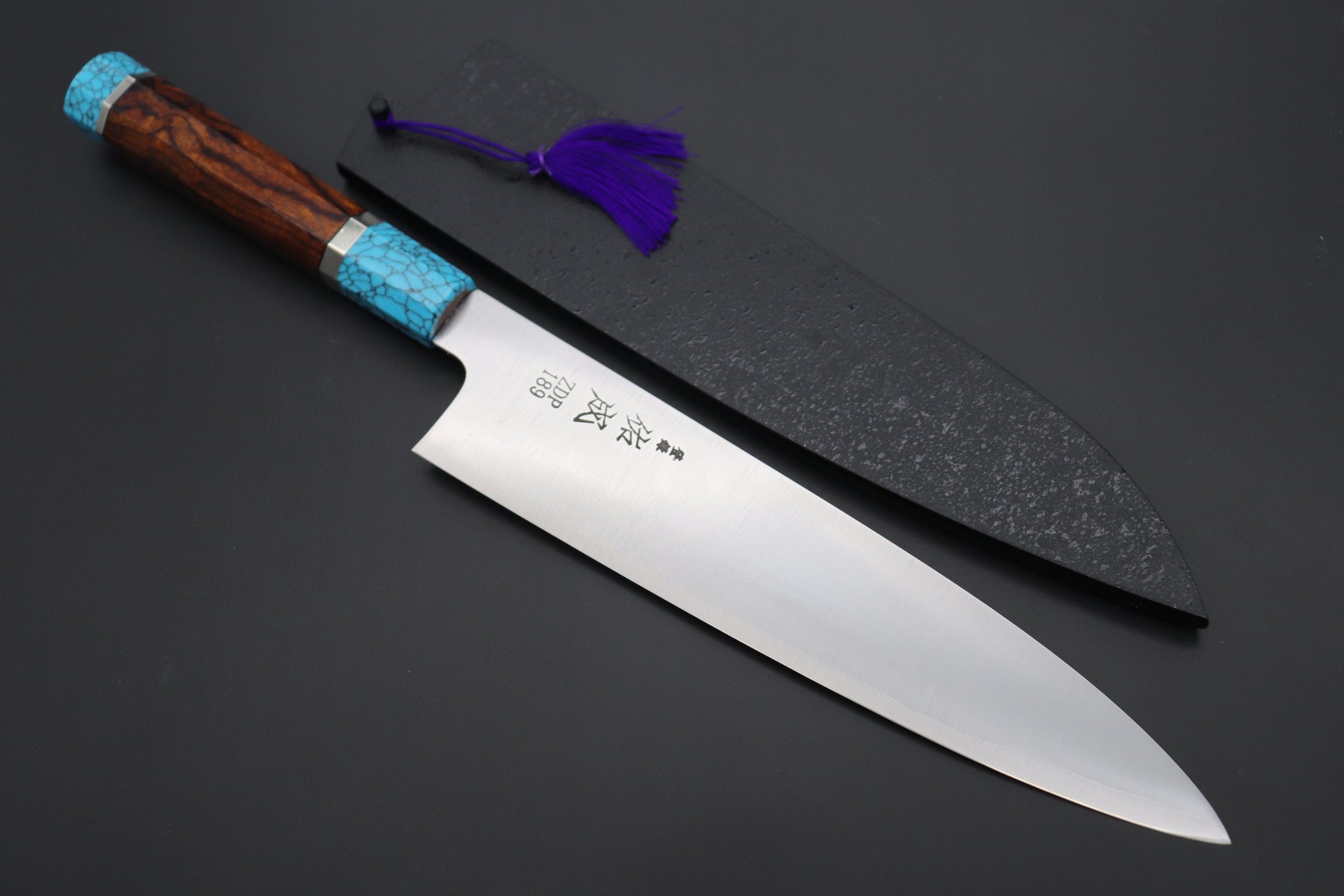 This Custom Limited Edition Sukenari ZDP-189 Clad Wa Gyuto knife is fitted with a Innovative Octagonal Desert Ironwood Handle with Nickel Silver Spacers and a Turquoise Composite Stone Ferrule & Butt. A matching Black Lacquered wood Saya (Sheath) with a black pakkawood Saya pin is also included with the knife.