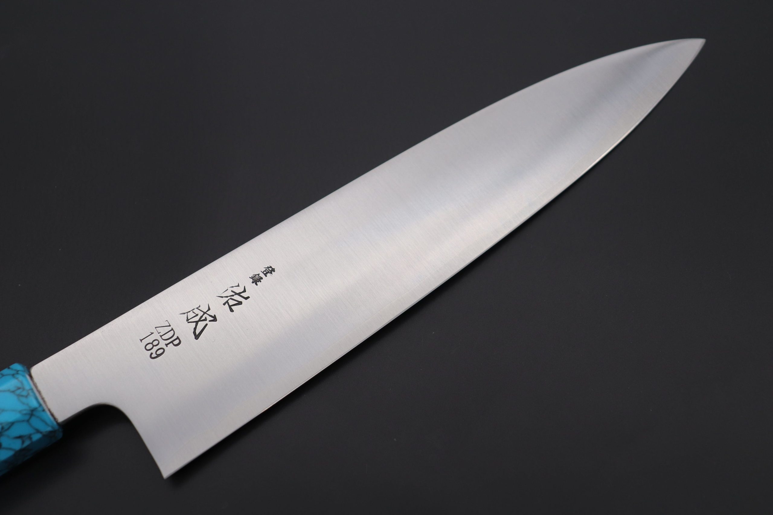 This Custom Limited Edition Sukenari ZDP-189 Clad Wa Gyuto knife is fitted with a Innovative Octagonal Turquoise Composite Stone Ferrule & Butt. A matching Black Lacquered wood Saya (Sheath) with a black pakkawood Saya pin is also included with the knife.