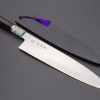 This Custom Limited Edition Sukenari ZDP-189 Clad Wa Gyuto knife is fitted with a Innovative Octagonal Ebonywood Handle with Nickel Silver Spacers and a Royal Purple Composite Stone Ferrule & Butt. A matching Black Lacquered wood Saya (Sheath) with a black pakkawood Saya pin is also included with the knife.