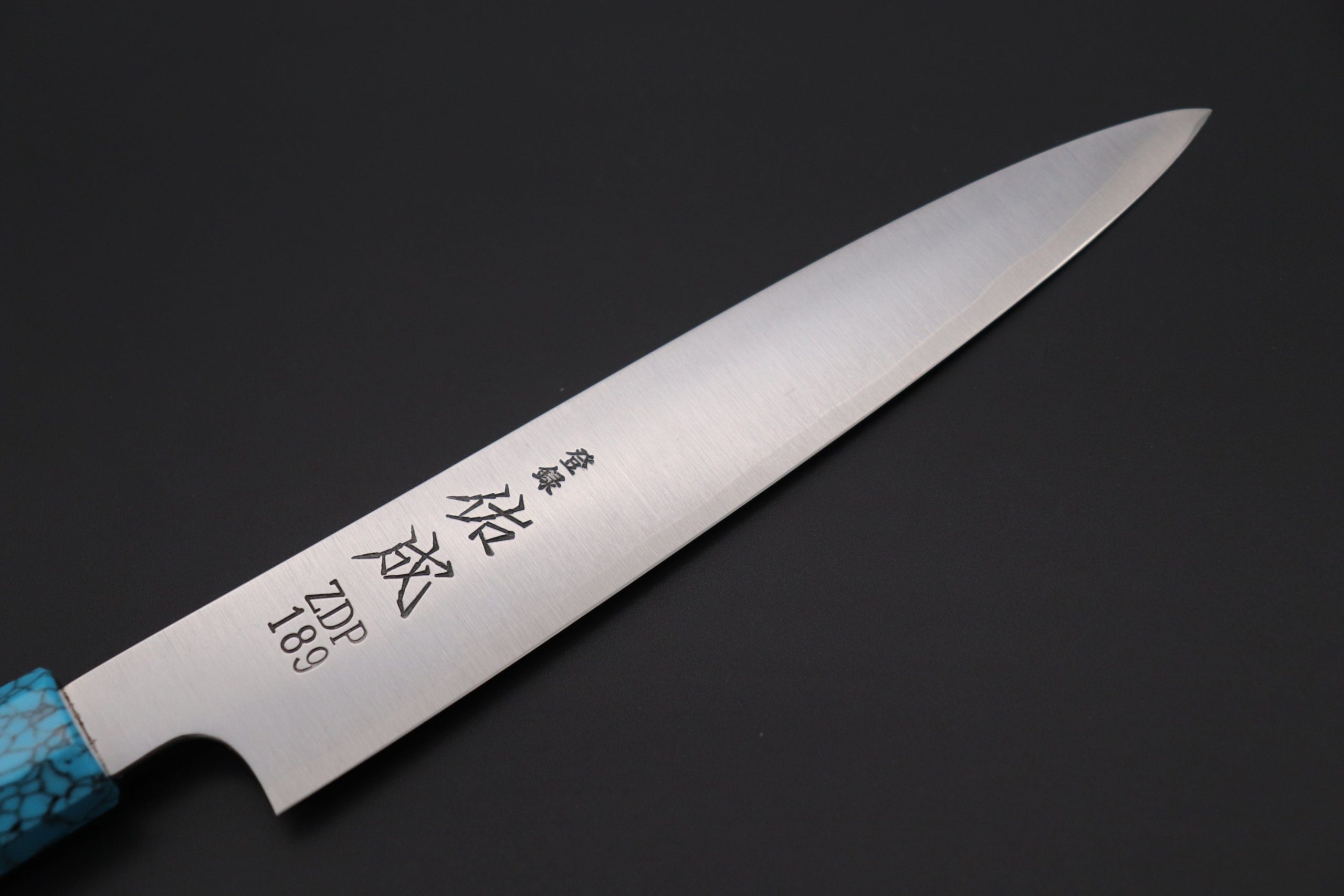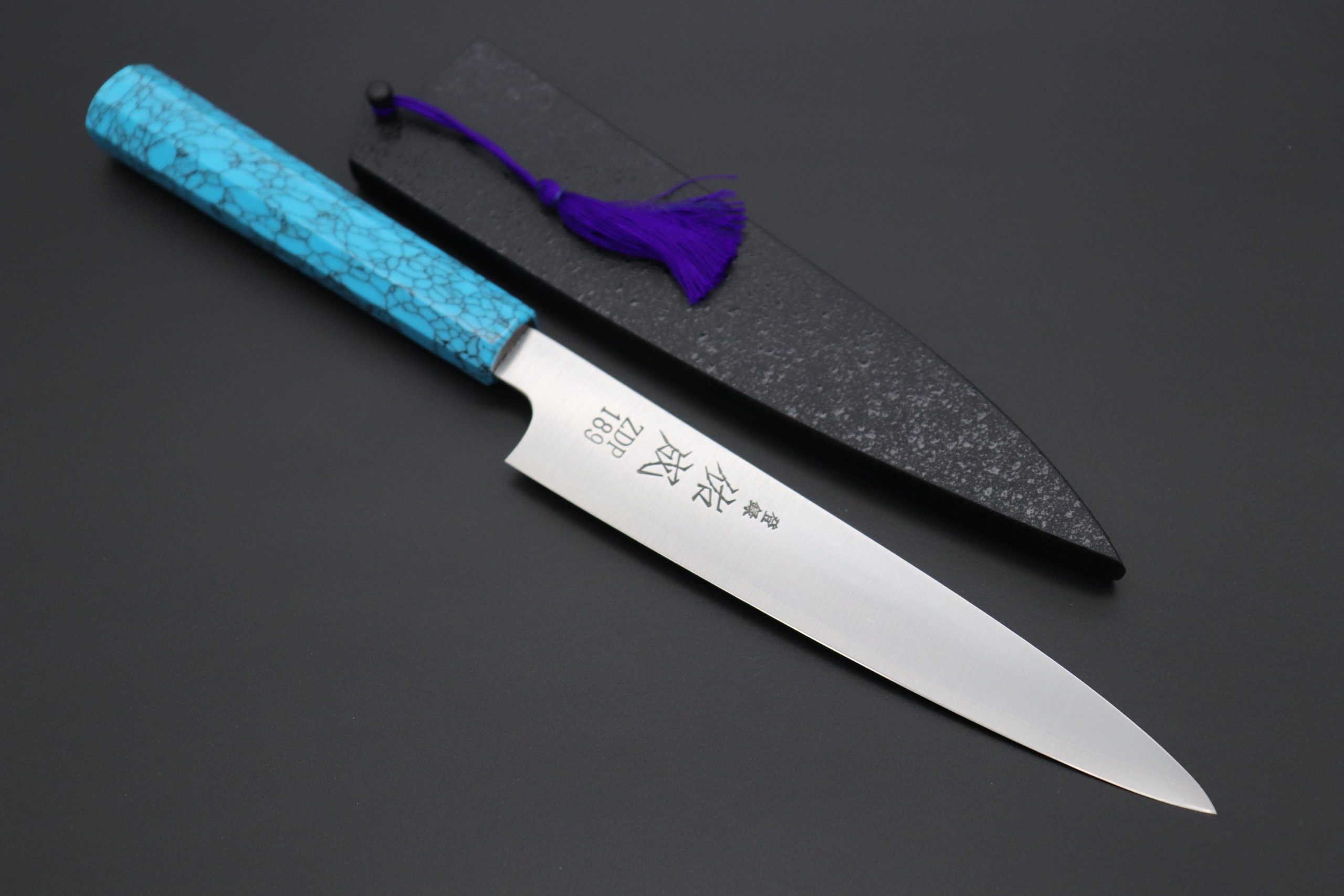 This Custom Limited Edition Sukenari ZDP-189 Clad Wa Petty knife is fitted with a Innovative Octagonal Turquoise Composite Stone Handle. A matching Black Lacquered wood Saya (Sheath) with a black pakkawood Saya pin is also included with the knife.