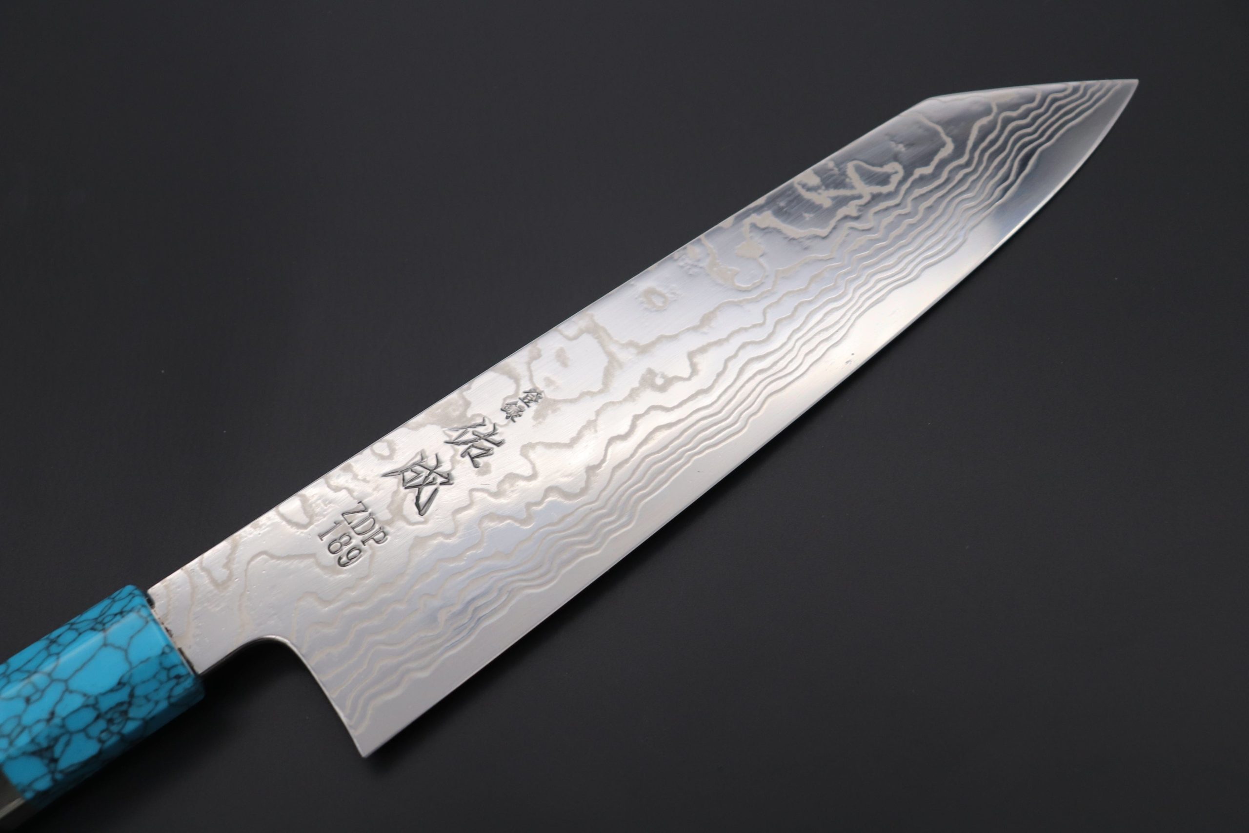 This Sukenari ZDP-189 Nickel Damascus knife is fitted with a Innovative Octagonal Ebonywood handle with a Turquoise Composite Stone Ferrule & Butt with Nickel Silver Spacers. For safekeeping, this knife comes with a matching Magnolia wood Saya (Sheath) with a black pakkawood Saya pin.