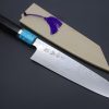 This Sukenari ZDP-189 Nickel Damascus knife is fitted with a Innovative Octagonal Desert Ironwood handle with a Turquoise Composite Stone Ferrule & Butt with Nickel Silver Spacers. For safekeeping, this knife comes with a matching Magnolia wood Saya (Sheath) with a black pakkawood Saya pin.