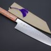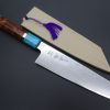 This Sukenari ZDP-189 Nickel Damascus knife is fitted with a Innovative Octagonal Desert Ironwood handle with a Black-Golden-Color-Turquoise Composite Stone Ferrule & Butt with Nickel Silver Spacers. For safekeeping, this knife comes with a matching Magnolia wood Saya (Sheath) with a black pakkawood Saya pin.