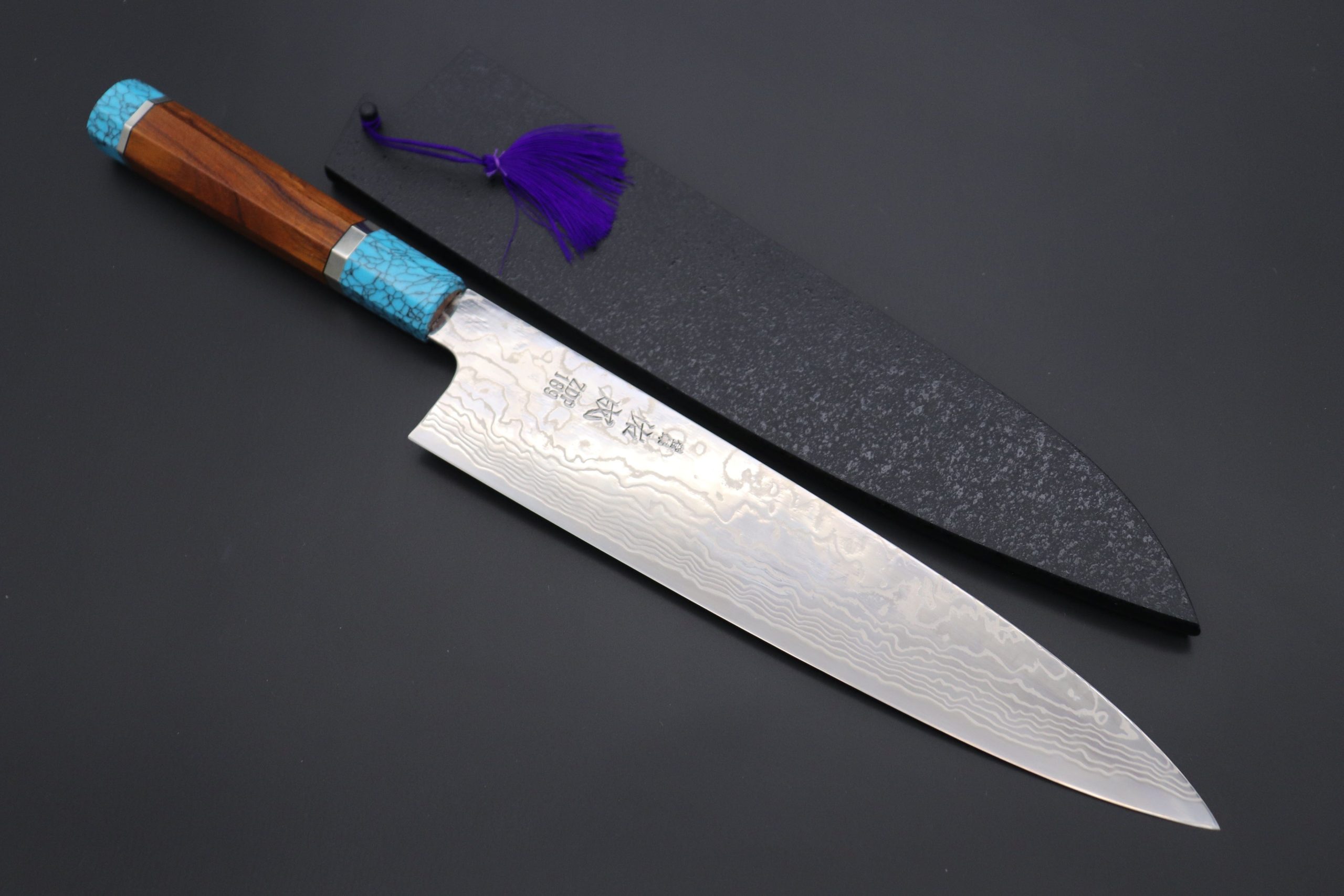 This Sukenari ZDP-189 Nickel Damascus knife is fitted with a Innovative Octagonal Desert Ironwood handle with a Turquoise Composite Stone Ferrule & Butt with Nickel Silver Spacers. For safekeeping, this knife comes with a matching Black Lacquered wood Saya (Sheath) with a black pakkawood Saya pin.